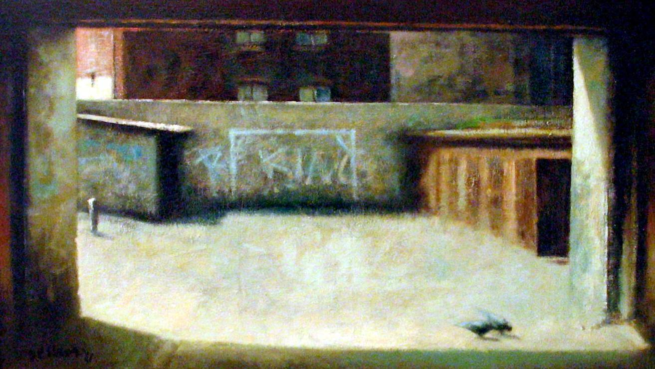 Obraz ukazuje szare podwórko otoczone wysokimi murami. Jasne i stonowane kolory dominują w kompozycji, nadając całości nostalgiczny klimat. Mur, pokryty lekko rozmytym graffiti, przywodzi na myśl wspomnienia z dzieciństwa. Patrząc na to miejsce, można poczuć się, jakby czas zatrzymał się na chwilę. Perspektywa „z okna” tworzy atmosferę izolacji, a jednocześnie tajemnicy. Wydaje się, że artysta zastosował technikę impresjonistycznego rozmycia, co dodaje miękkości całemu obrazowi. Emocje, jakie mogą wywoływać ten widok? Cóż, to może być smutek, ale i ciepło, jak przy powrocie do starych, bezpiecznych miejsc. A patrząc na ławkę, człowiek zastanawia się, ile rozmów i tajemnic kryje to podwórko. Moja siostra powiedziała, że wygląda jak miejsce, gdzie bawią się duchy. Ciekawość, nostalgia i odrobina magic vibes — to czujemy patrząc na ten obraz. Światło, choć subtelne, nadaje scenie poczucie spokoju i harmonii.