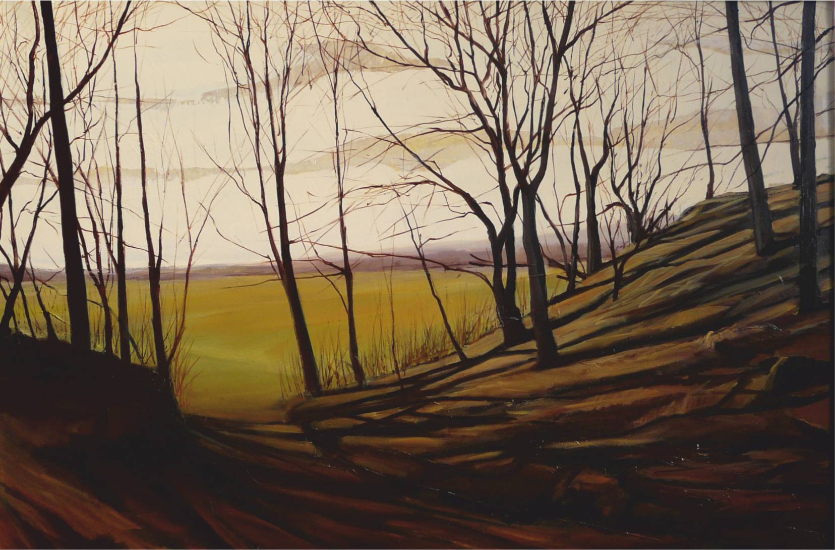 Obraz przedstawia zimowy krajobraz, gdzie delikatnie nagie drzewa rysują ciemne, smukłe linie na tle bladego nieba. Równina pokryta jest bladym kolorem zieleni zmieszanej z nutą brązu. Wszystko jest jakby uśpione, ciche, pełne spokoju. Słońce skrywa się gdzieś za horyzontem, nadając niebu złociste, pastelowe odcienie. Kompozycja jest wyważona, z drzewami tworzącymi naturalne ramy dla pustej przestrzeni w centrum. Artysta posługuje się techniką, która łączy realizm z pewnym niedopowiedzeniem. Pociągnięcia pędzla są subtelne, a barwy stonowane. Wow, te drzewa są wszędzie, mamo! Nastrój obrazu to mieszanka melancholii i łagodności. Może budzić w odbiorcy uczucie zadumy, ale też pewną nadzieję, że po zimie przyjdzie wiosna. It's peaceful. Technika oddaje surowość i prostotę natury, co sprawia że widz ma ochotę zamknąć oczy i przenieść się do tej pustyni ciszy. Zadziwia mnie, jak prosty krajobraz może tak wiele mówić o ludzkich emocjach.