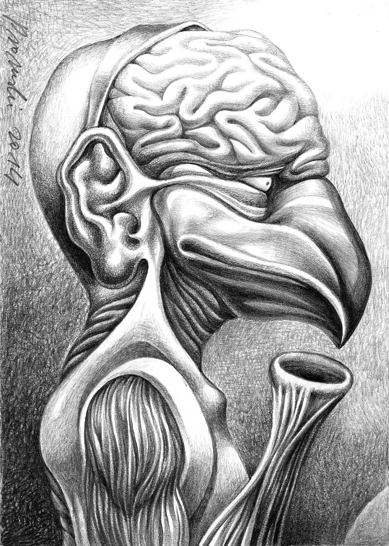 Obraz ukazuje niesamowitego stwora z mózgiem wystającym jak dziwaczna korona i rysami twarzy przypominającymi ptaka. Dominująca gra cieni i światła nadaje dziełu głębi oraz tajemniczej aury. Czarnobiałe tonacje wzmacniają ekspresję pracy, dodając dramatyzmu i pewnego surrealistycznego oniryzmu. Linie i kształty splatają się w misterną kompozycję, która zapiera dech w piersiach. Artysta zastosował technikę rysunku ołówkiem, co dodaje surowości i niemal naukowej analizy przedstawionemu stworzeniu. Atmosfera jest niepokojąca, mroczna, ale i fascynująca. Patrząc na to niezwykłe dzieło, można poczuć się jak w jakimś science-fiction filmie. Trochę creepy, ale mega intrygujące. Nasz wewnętrzny siedmiolatek stwierdziłby: "To chyba ptako-cyborg!" Wywołuje uczucie niepewności, zmusza do refleksji nad granicą między człowieczeństwem a naturą. Każdy szczegół zdaje się opowiadać swoją własną historię, jakbyśmy zaglądali do alternatywnego, niesamowitego świata. To dzieło po prostu krzyczy: "Explore me!"