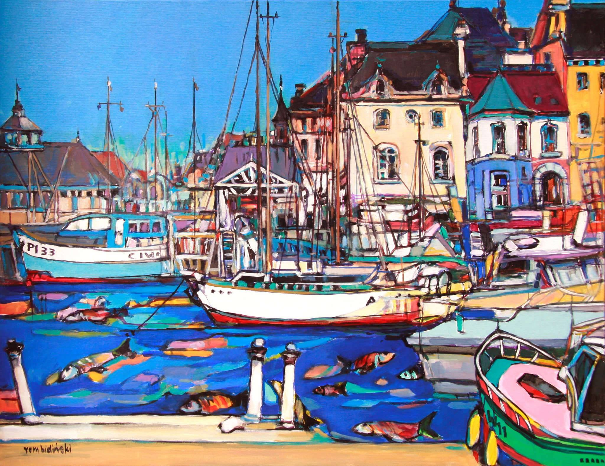 Port powoli budzi się do życia, ryby nie czekają, kąpią się już w pierwszych przebłyskach porannego słońca. Duży, efektowny obraz wykonany klasyczną techniką malarską przy użyciu farb olejnych i akrylowych, na płótnie o wymiarach 70 na 90 centymetrów.
