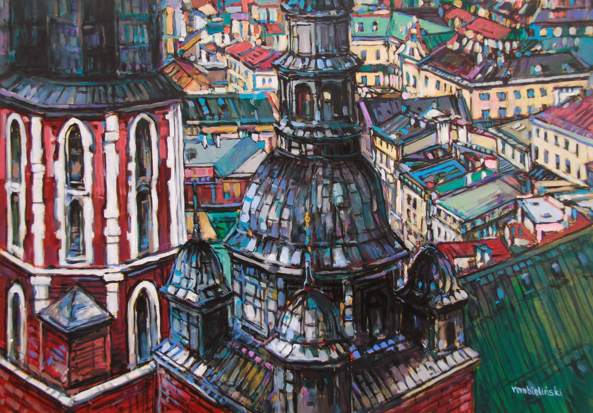 Kraków z lotu ptaka, olej akryl na płótnie o wymiarach 70 x 100 centymetrów.