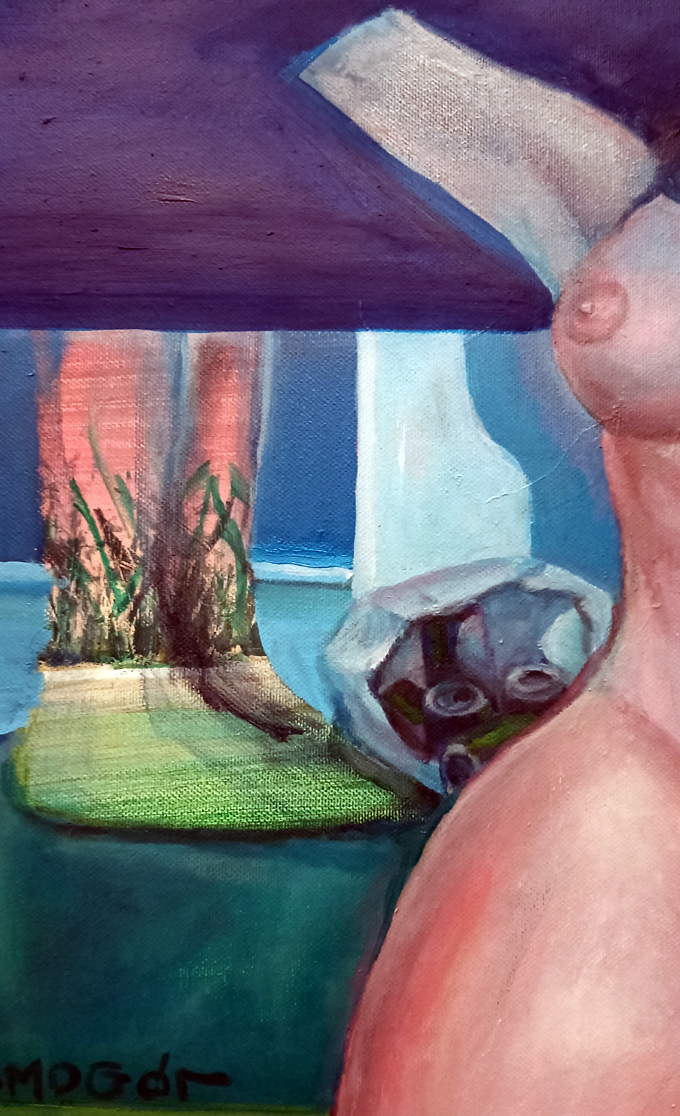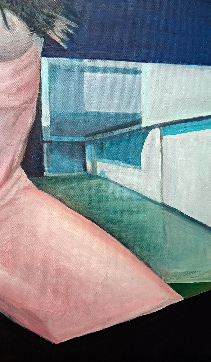 Obraz, którego opis mam zaszczyt przedstawić, to niezwykłe połączenie koloru i formy, które przyciąga wzrok od pierwszego spojrzenia. Dominują tutaj głębokie błękity i zielenie, tworząc kontrast z subtelną, różową skórą centralnej postaci. Jej brak głowy dodaje aurę tajemniczości i niepokoju, zmuszając do refleksji nad znaczeniem całości. Na pierwszy rzut oka widać nowoczesne, geometryczne kształty, które przywodzą na myśl architektoniczne struktury lub futurystyczną scenografię. Atmosfera obrazu jest pełna napięcia i enigmy. Technika użyta przez artystę łączy dokładne pociągnięcia pędzla z intensywną grą kolorów. Czerwony owal na dole przyciąga uwagę, może symbolizując emocjonalne centrum całej kompozycji. Obraz może wywołać wiele różnych emocji – od zdziwienia po pewnego rodzaju melancholii. Fascynujący przykład jak nieoczywista kompozycja może mówić wiele, dając jednocześnie przestrzeń do refleksji i interpretacji.
