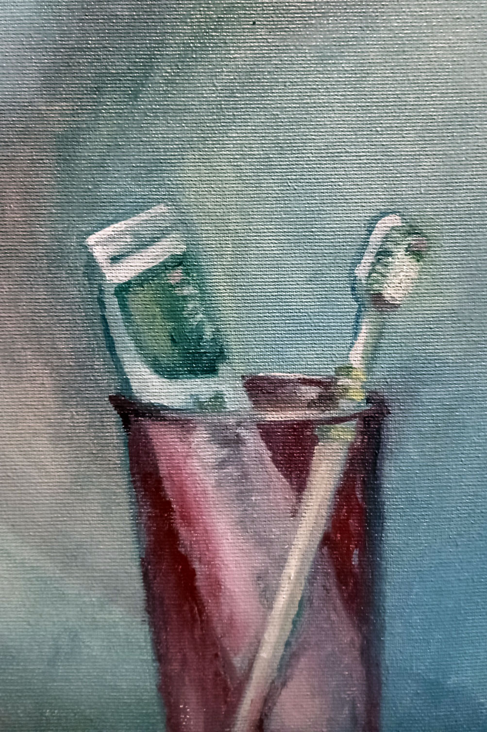 Praca przedstawia fragment ludzkiego ciała, uchwycony w intymnym i nieco abstrakcyjnym ujęciu. Dominują pastelowe odcienie beżu i zieleni, tworząc harmonijną i spokojną kompozycję. Ciało, przedstawione pod nietypowym kątem, jest pełne subtelnych przejść kolorystycznych, nadając mu eteryczny wygląd. Styl dzieła zdaje się być impresjonistyczny, z delikatnymi pociągnięciami pędzla i miękkimi krawędziami. Przyciąga wzrok kubek z szczoteczką i pastą do zębów, wprowadza one element codzienności i kontrastu, dodając ironiczny akcent do całej sceny. Delikatne pociągnięcia pędzla przypominają szept, który subtelnie prowadzi przez wszystkie emocje i myśli, jakie nasuwają się podczas oglądania. Obraz z serii body, tym razem z użyciem bandażu, który na żywo jest nieco mniej widoczny niż na zdjęciu, partie białe zamalowano farbą akrylową. Praca ma zamalowane boki tak, jakby to była kontynuacja obrazu.