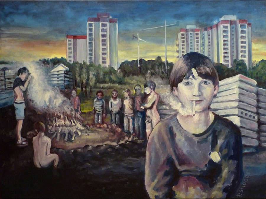 praca olejna na płótnie 60 x 80 cm, wcześniejsza podmalówka akrylem, obraz bez ram, boki zamalowane jako kontynuacja obrazu. Nie pamiętam, żadnych zdjęć z okresu swojego dzieciństwa na terenie budowy z wielkiej płyty lat 80-tych, dlatego postanowiłem to namalować, trochę jest w tym mitologizacji, trochę skrajnej konfabulacji i przesady.