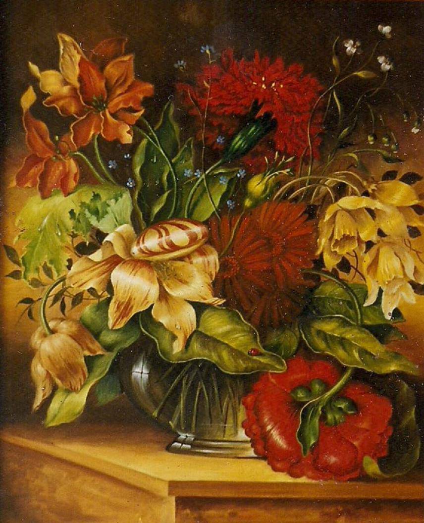 Na obrazie widzimy przepiękny bukiet kwiatów, pełen ciepłych, jesiennych kolorów. Dominują tu odcienie czerwieni, pomarańczu i złota, które harmonijnie ze sobą współgrają. Wszystko to zanurzone w miękkiej, brunatnej tonacji tła, która dodaje kompozycji głębi. Kwiaty zdają się niemal wylewać z wazonu, tworząc dynamiczny ruch. Obraz oddaje nastrój jesiennej melancholii, lecz jednocześnie tchnie życiem. Artysta posłużył się techniką malarstwa olejnego, co widać w subtelnych przejściach kolorów i bogactwie faktur. Kwiaty wyglądają tak realistycznie, że można niemal poczuć ich delikatny zapach. Pozornie chaotyczna kompozycja kryje w sobie doskonale zrównoważoną grę światła i cienia. To dzieło może wywołać u odbiorcy zadumę nad przemijającym czasem, ale również poczucie ciepła i domowego comfortu. Obraz może wywołać uścisk w sercu, przywodząc na myśl wspomnienia z dzieciństwa, kiedy babcia szykowała bukiety. Czasem obrazy mówią więcej niż słowa. It's beautiful! Dla siedmiolatka to po prostu ładne kwiatki w wazonie. A dla mnie? To zastrzyk nostalgii i estetycznej przyjemności.