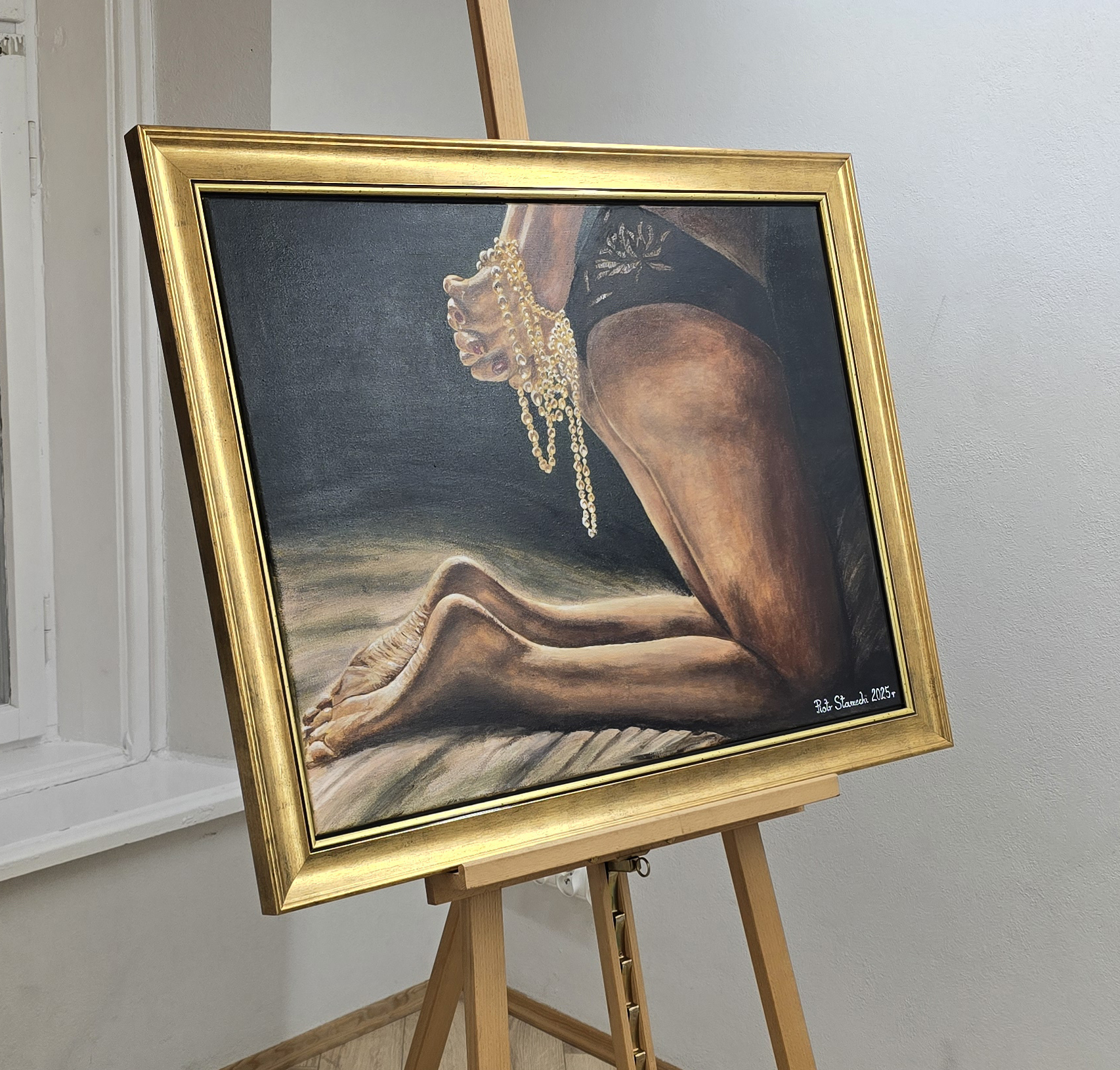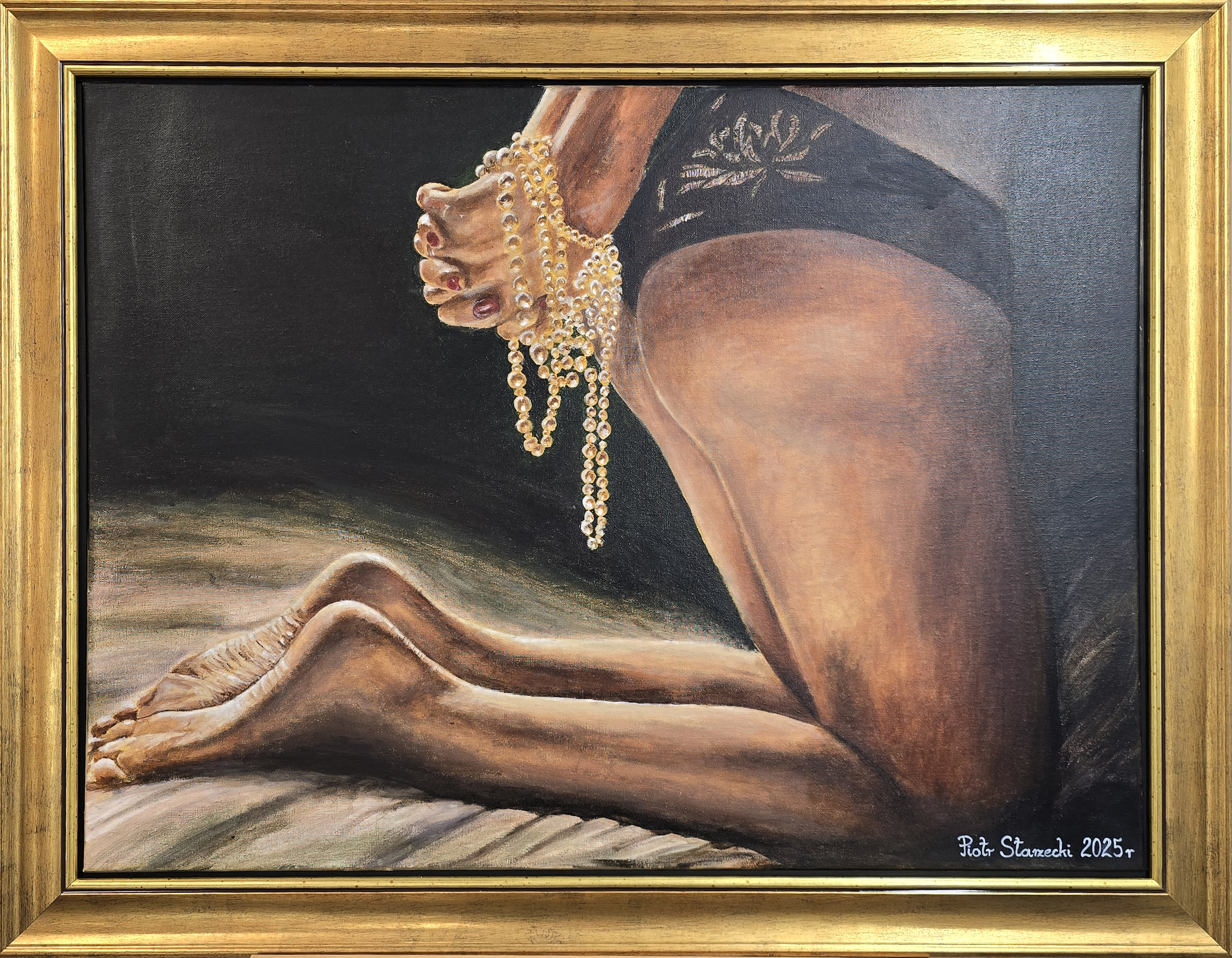 Druga odsłona autorskiego cyklu aktów. Realistyczne studium ciała wzbogacone o silny element fakturalny – sznur pereł, który wprowadza do kompozycji rytm i blask. Praca operuje głębokim cieniem, z którego wyłania się rzeźbiarska forma anatomii. Oprawiony w klasyczną, szeroką złotą ramę, co podkreśla luksusowy charakter dzieła. Do pracy dołączony jest odręcznie podpisany przez artystę Certyfikat Autentyczności, potwierdzający unikatowość i pochodzenie dzieła.