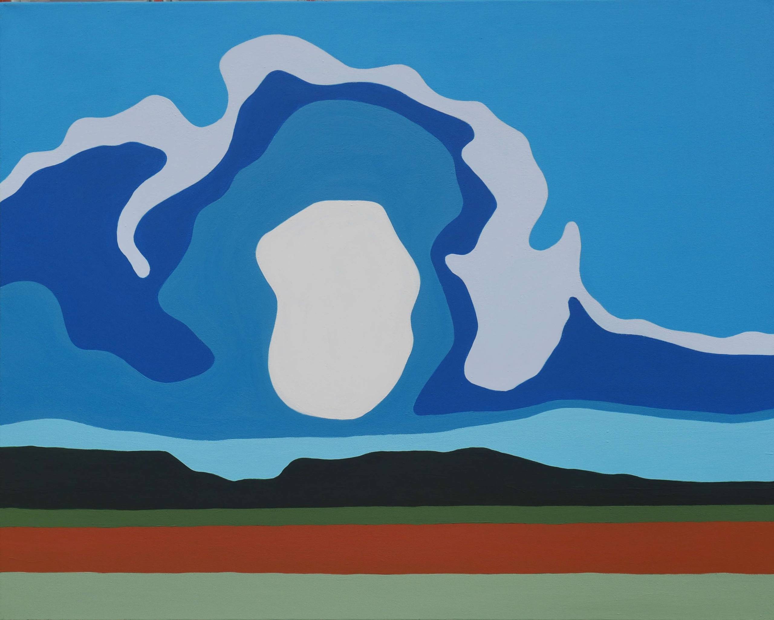 Patrząc na obraz, od razu w oczy rzucają się intensywne, kontrastujące kolory. Błękity nieba przechodzą gładko w ciemniejsze odcienie, a biel w centrum przypomina nieco kształtem zagadkowy obiekt – może to chmura, może fragment innej rzeczywistości. U dołu obrazu rozciąga się pas krajobrazu w odcieniach zieleni i czerwieni, zestawiony niemal jakby przypadkowo. Całość tworzy kompozycję harmonijną, a jednocześnie nieco surrealistyczną. Trochę jakby artysta bawił się koncepcją “dreamscape”. Atmosfera obrazu jest spokojna, ale z nutą tajemniczości. Czy to pejzaż po zmroku, czy próba uchwycenia jakiegoś magicznego momentu na niebie? Istnieje tu coś z new reality, coś co przyciąga wzrok i pozostawia pytania. Styl artysty jest wyraźnie zainspirowany abstrakcjonizmem i geometryzacją form. Grube kontury i wyraźne płaszczyzny kolorystyczne tworzą swego rodzaju mozaikę emocji i wyobraźni. Technika użyta w tym dziele przywodzi na myśl prace modernistów, gdzie uproszczona forma nabiera nowych sensów. Obraz może wywoływać u odbiorcy poczucie zafascynowania, odkrywania czegoś nowego. Może sugerować podróż mentalną, gdzie chmury i kolory stają się bramą do innego świata. A może, dla dziecka, to po prostu wielka smaczna pianka na gorącym kakao w zimowy dzień. A Ty, co widzisz w tej magii kolorów?