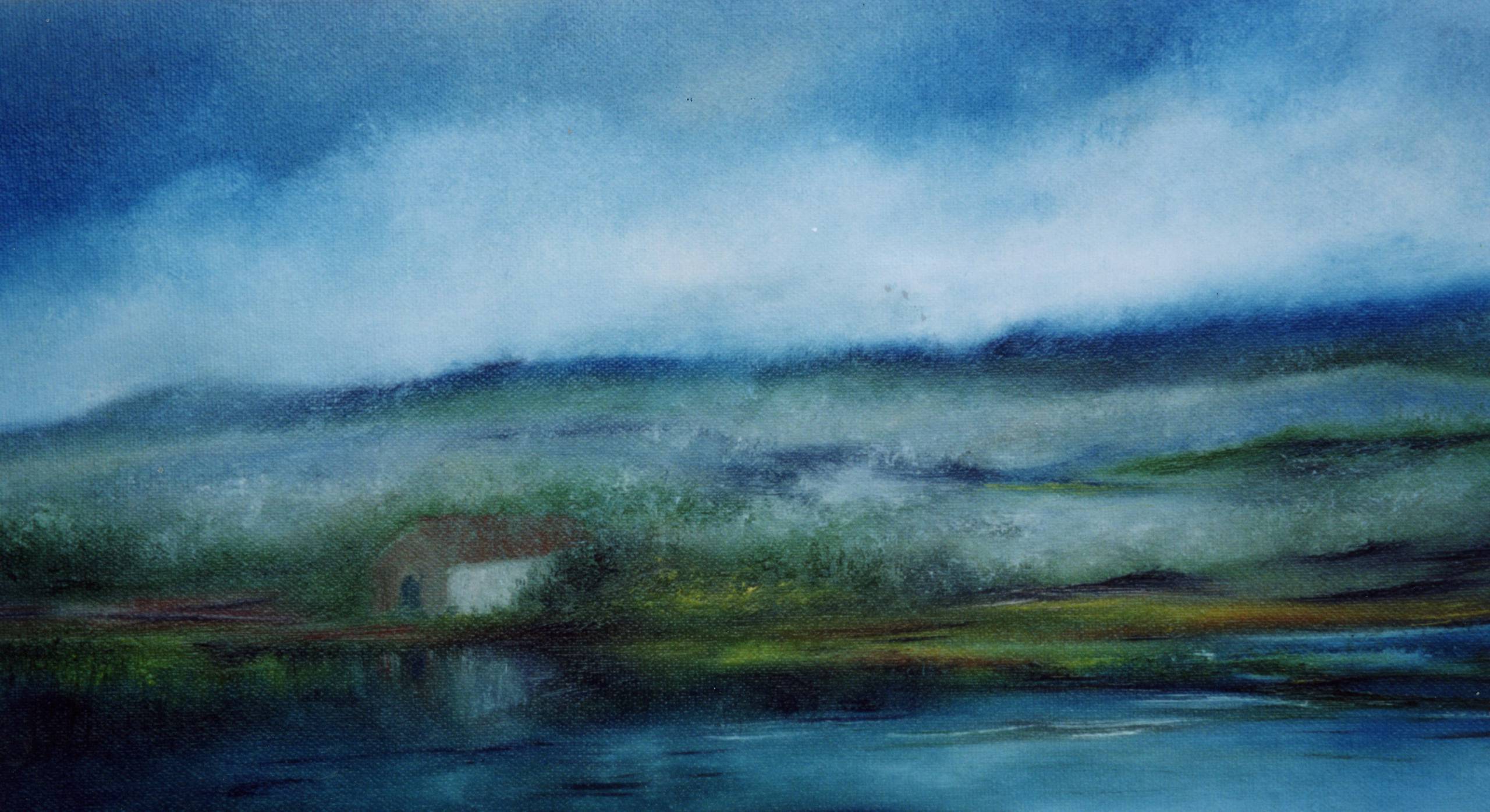Obraz przedstawia spokojną, eteryczną scenerię pełną mgły i tajemniczości. Dominuje tu paleta chłodnych, stonowanych barw. Niebiesko-zielone pastele łagodnie płyną wzdłuż powierzchni, tworząc marzycielską atmosferę. W oddali widać niewielką chatkę, ledwie widoczną wśród gęstej mgły. Jej obecność dodaje nuty nostalgii i spokoju. Kompozycja jest wyważona, a miękkie pociągnięcia pędzla przydają delikatności. Obraz emanuje ciszą, jakby czas się zatrzymał na chwilę. Owiewa go nostalgia, która może przywołać wspomnienia letnich poranków nad jeziorem. To uczucie, jakbyś chciał być tam na zawsze, w tym spokojnym zakątku świata. Artyściowa technika to subtelne, niemal impresjonistyczne podejście, gdzie szczegóły znikają na rzecz emocji… Patrząc na to dzieło, czuję się jak w magic dreamland. Odbiorca może doświadczyć spokojnej refleksji, zatopić się w myślach czy po prostu podziwiać piękno chwili uchwyconej na płótnie. To obraz, który mówi: “Zatrzymaj się, popatrz, poczuj”. Dziecko powiedziałoby: “Niebo wygląda jak chmura w moim rożku lodów!”. Ten obraz to ułamek magii, który każdemu przyniesie inną opowieść, inną emocję.