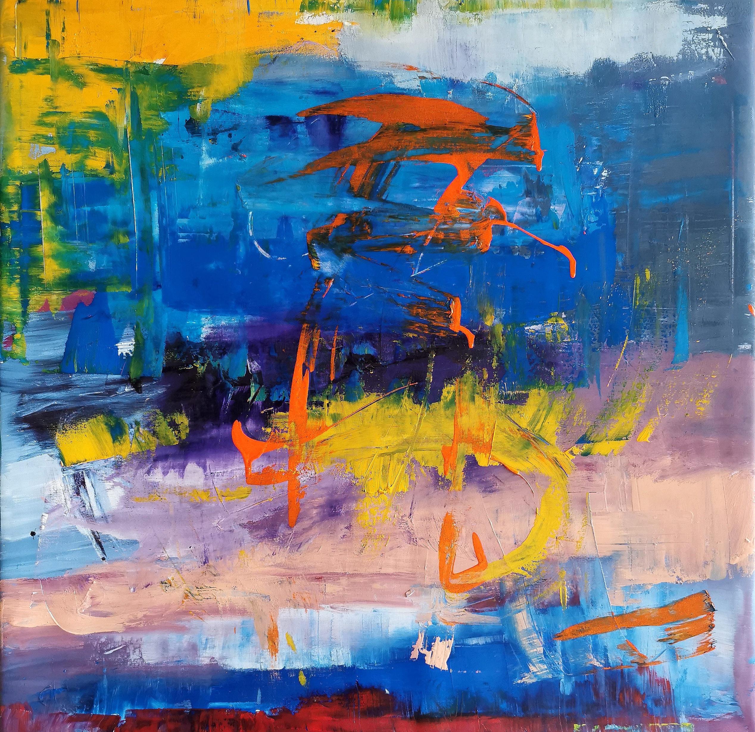 Obraz tętni życiem i intensywnością kolorów. Dominują tu głębokie odcienie niebieskiego, które tworzą tło niczym ocean w burzliwą noc. Przełamane są energicznymi plamami pomarańczowego i żółtego, przypominającymi płomienie tańczące na wietrze. Kompozycja jest dynamiczna i pełna ruchu, z widoczymi gestami artysty, który jakby próbował uchwycić chwilę chaosu na płótnie. Atmosfera dzieła jest jednocześnie niespokojna i inspirująca, wywołująca mieszankę emocji od zachwytu po niepewność. Styl artystyczny można określić jako abstrakcyjny ekspresjonizm – wolność formy, swoboda pociągnięć pędzla, spontaniczność. Technika ta sprawia, że patrząc na obraz, odbiorca czuje się jakby uczestniczył w procesie twórczym, niemal słysząc dźwięk pociągnięć pędzla. To trochę jak "Wow, jak tu kolorowo!" Emocje, które wywołuje obraz, są różnorodne. Dla jednych to eksplozja radości i wolności, dla innych burza myśli i refleksji. Czy to przypadkiem nie przypomina chaosu, w którym odnajdujemy własne miejsce? Ten obraz to prawdziwy "journey" w świat wyobraźni, gdzie wszystko jest możliwe. Czuć tu pewną surową energię, która przynosi ze sobą zarówno piękno, jak i pewien nieokiełznany niepokój. Fascynujące i zaskakujące, prawda?