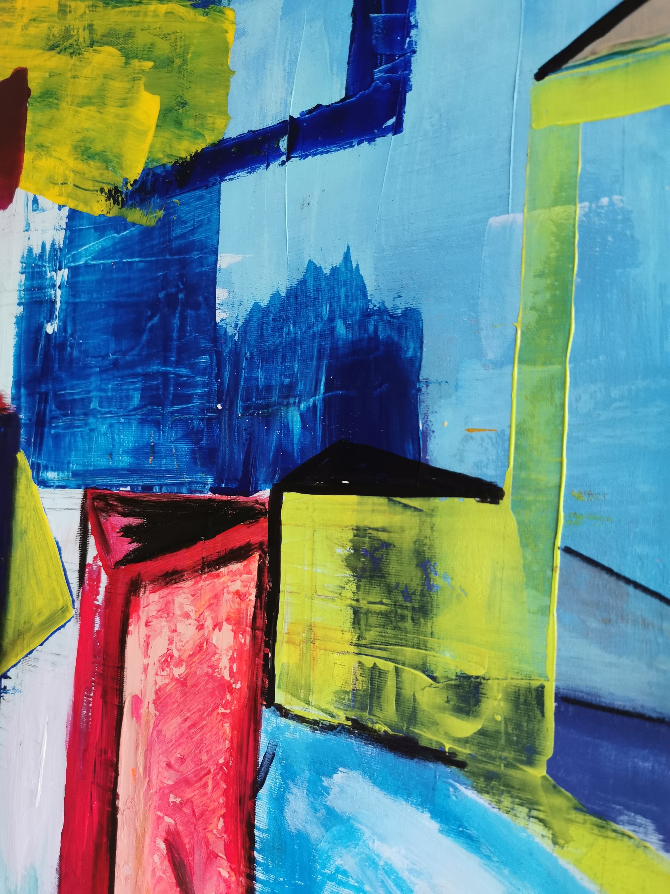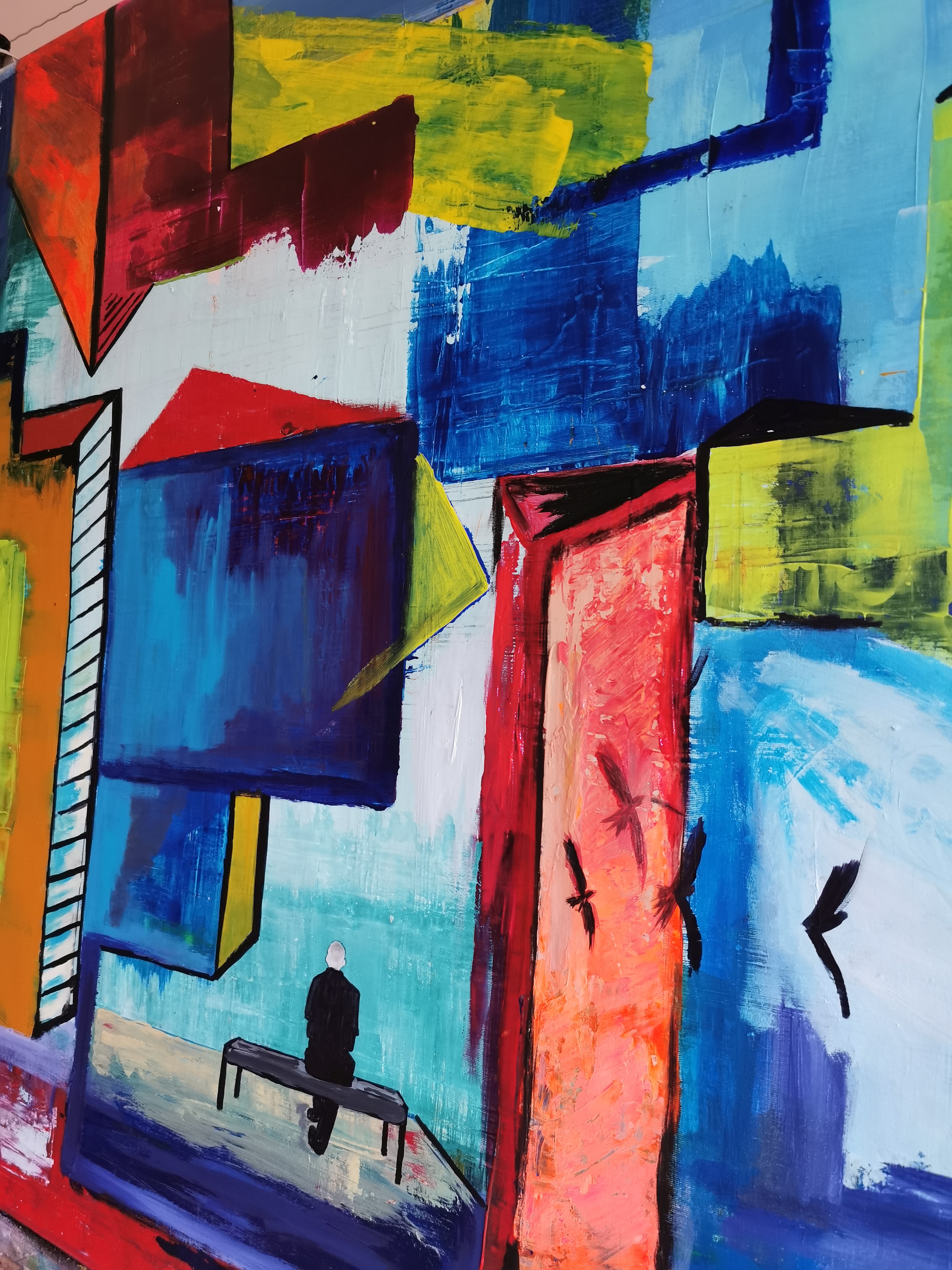 Obraz jest prawdziwą feerią kolorów. Wyobraź sobie eksplozję błękitów, czerwieni i żółci, które układają się w geometryczne formy, przypominające abstrakcyjne budowle. Dominuje chłodny błękit, który wprowadza nastrój swego rodzaju spokoju, ale intensywna czerwień i żółty dodają energii i dynamizmu. Kompozycja jest nieco chaotyczna, jakby artysta próbował uchwycić miejską dżunglę w jednym kadrze. Siedząca postać na ławce, choć malutka, przyciąga wzrok jak magnes. Daje to uczucie samotności w wielkim mieście, które często można odnaleźć w codziennym życiu.