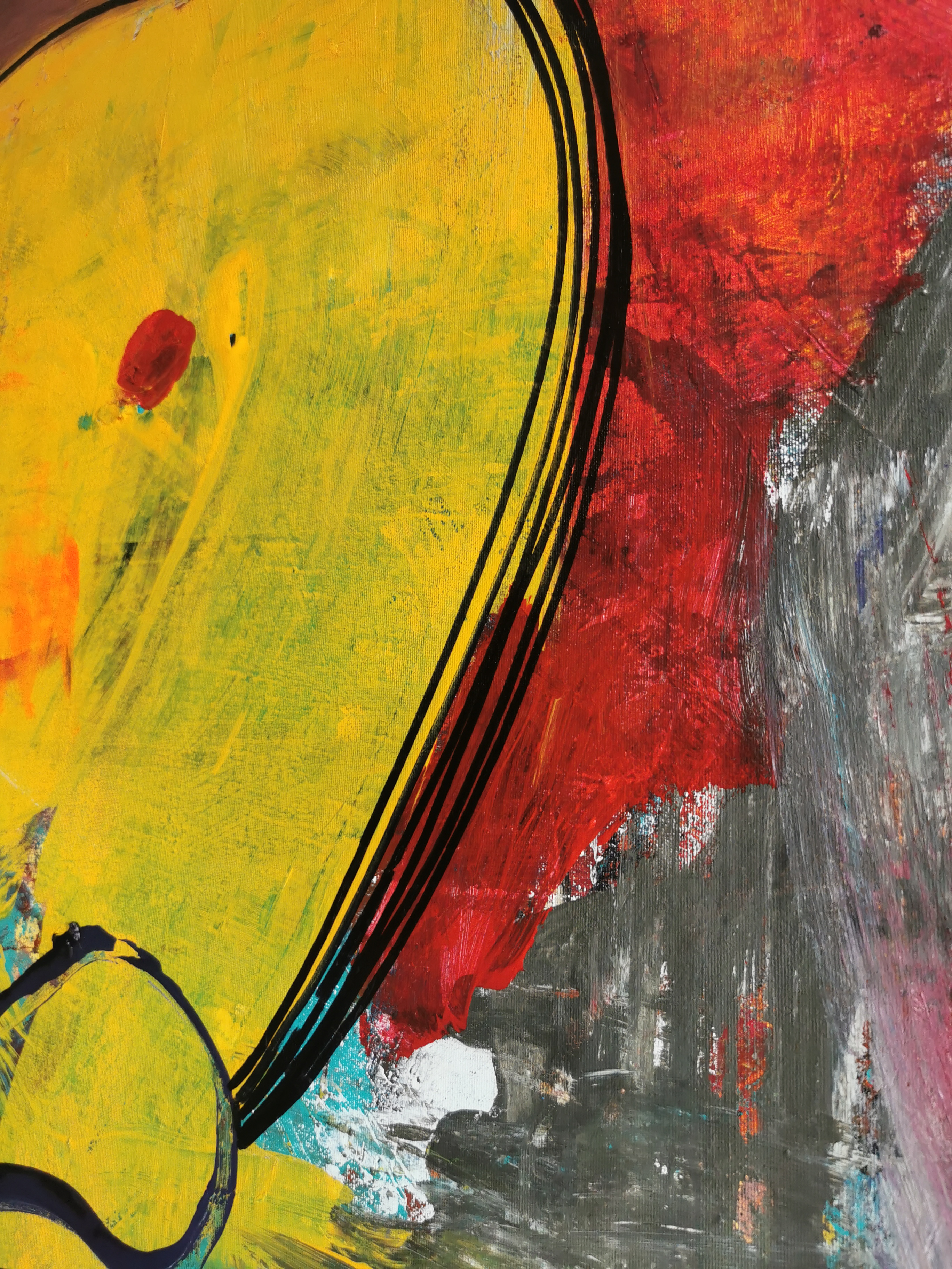 Obraz jest pełen jaskrawych barw, które na pierwszy rzut oka wydają się chaotyczne, ale po chwili dostrzegasz ich harmoniczne połączenie. Dominuje intensywny żółty, czerwony, niebieski i turkusowy. Kompozycja jest dynamiczna, a abstrakcyjne kształty wciągają oko w labirynt emocji. Kształty przypominają nieco dziecięce rysunki, proste i sugestywne.