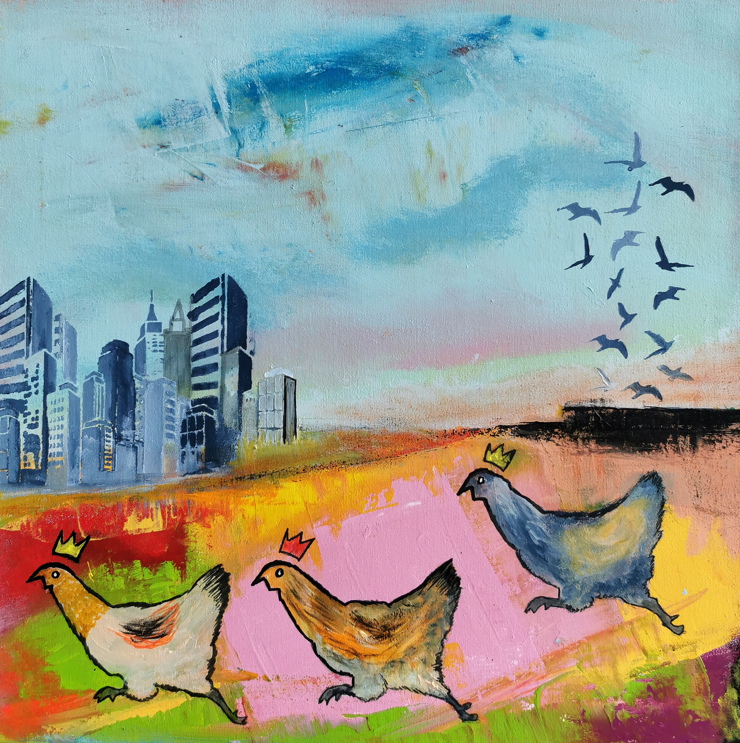 Atmosfera obrazu jest lekka i pełna nadziei, co potęguje jasne, błękitne niebo z delikatnymi, różowymi akcentami o wschodzie lub zachodzie słońca. Stado ptaków odlatujących w górę, w prawym górnym rogu, symbolizuje wolność, ucieczkę i dążenie do nowych celów. Kontrast między prostotą kur a złożonością miejskiego krajobrazu skłania do refleksji nad tym, co w życiu jest najważniejsze – czy to powrót do natury, czy dążenie do miejskiego zgiełku i możliwości. To dzieło emanuje pozytywną energią i zachęca do podążania własną ścieżką.