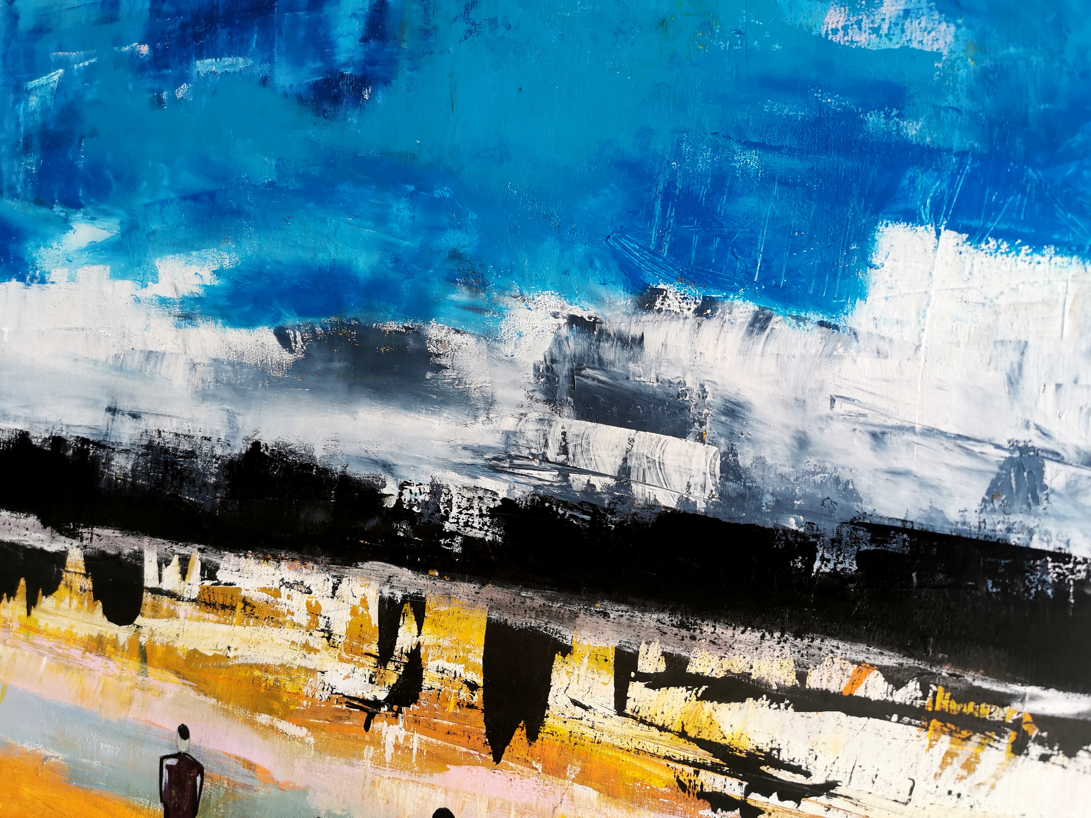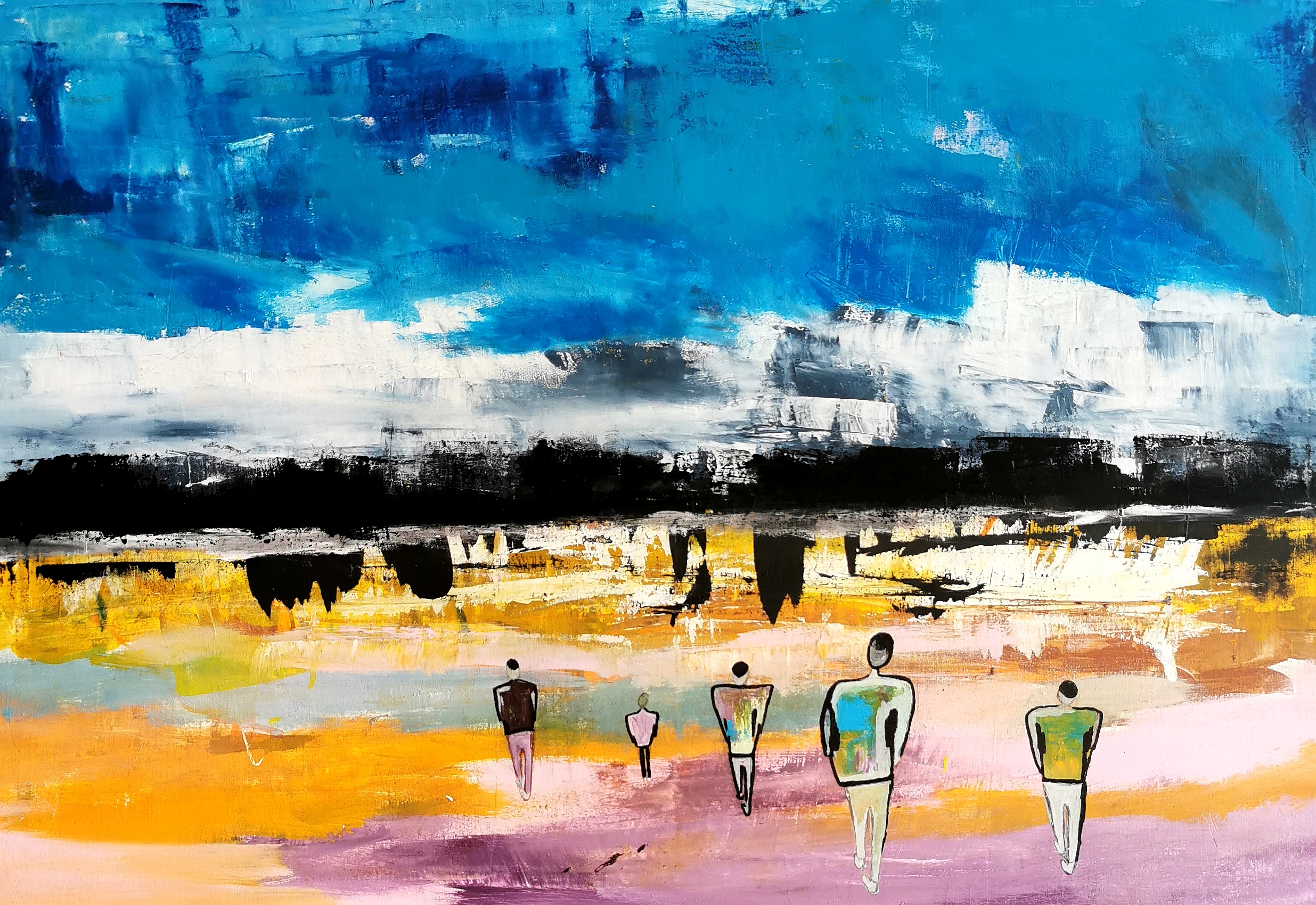 Obraz to szerokie pasy koloru ułożone jak horyzonty. U góry gęsty błękit i turkus. miejscami przetarty, z chropowatą fakturą i smugami pędzla, jakby farba była rozcierana szpachlą. Niżej wchodzi mleczna biel i szarość, a potem ciężki czarny pas, co robi mocne cięcie kompozycji. Na dole rozlane żółcie, pomarańcze i różowy fiolet, trochę jak piasek i zachód słońca. W tej plamiastej przestrzeni stoi pięć uproszczonych postaci, cienkie sylwetki, bez twarzy, idą przed siebie. Dziecięce zdanie. Oni idą na spacer. Nastrój jest spokojny, ale taki niepewny, bo czerń wygląda jak mur. Styl abstrakcyjny z figuracją, gest, drapania, warstwy, i to całe rough tło. Czuję tu samotnośc i ciekawość, jakby każdy szukał swojego miejsca i troche się boi.
