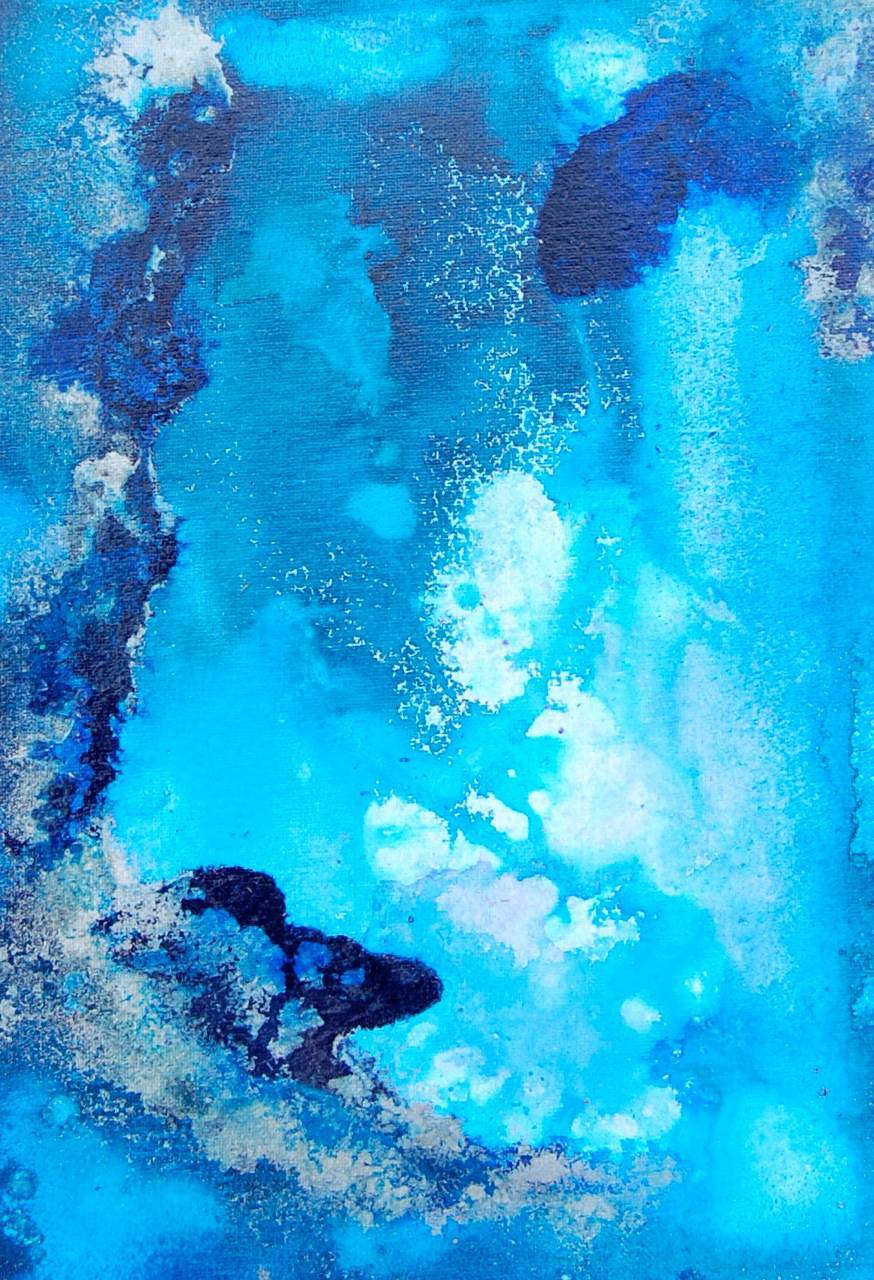To fascynujące dzieło sztuki zanurza nas w świecie pełnym błękitu. Obraz jest jak ocean nasycony różnymi odcieniami niebieskiego, od intensywnego lazuru po delikatny turkus. Kompozycja przypomina abstrakcyjny pejzaż, jakbyśmy patrzyli na powierzchnię planety z lotu ptaka. Wyraźnie widać plamy, zacieki i gradienty, co wskazuje na użycie technik akwarelowych lub farb wodnych. Artysta bawi się teksturą i kolorem, tworząc efekt głębi i ruchu, który przyciąga wzrok. Nastrój obrazu jest spokojny, ale jednocześnie niepokojący. Jest w tym coś tajemniczego i nieprzewidywalnego, jakbyśmy mieli zanurzyć się w nieznane. Dla mnie osobiście, to jak patrzenie w otchłań, która może być równie dobrze piękna, co niebezpieczna. Obraz wzbudza refleksje nad nieskończonością i pięknem natury. To takie cool, że czuje się, jakby zanurzał się w oceanie. Patrząc na ten obraz, można poczuć wewnętrzny spokój, ale także subtelny dreszczyk emocji. To trochę jak oglądanie burzy nad morzem z bezpiecznego miejsca. Artystą kieruje swobodna ekspresja, którą przekazuje za pomocą prostych, ale sugestywnych środków. Obraz ożywia wyobraźnię i prowokuje do twórczych interpretacji. Czy to jest woda, niebo, a może coś zupełnie innego? To już zależy od was.