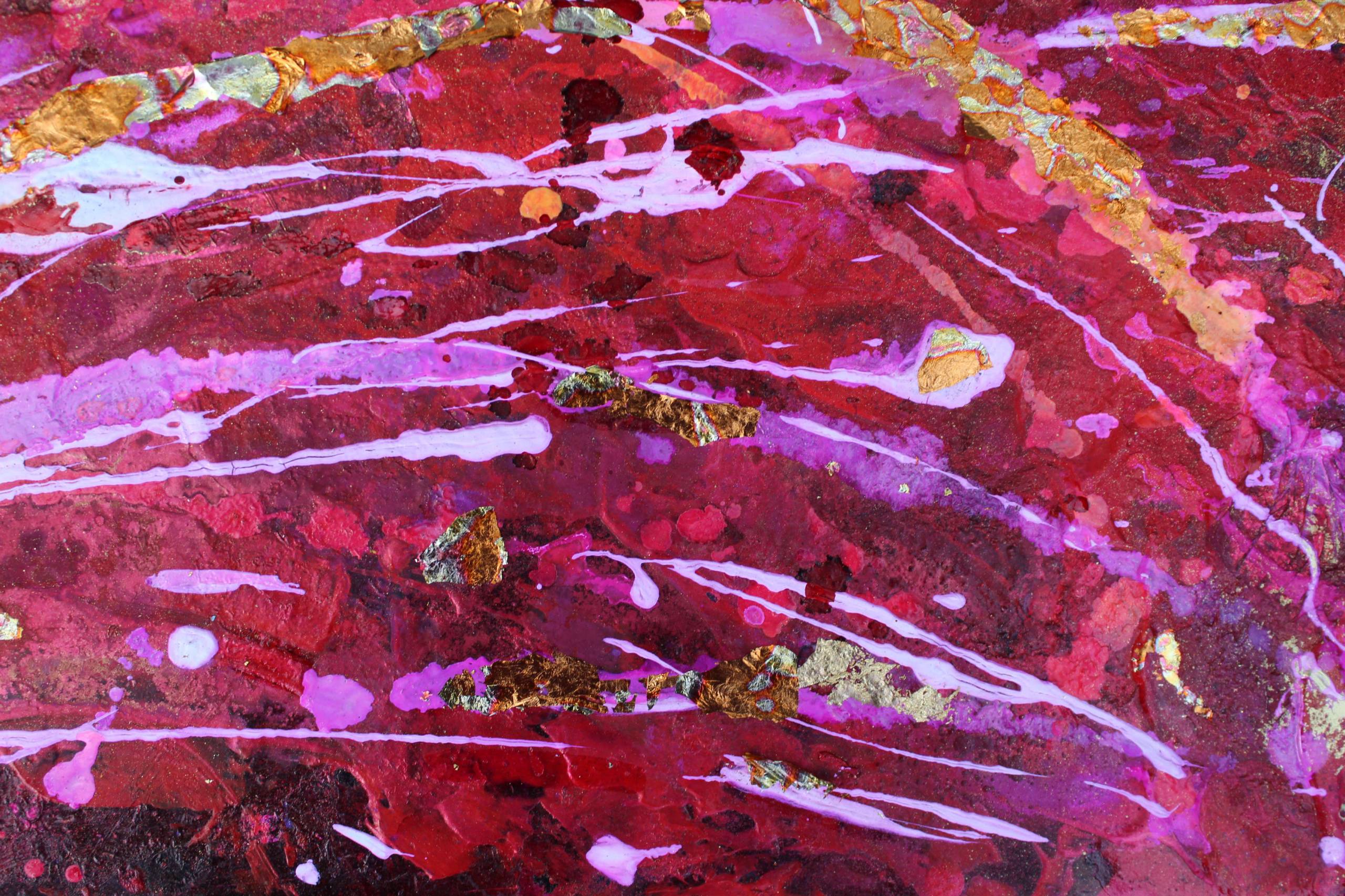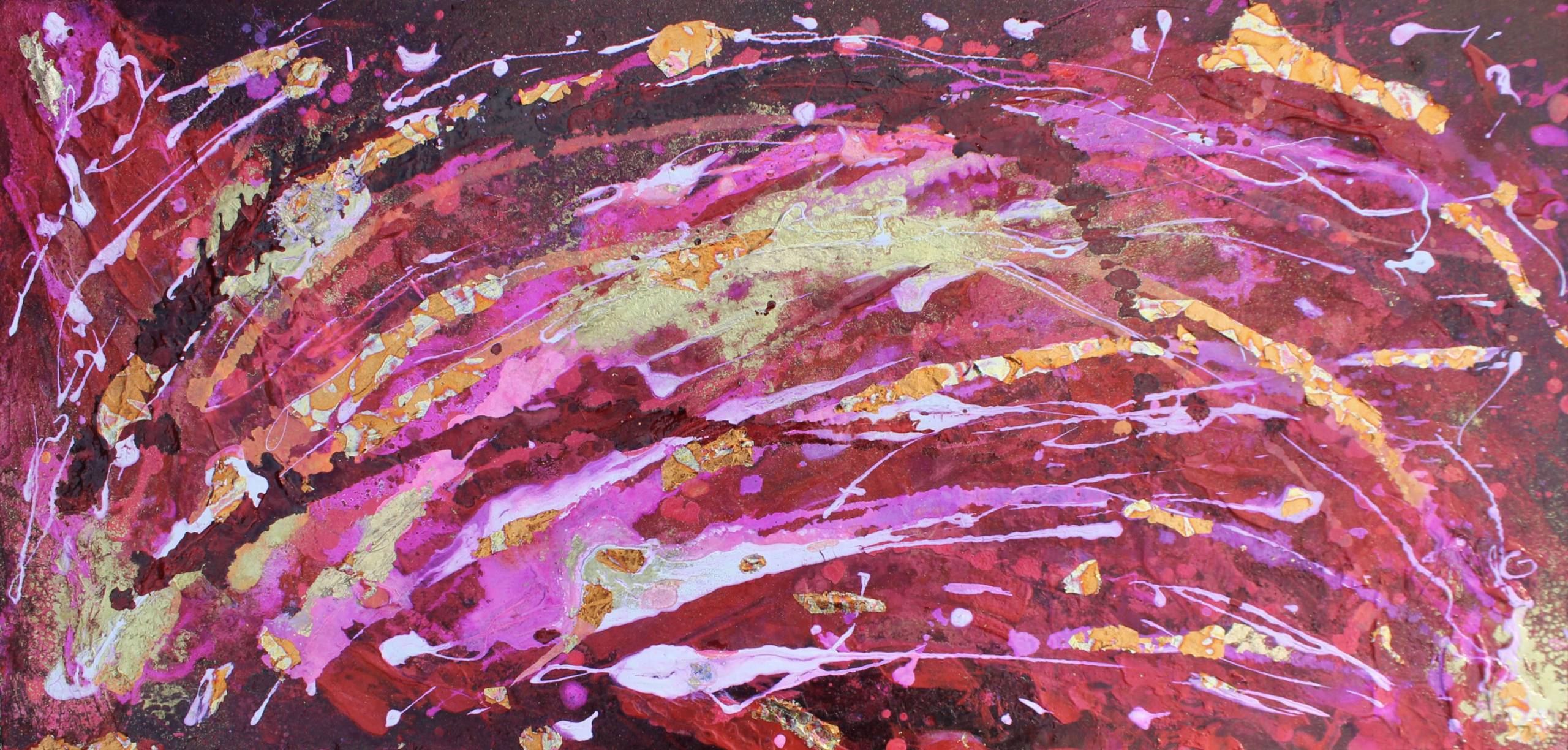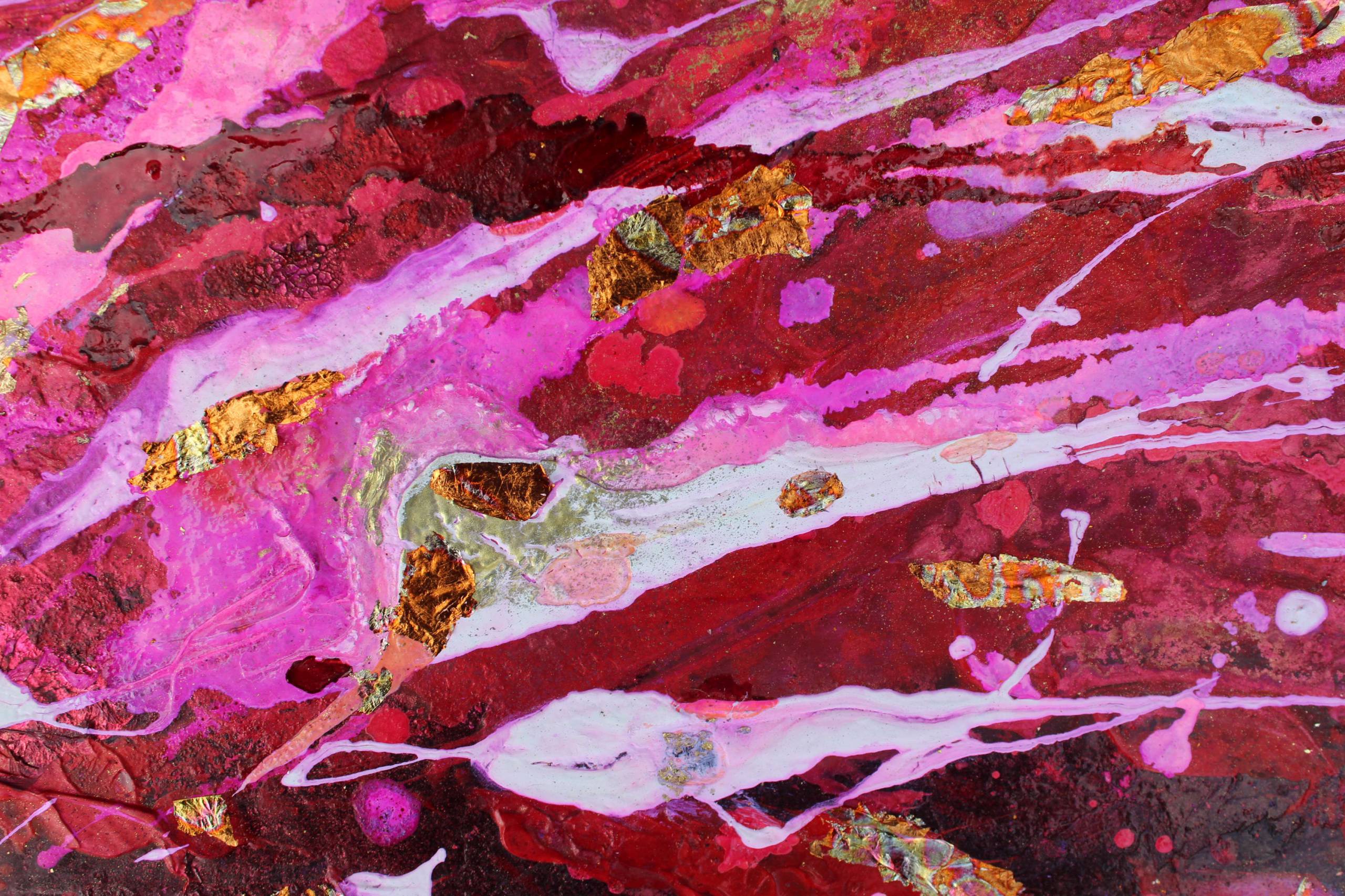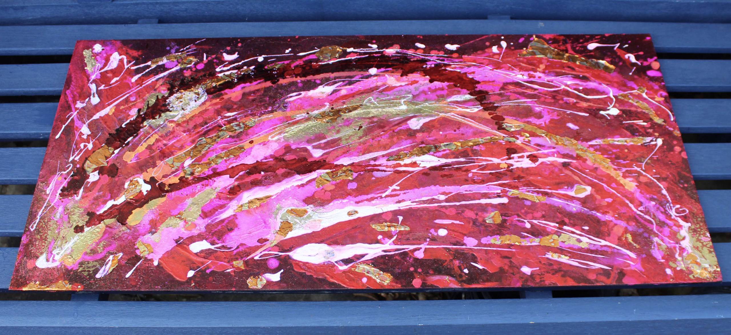 Innovative use of mixed media has been used to create this unique textural abstract. Showcasing luminescent gold highlights and shimmering jewel colours. Painted onto board, ready to be framed. Alternatively it can be hung unframed with the use of "Command" velcro strips. Signed on the reverse. Please note, the interior image is not precisely to scale. This would make an ideal gift, and if desired, the artist is happy to provide a personalised calligraphic note detailng the artwork.