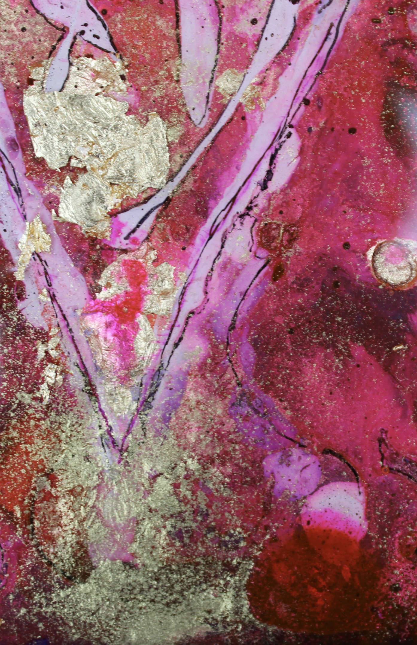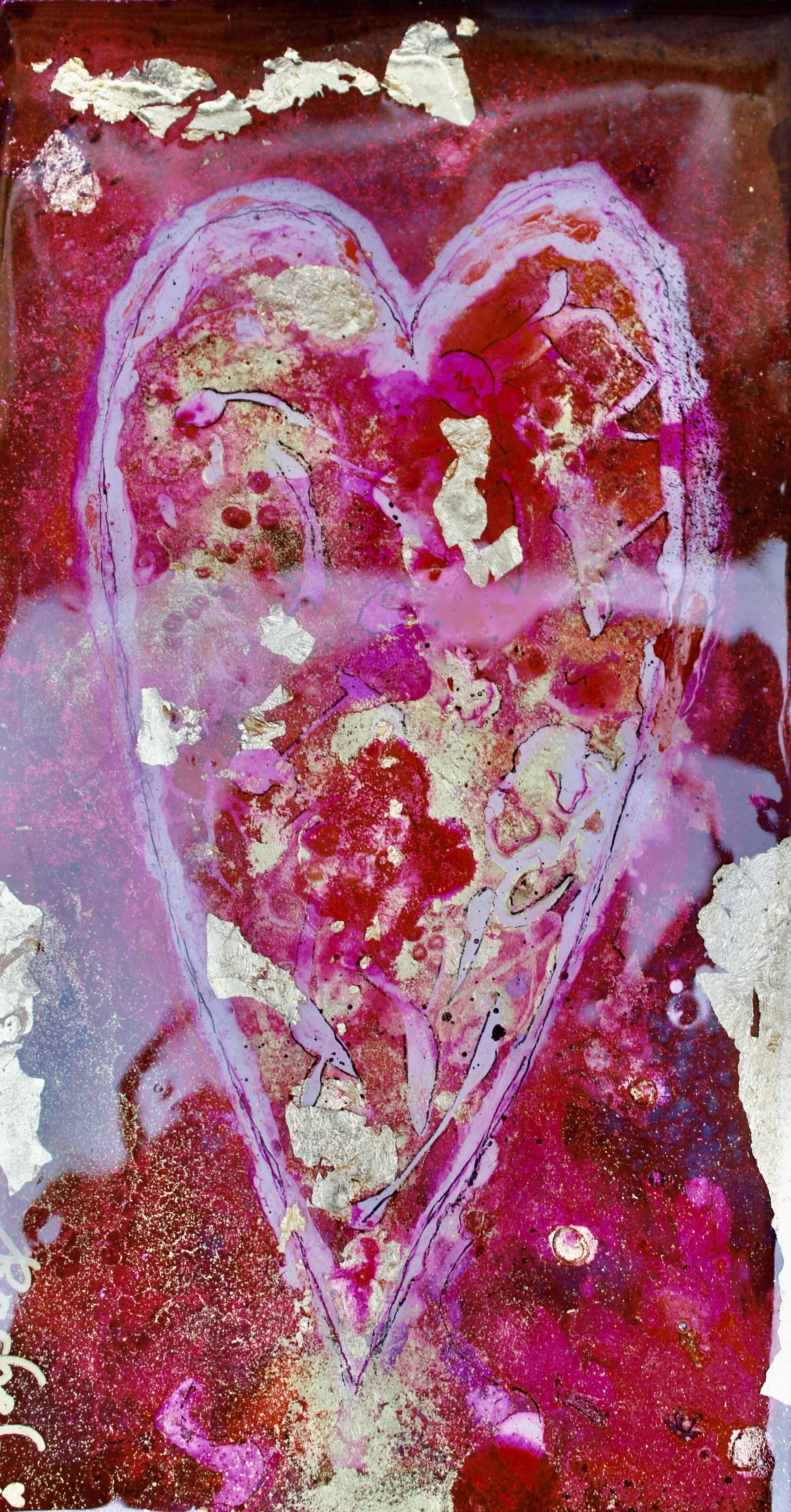McCullock's aluminium resin paintings are constructed in layers. Initially in a gestural manner, then becoming more complex with each layer. By adding colour and cells she partly obscures the metal base. The final layer is purely creating the unique texture- the defining indicator of Rachel's work. Presenting the latest painting in the 'Lockdown Love' Collection, 'Heart of Gold'. The panoply of pinks and iridescent gold foil of this art are mood enhancing and have the feel good factor. Many layers of resin have been applied to the highly textured heart and surrounding background. The surface of the painting is mirror finish gloss resin. Gold foil had been embedded between the layers thus producing a 3 dimensional effect. This artwork is signed on both sides. It is presented unframed. A plain unglazed box frame is recommended by the artist, alternatively it can be hung using a "Command" self adhesive velcro strip to enable the artwork to be hung unframed.