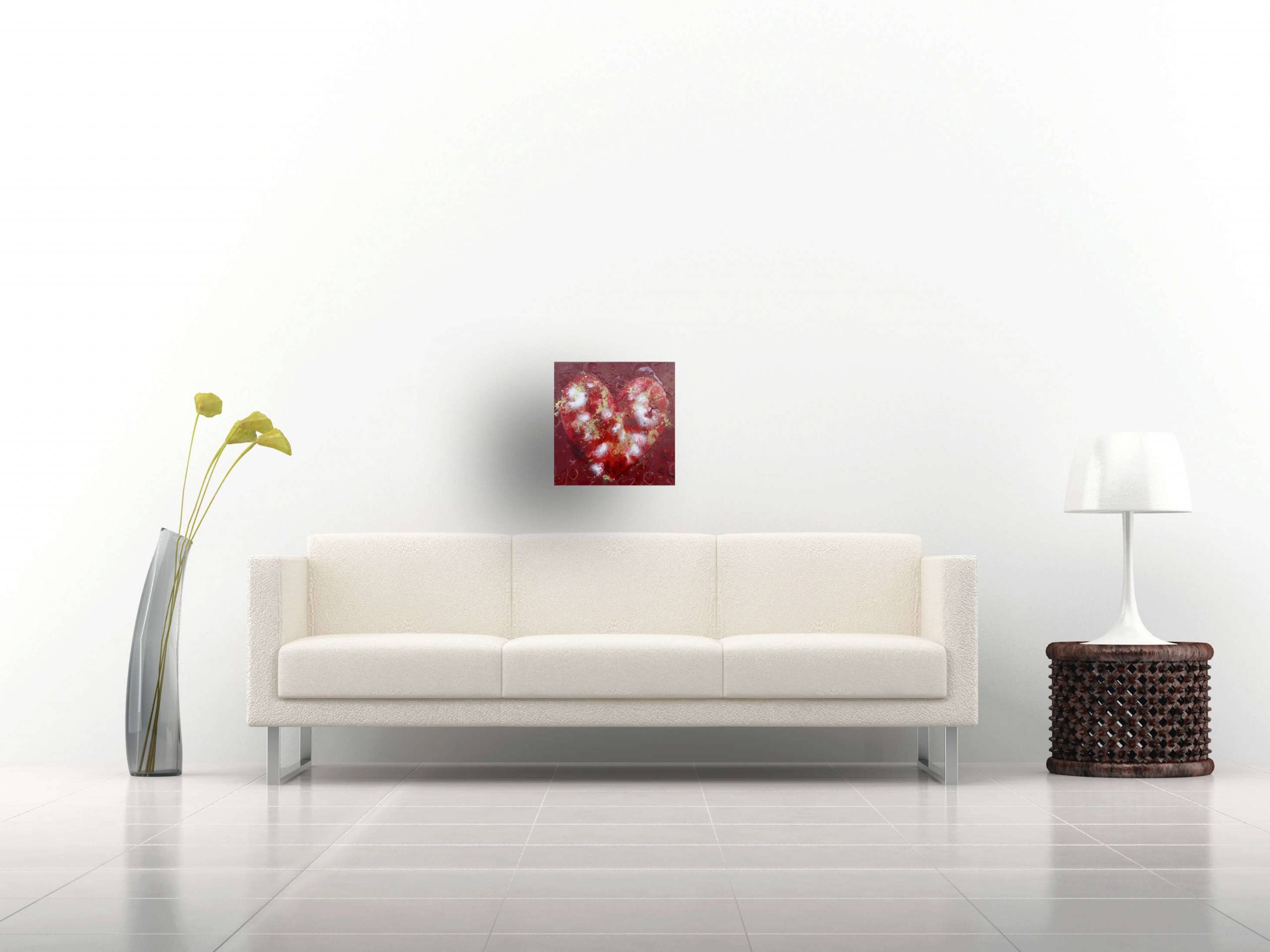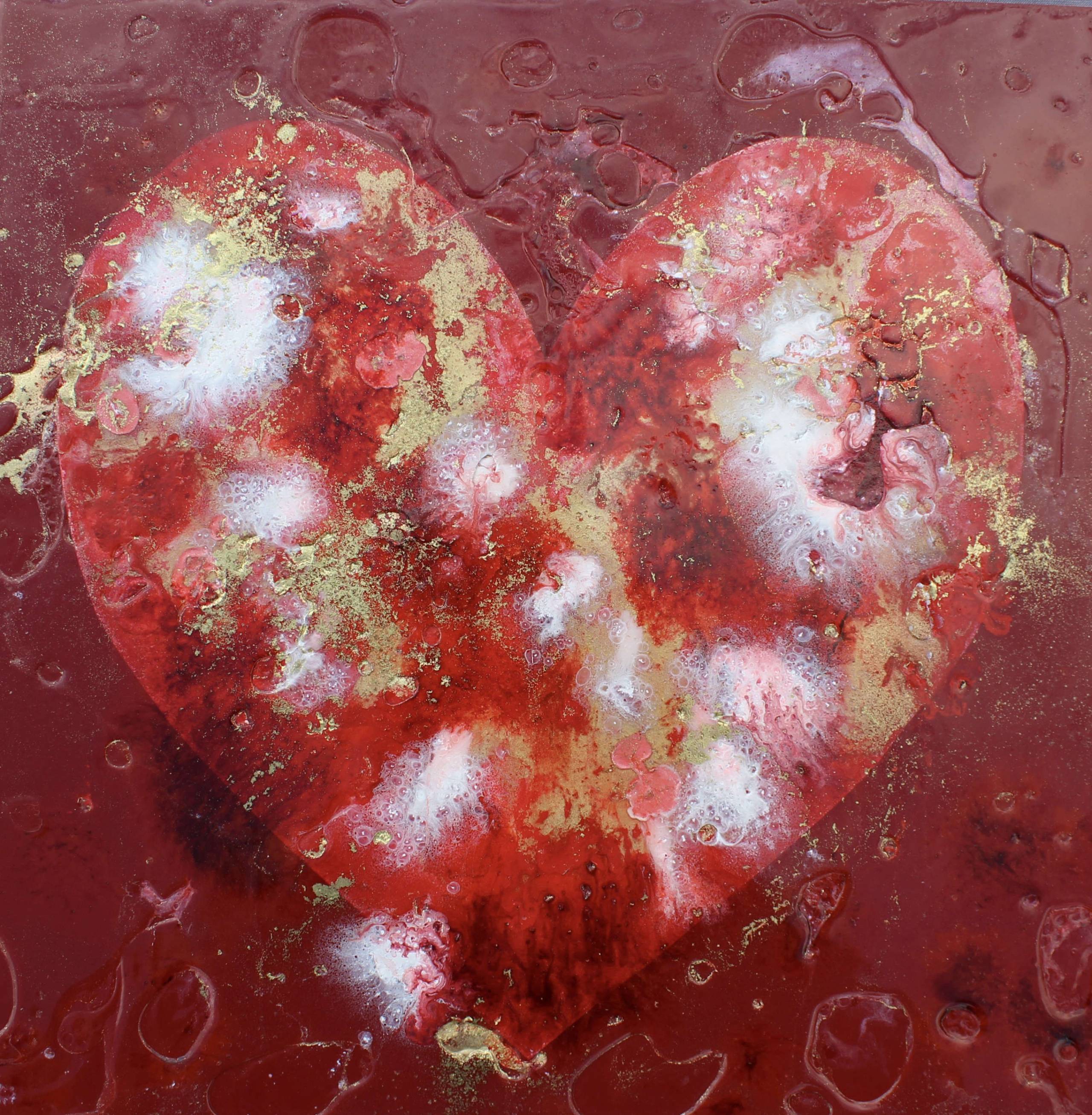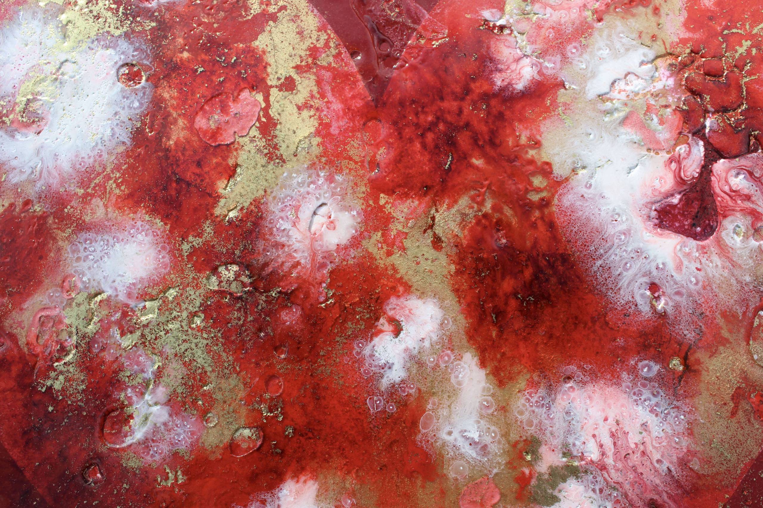 McCullock's aluminium resin paintings are constructed in layers. Initially in a gestural manner, then becoming more complex with each layer. By adding colour and cells she partly obscures the metal base. The final layer is purely creating the unique texture- the defining indicator of Rachel's work. The rich deep reds, iridescent gold pigment of this art are mood enhancing and have the feel good factor. The title of the collection is a nod to these unique times. The surface of the resin has texture and pits giving a 3 dimensional effect. This artwork is signed on the reverse . It is presented unframed. A plain unglazed box frame is recommended by the artist, alternatively it can be hung using a "Command" self adhesive velcro strip to enable the artwork to be hung unframed.