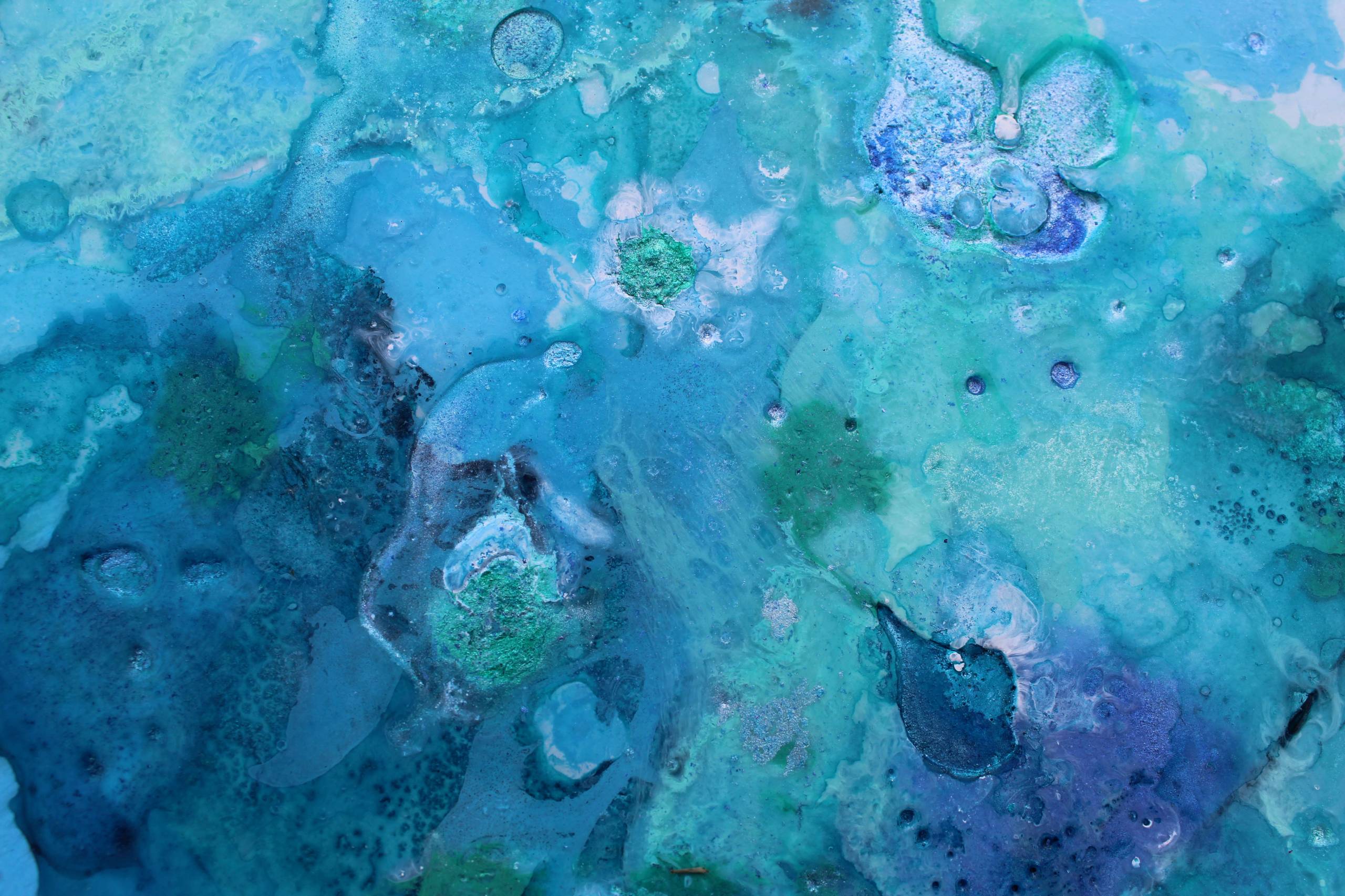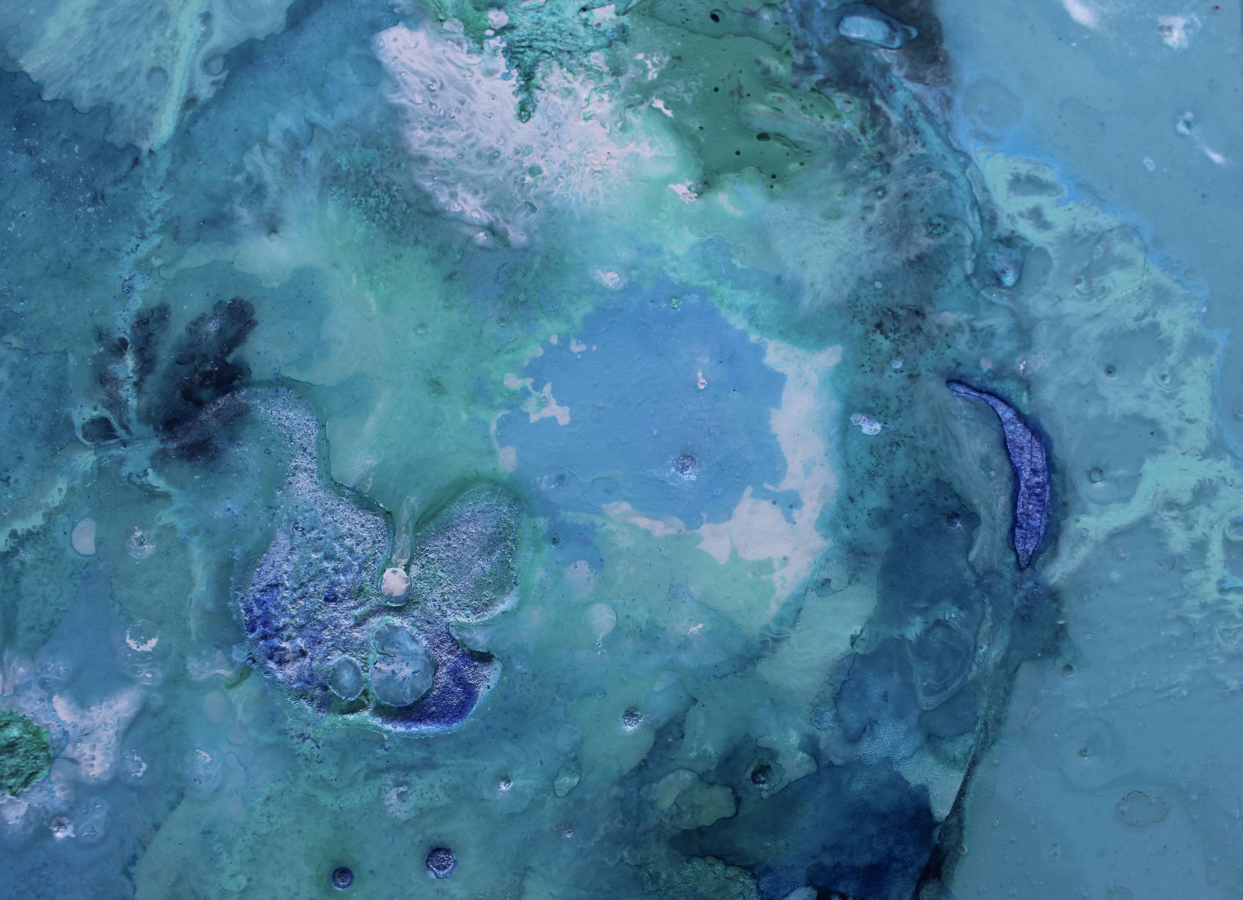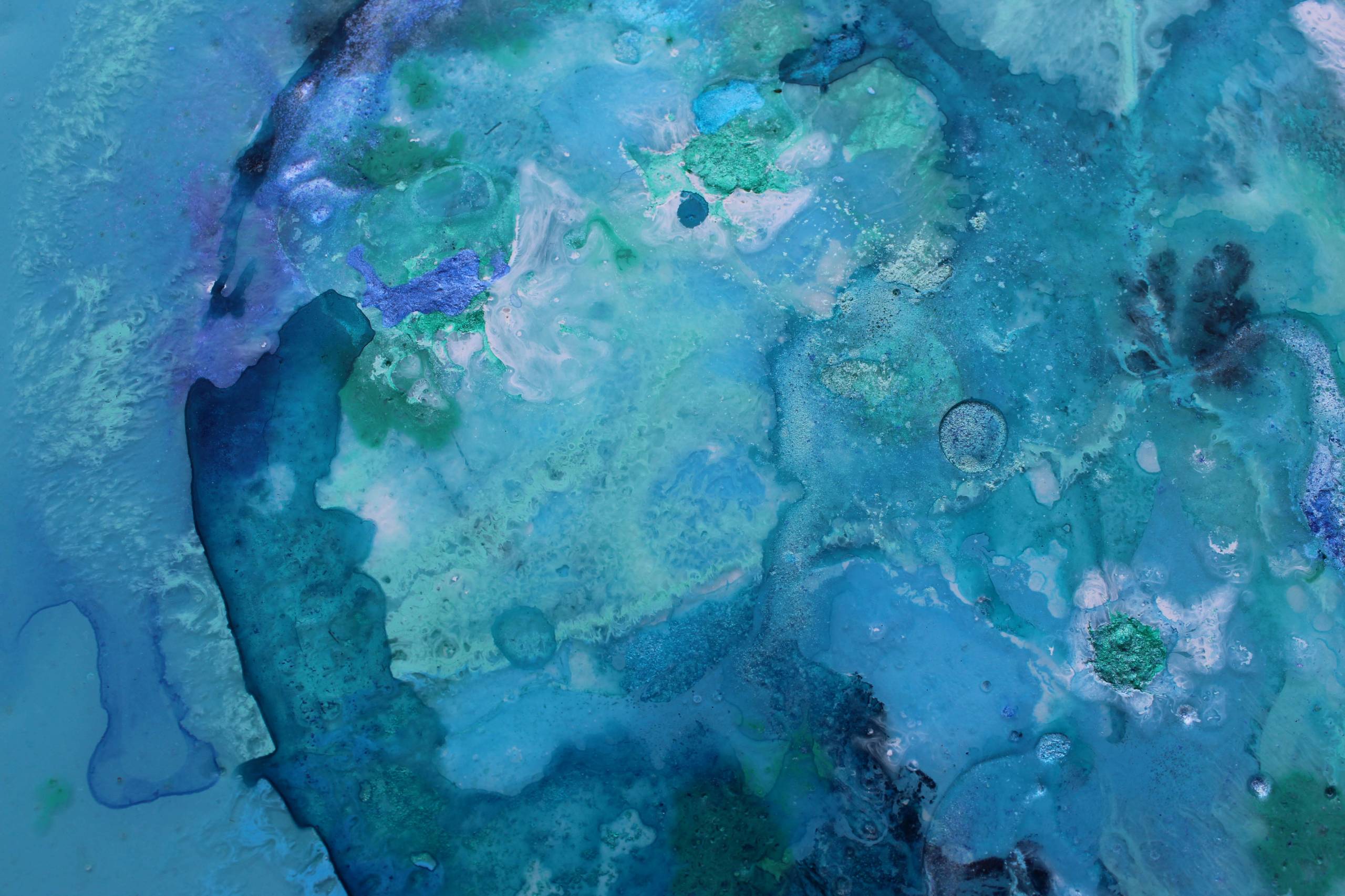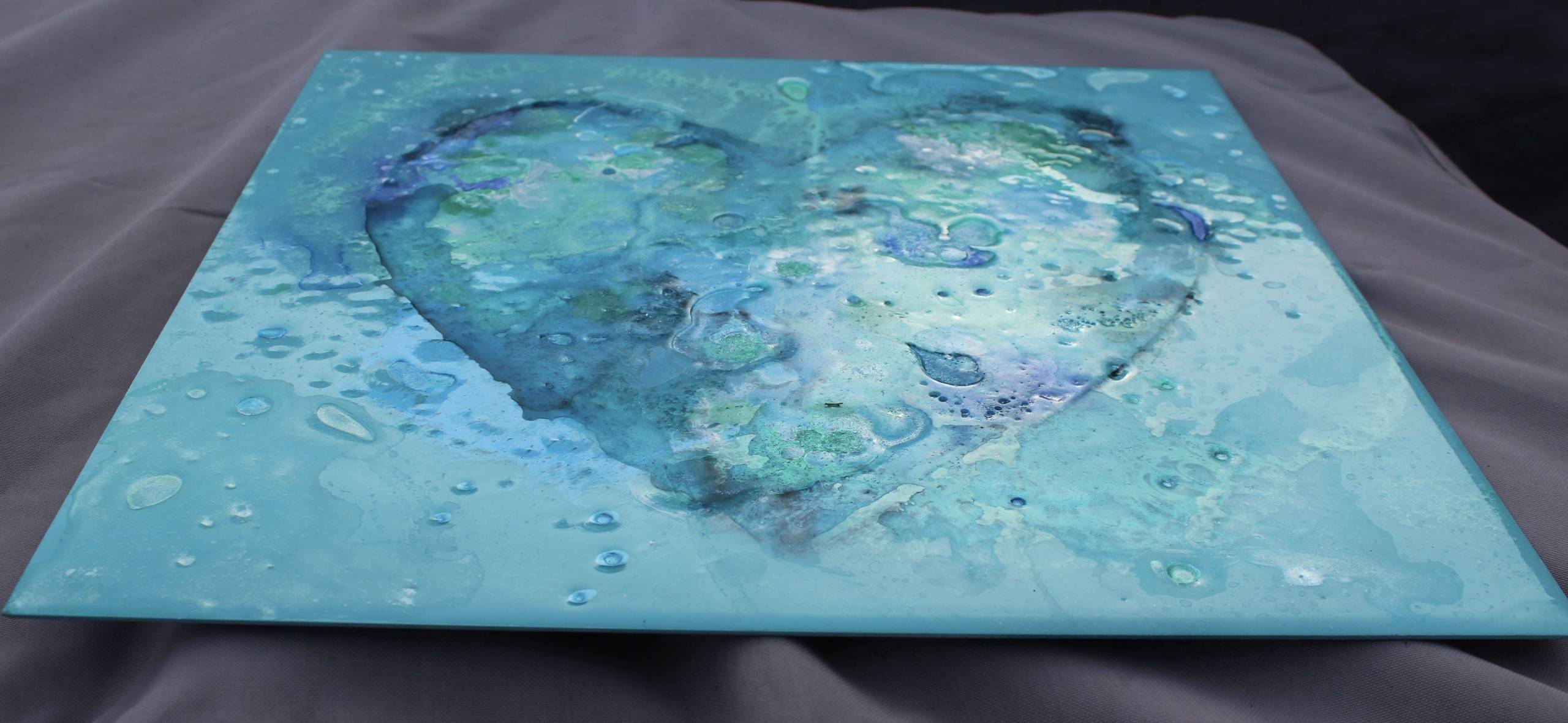 McCullock's aluminium resin paintings are constructed in layers. Initially in a gestural manner, then becoming more complex with each layer. By adding colour and cells she partly obscures the metal base. The final layer is purely creating the unique texture- the defining indicator of Rachel's work. The rich deep blues, turquoise and iridescent inks of this art are mood enhancing and have the feel good factor. The title is a nod to these unique times. The surface of the resin has texture and pits giving a 3 dimensional effect. This artwork is signed on the reverse . It is presented unframed. A plain unglazed box frame is recommended by the artist, alternatively it can be hung using a "Command" self adhesive velcro strip to enable the artwork to be hung unframed.