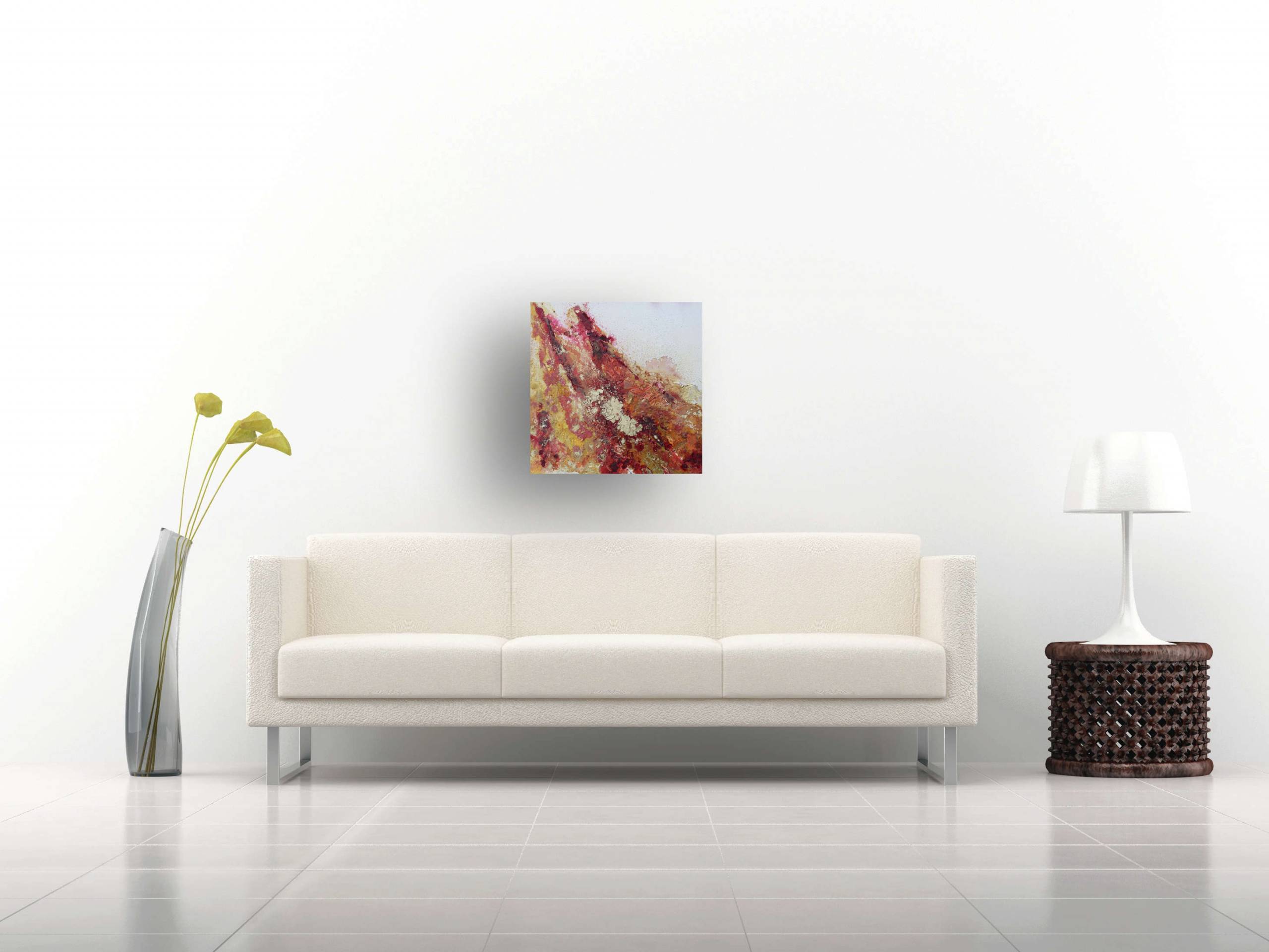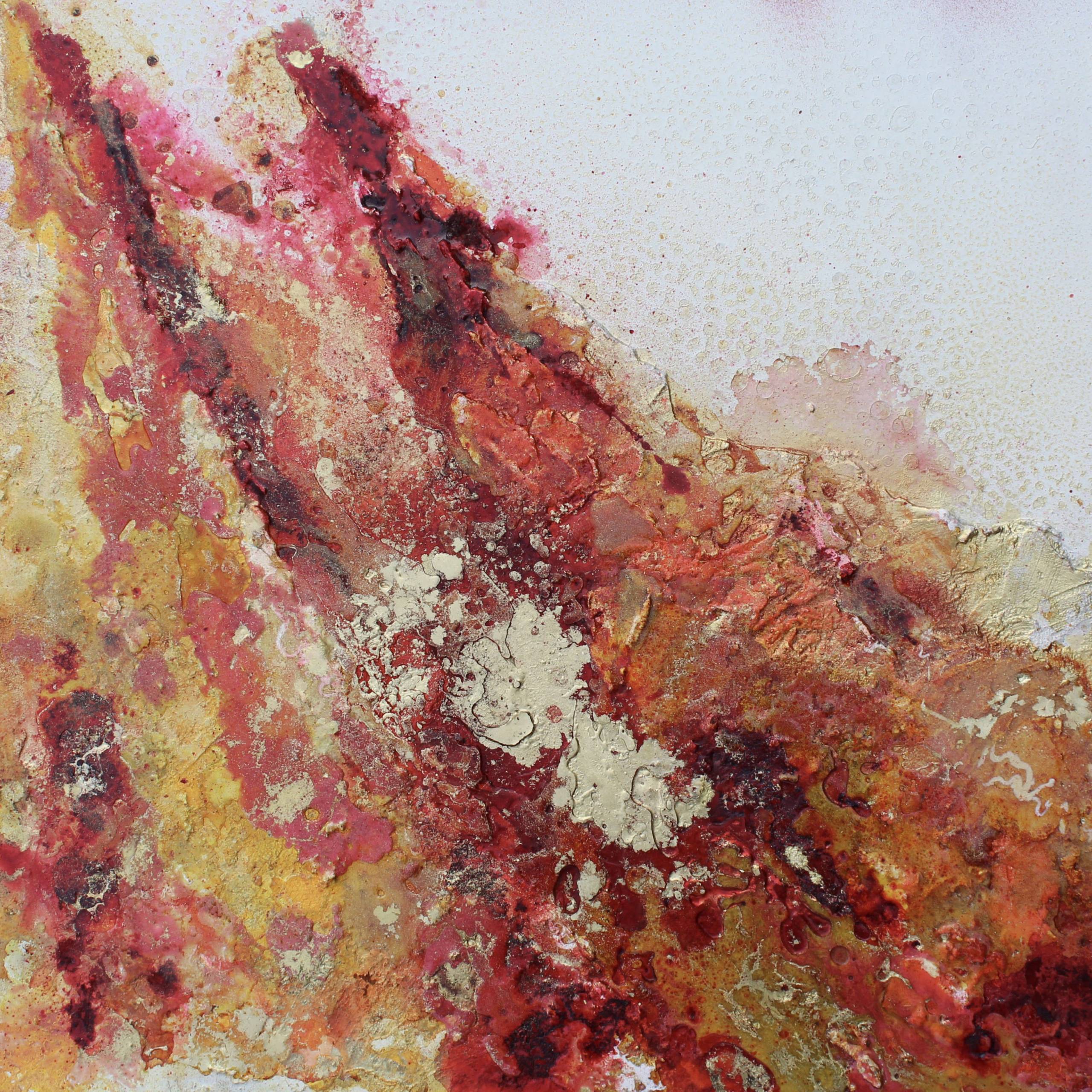 This painting explores and celebrates vibrant rich colours and textures. Innovative use of mixed media and much layering of pigments and washes are used to create dramatic colours and shapes. The creative process is lengthy and is a calming and engaging procedure. I begin by adding texture to the base.The painting starts with an oil base layer followed by spray paint and various immiscible liquid paints. These cause wonderful patterns and textures as they interact together. These textures are built up gradually until the painting is balanced and aesthetically pleasing. Painted on a cradled beechwood panel, the sides of which have been sprayed red. The painting has been embellished with a high gloss resin over the centre of the painting. This gives an extra dimension and a very contemporary twist. Signed on the reverse. Strung ready to hang.