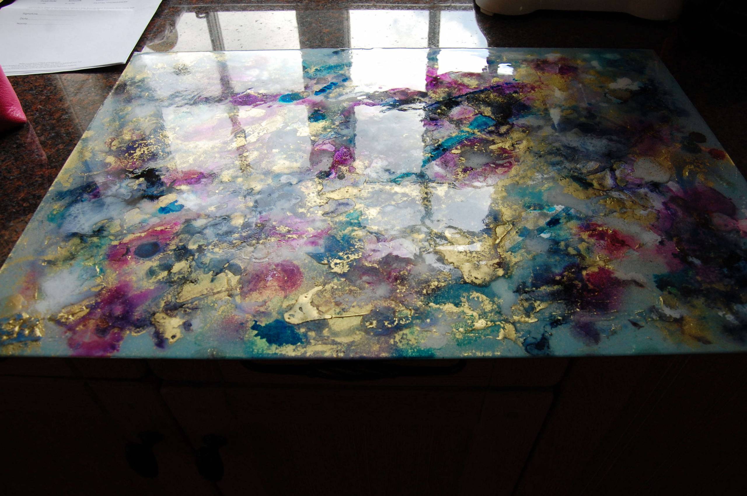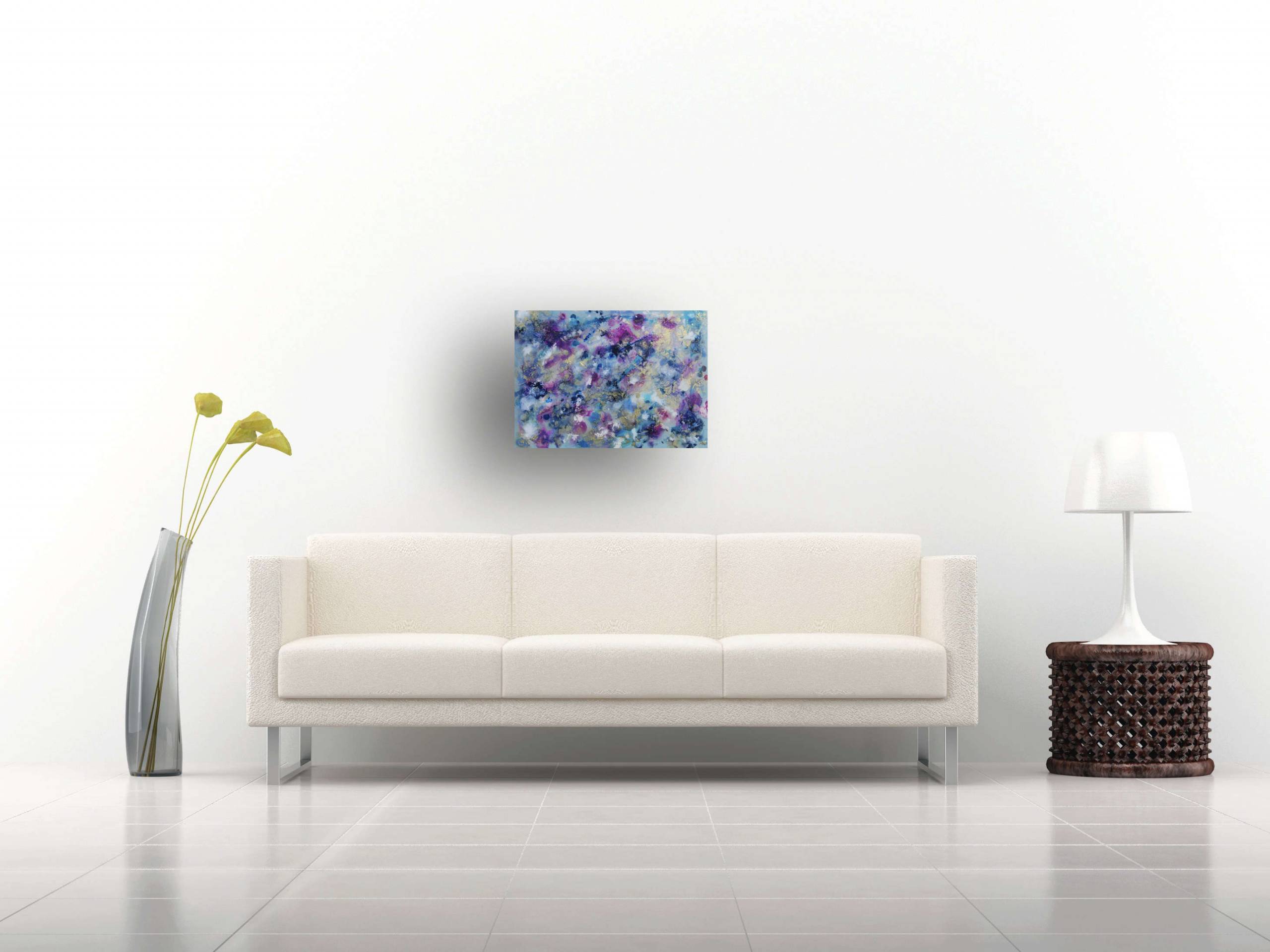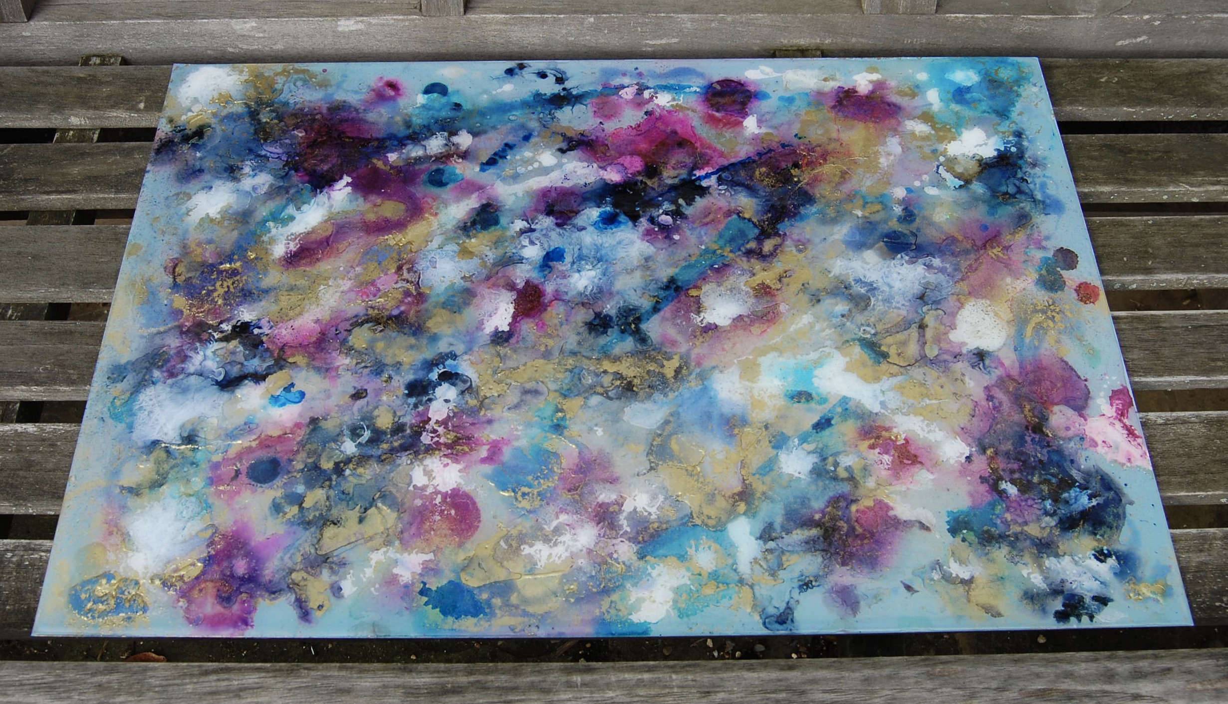 Rachel's aluminium resin paintings are constructed in layers. Initially in a gestural manner, then becoming more complex with each layer. By adding colour and cells she partly obscures the shiny metal base. The surface has a mirror finish of pure resin. Looking into the work one can see craters of gold. This creates a true 3D element and produces a wow factor to the art. The rich deep purples, blues , gold and soft pink of this piece are mood enhancing and have the feel good factor to the viewer. This piece will be signed on the reverse, and is presented unframed. A plain unglazed box frame is recommended by the artist. Alternatively it can be supplied with a proliner hook which adheres to the back of the artwork enabling the artwork to be hung unframed.