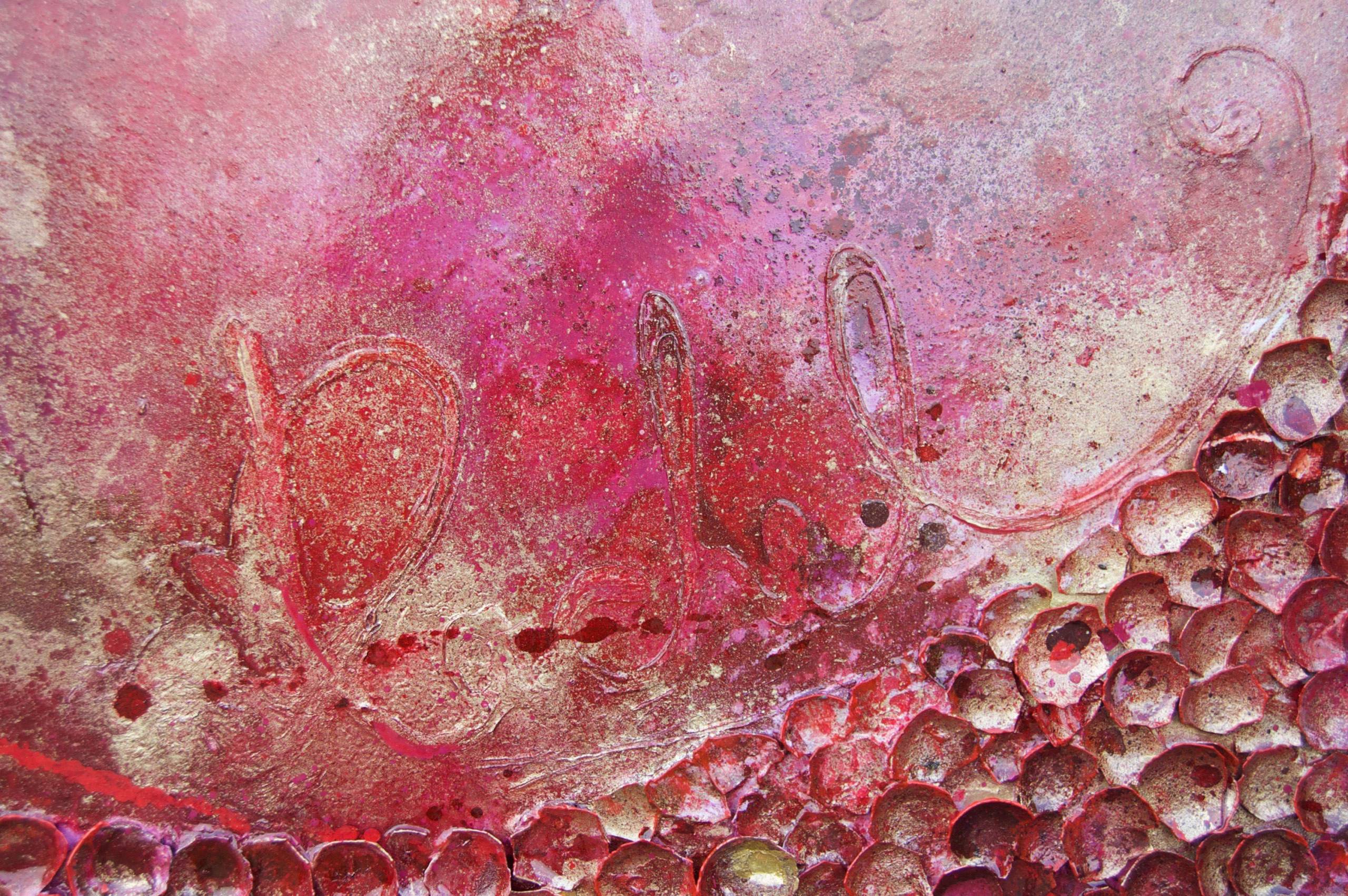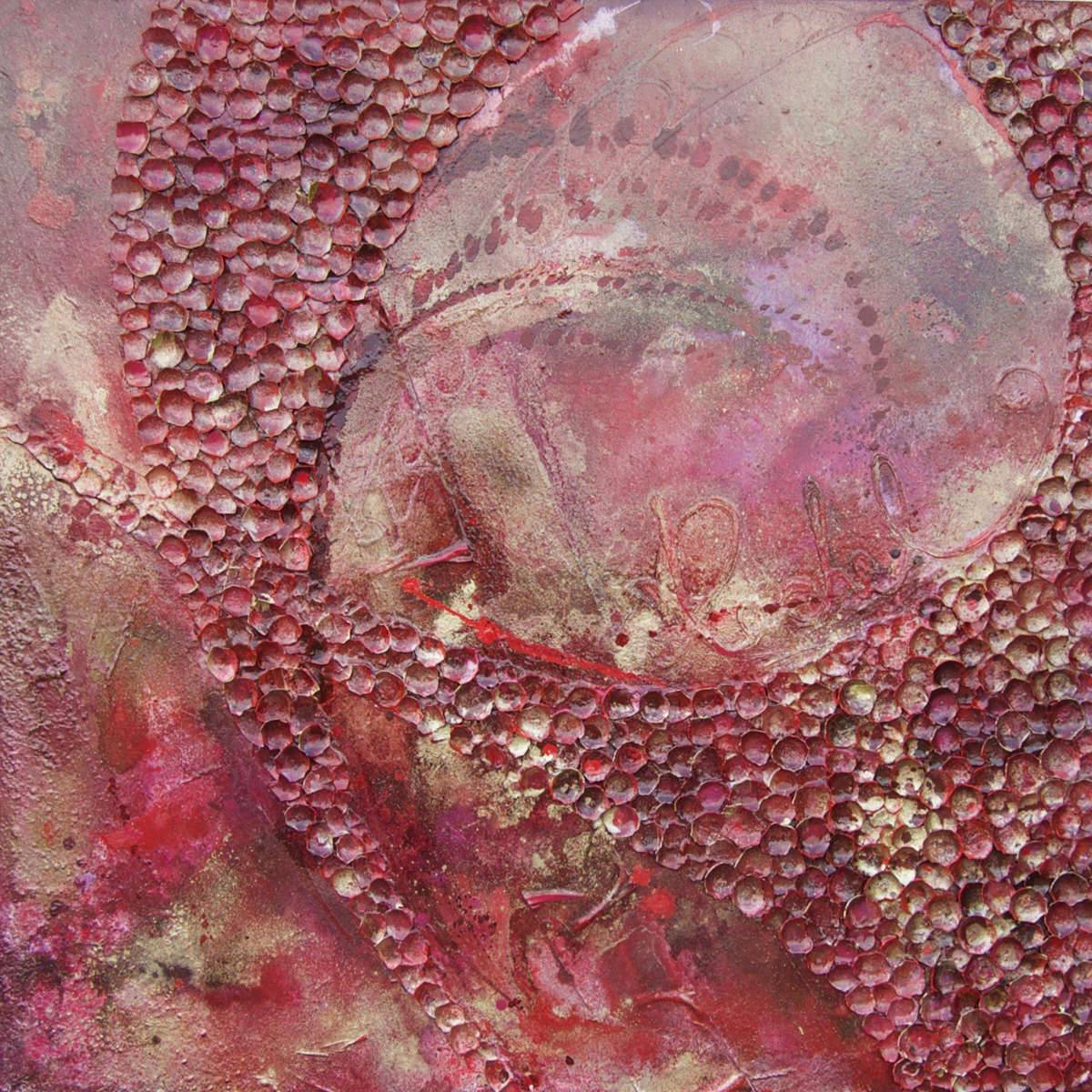 A stunning contemporary abstract designed to deliver the wow factor to a blank wall. McCullock's innovative techniques and many fascinating textures have been deployed to create this highly original piece. Coated with UV varnish designed to protect and enhance. Her textures are highlighted with gold paint for maximum attention to detail. Signed within the pattern of the painting and on the reverse. Strung ready to hang.