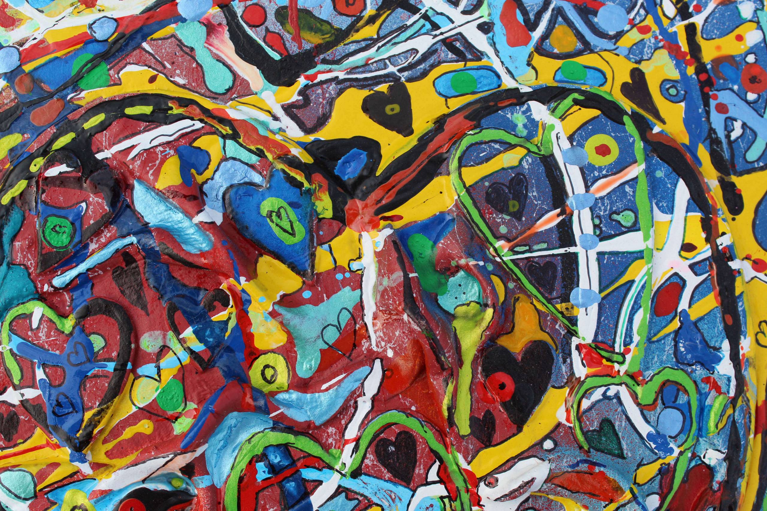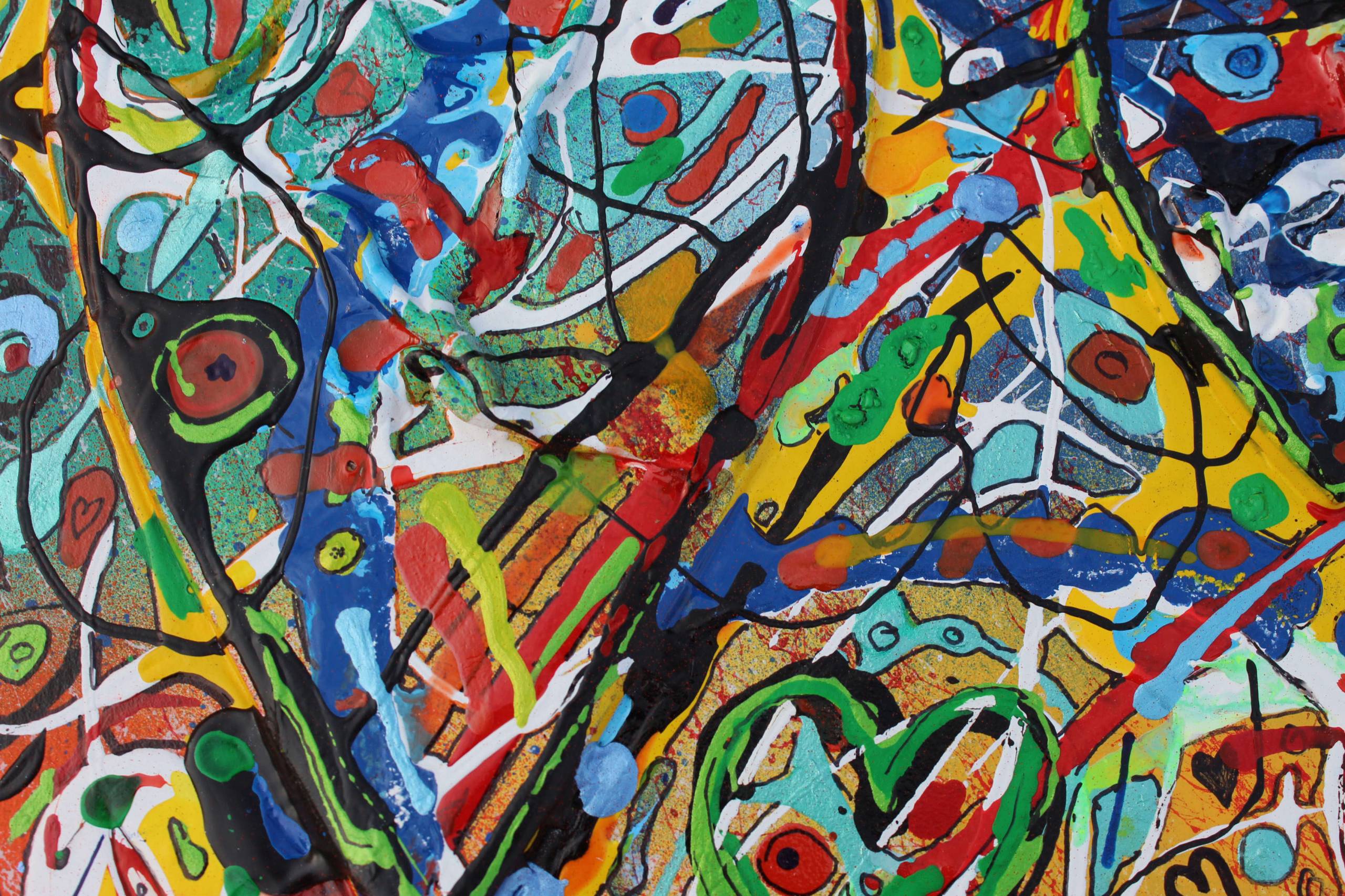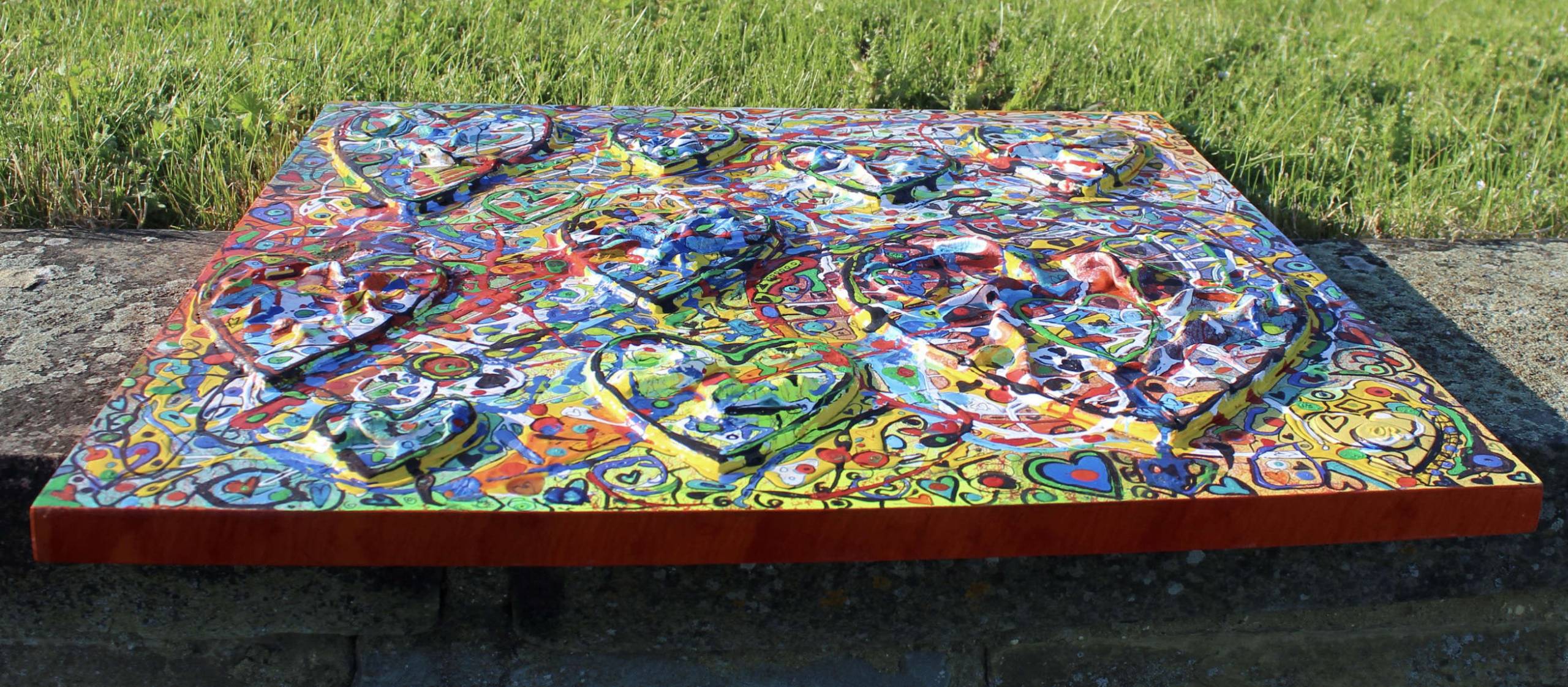McCullock's latest foray into colour and texture has resulted in intensely busy graphic images. The composition almost resembles graffiti but displays a more aesthetically pleasing form. Modelling clay adds the texture to the cradled wooden substrate, resulting in a 3 dimensional image. Inks and acrylic paint have been used to great advantage to enable contrasting textures. The surface is finally finished with a matte varnish to protect and enhance. Initialled in clay on the front and signed on the reverse.