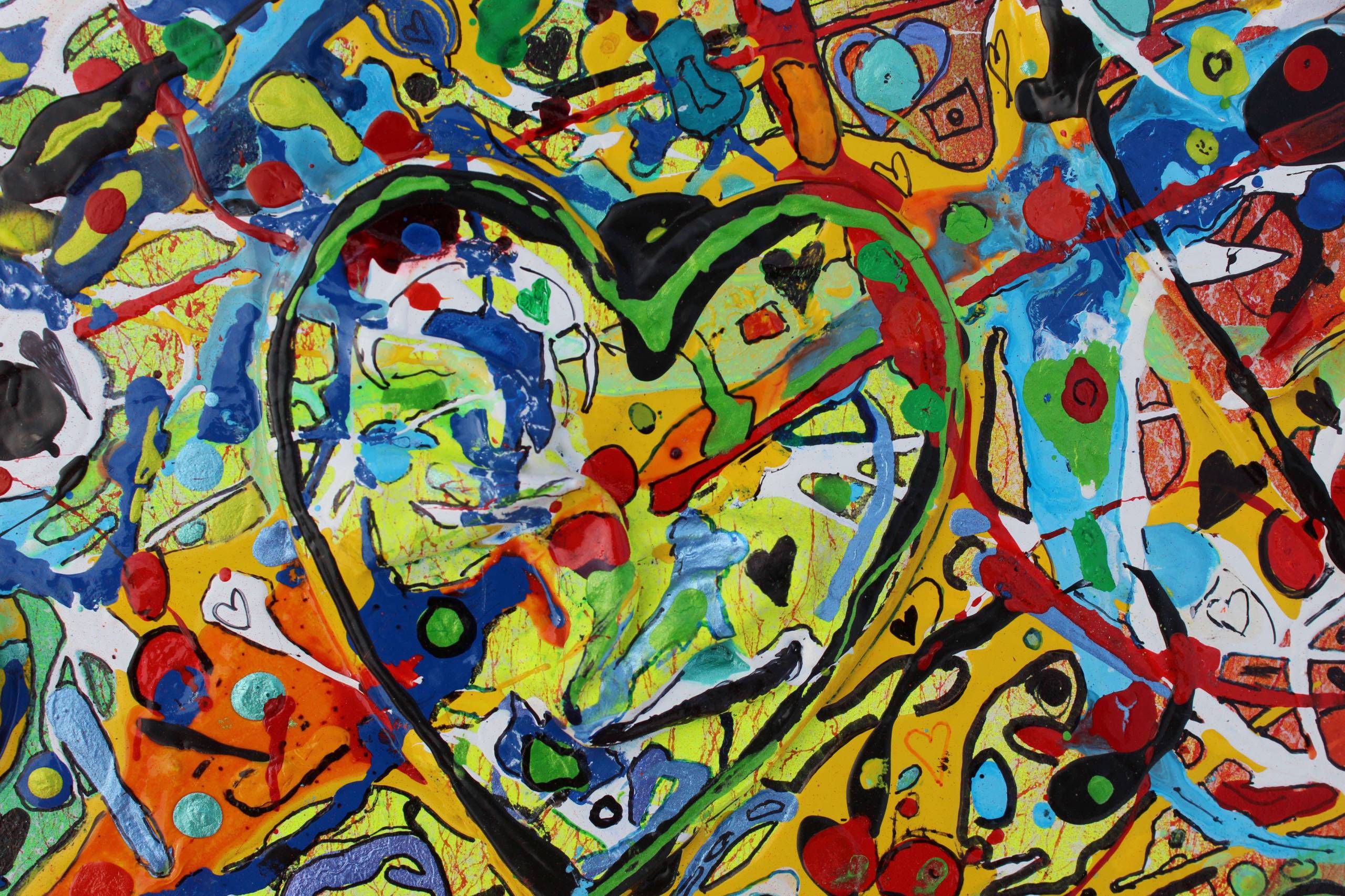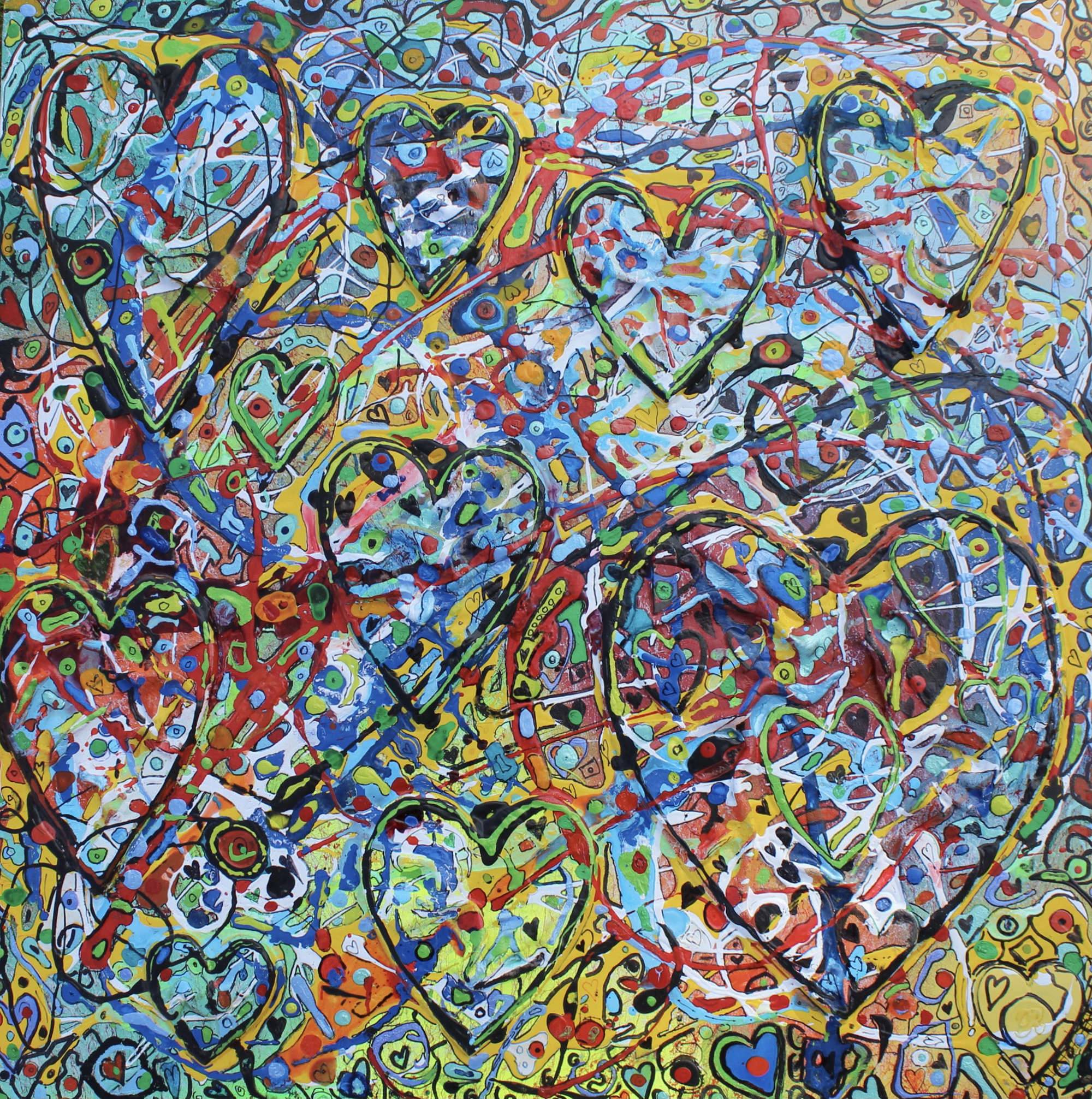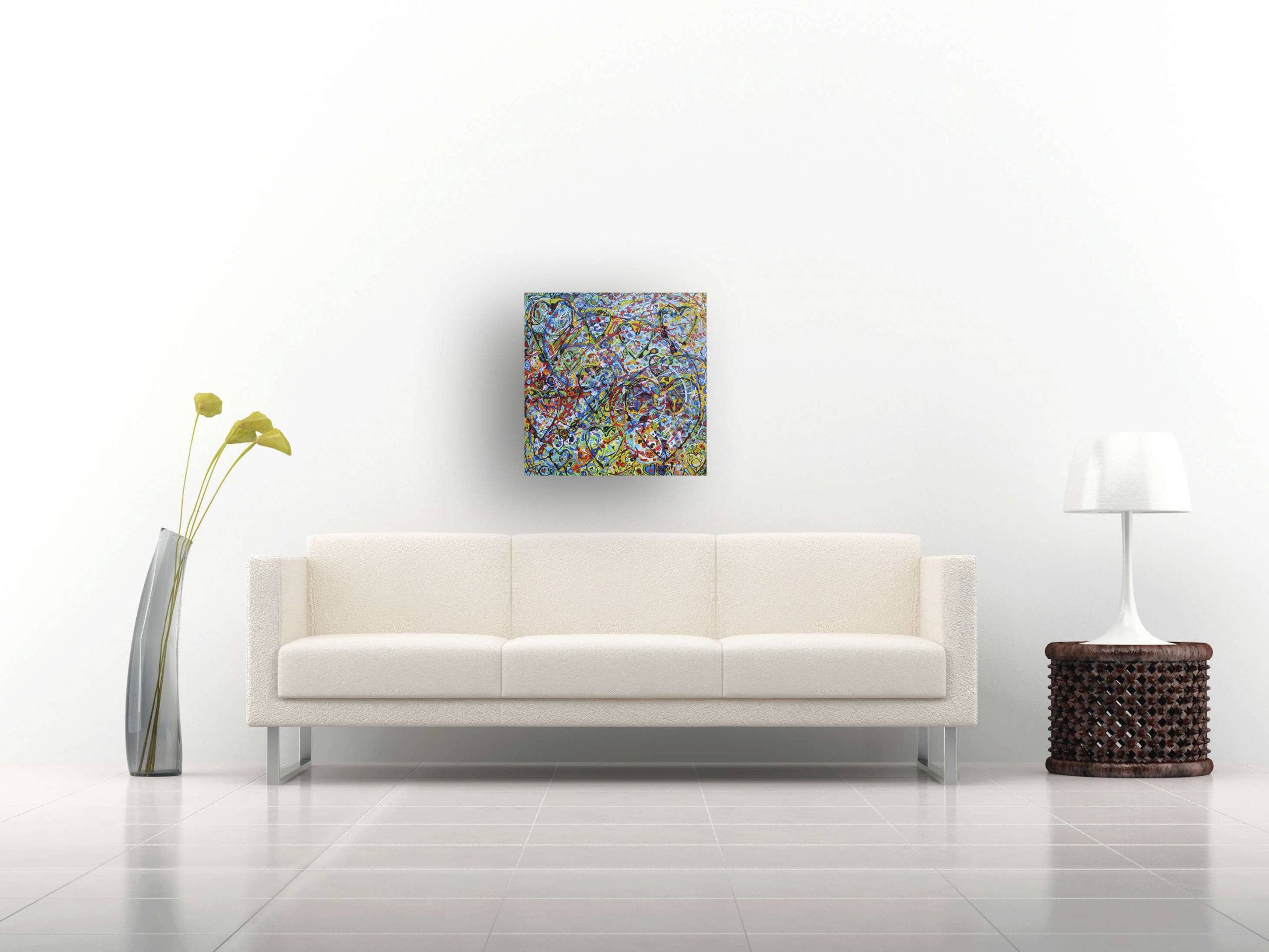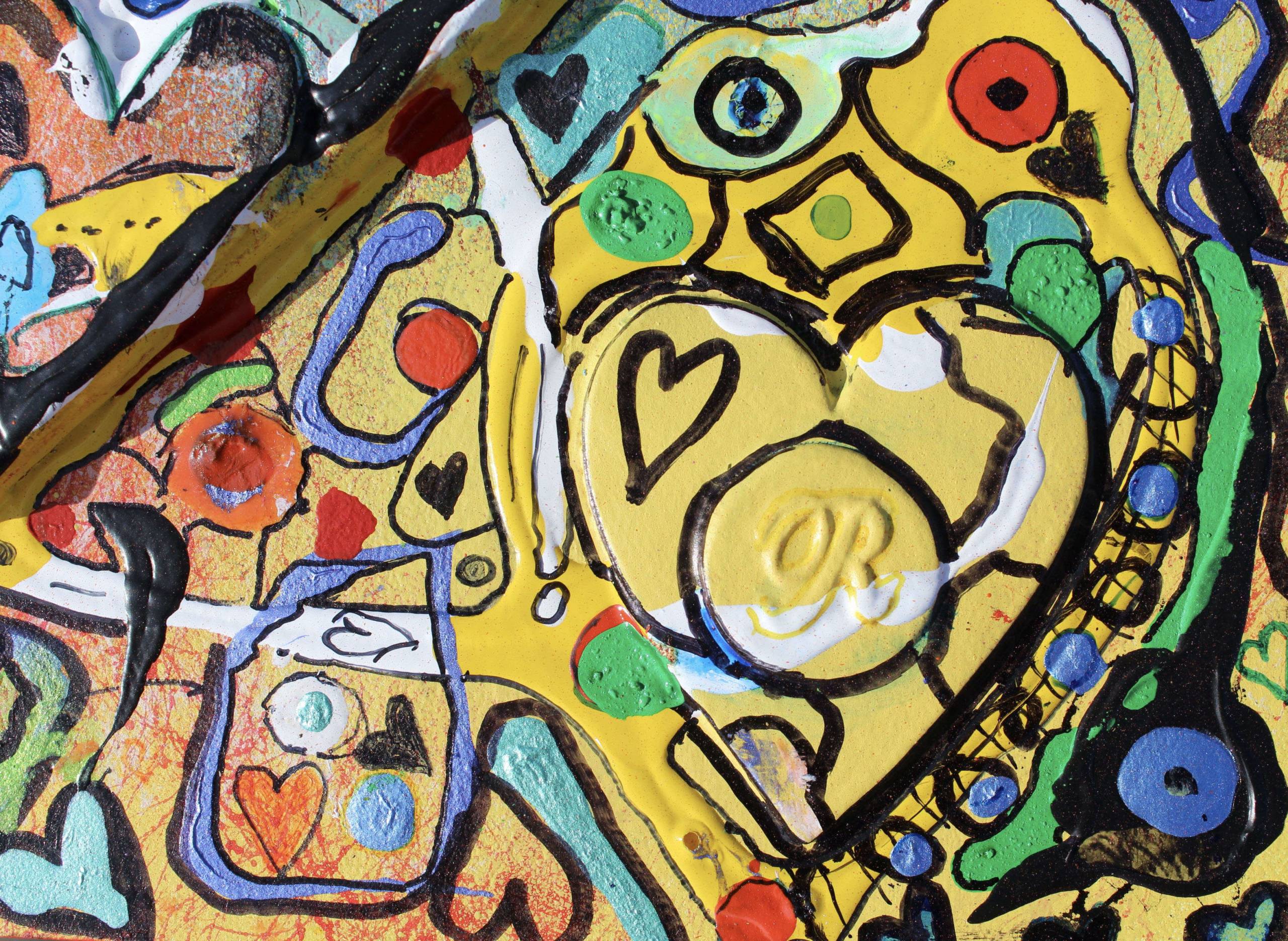 McCullock's latest foray into colour and texture has resulted in intensely busy graphic images. The composition almost resembles graffiti but displays a more aesthetically pleasing form. Modelling clay adds the texture to the cradled wooden substrate, resulting in a 3 dimensional image. Inks and acrylic paint have been used to great advantage to enable contrasting textures. The surface is finally finished with a matte varnish to protect and enhance. Initialled in clay on the front and signed on the reverse.