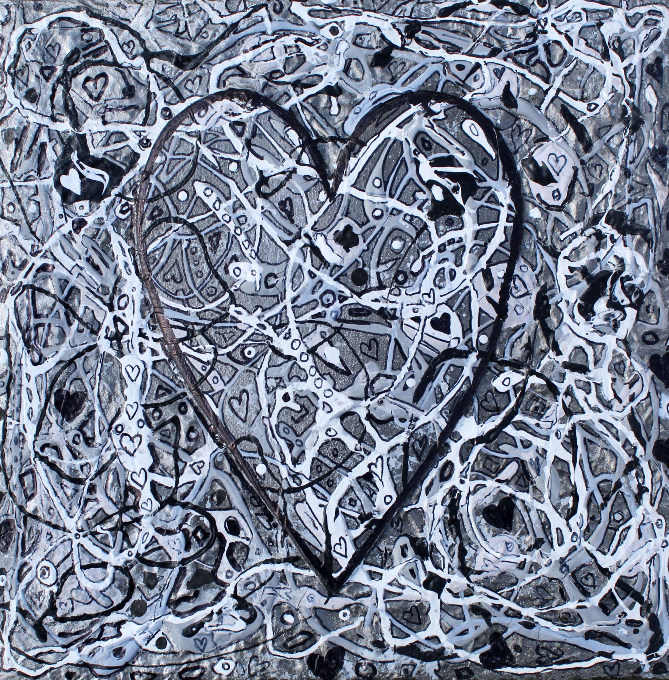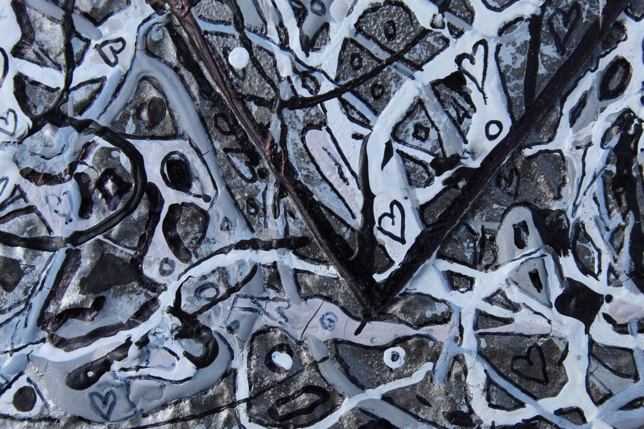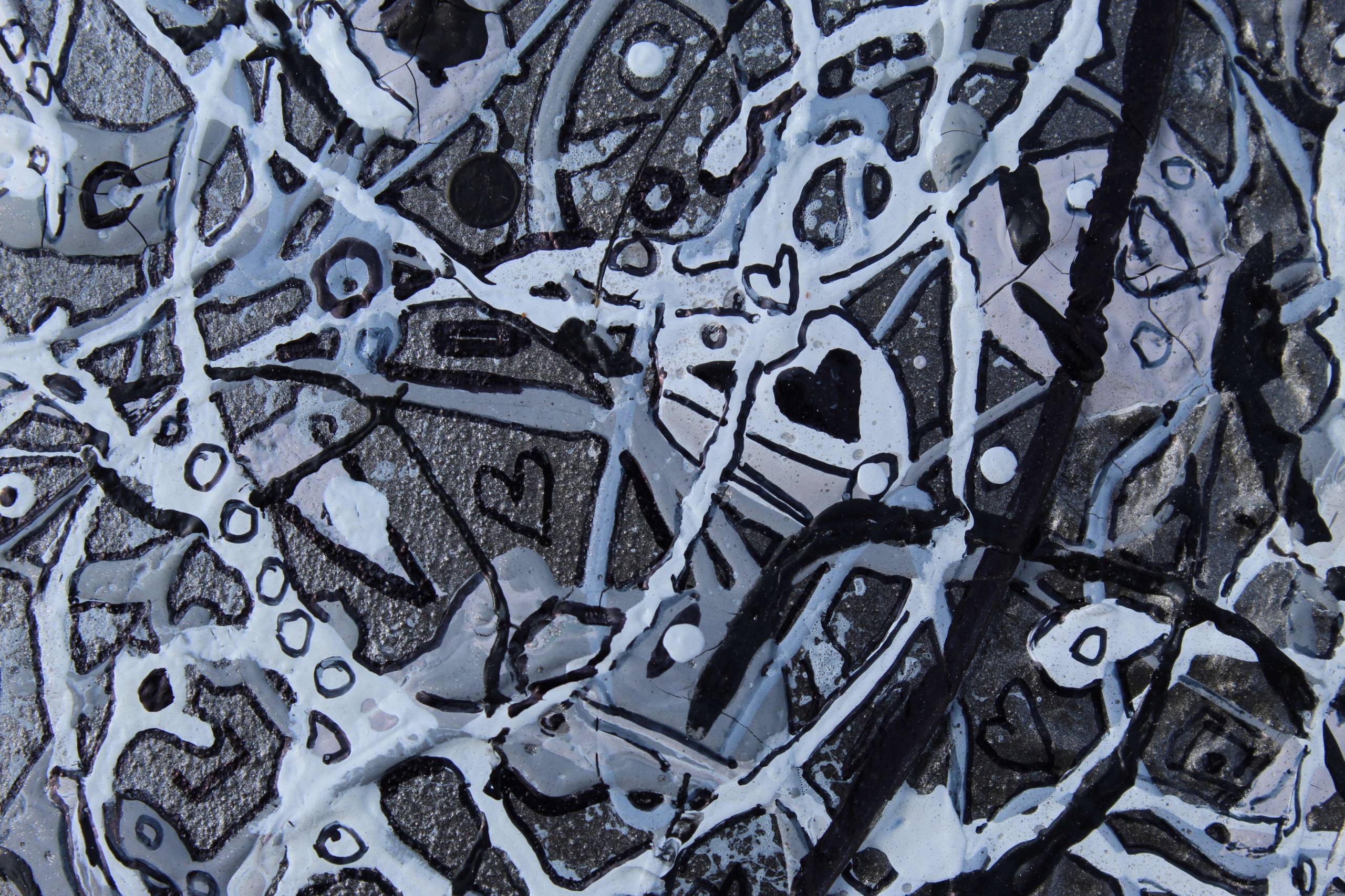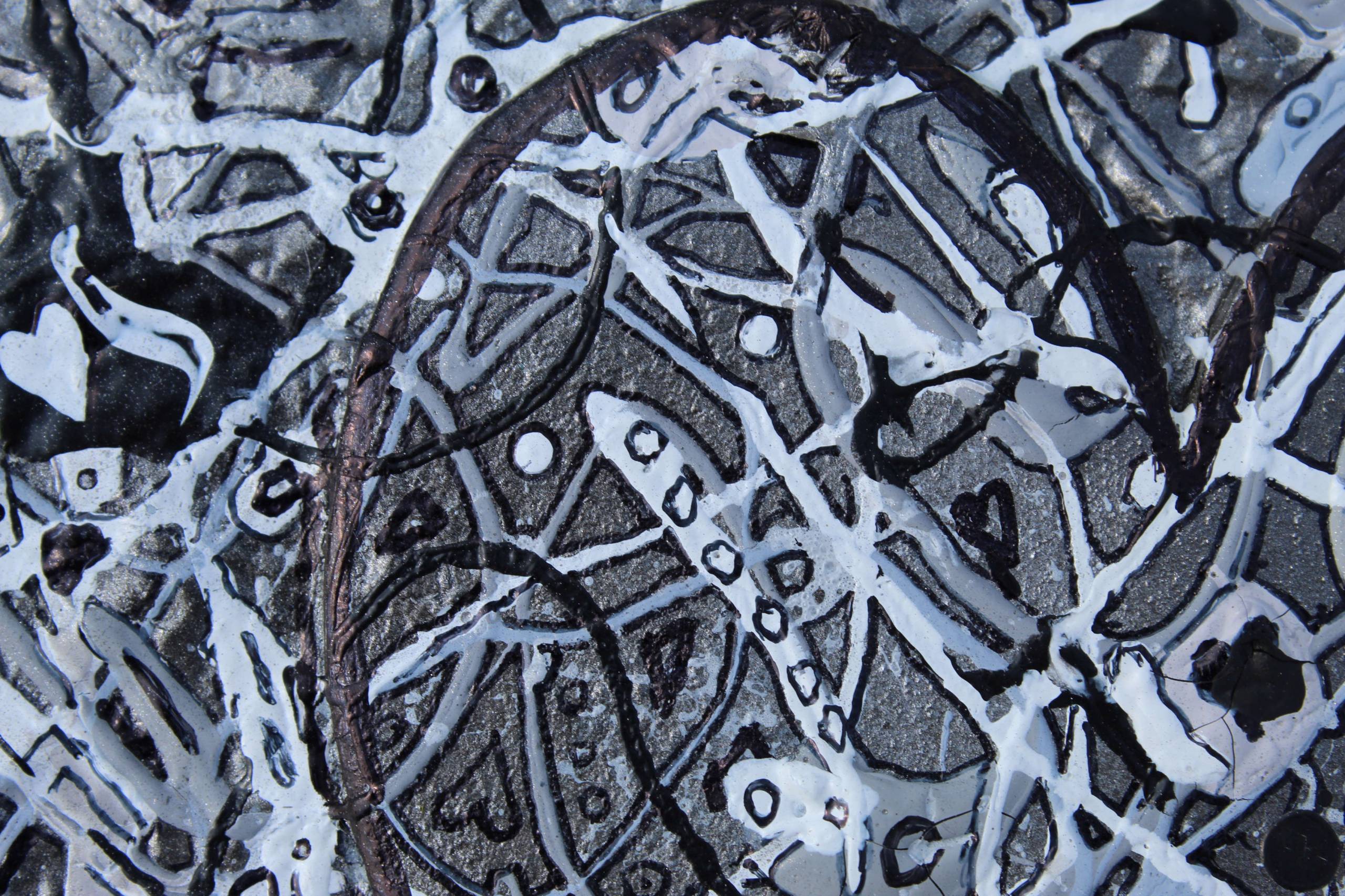 McCullock's latest foray into colour and texture has resulted in intensely busy graphic images. The composition almost resembles graffiti but displays a more aesthetically pleasing form. Modelling clay adds the texture to the canvas substrate, resulting in a 3 dimensional image. Inks and acrylic paint have been used to great advantage to enable contrasting textures. The surface is finally finished with a matte varnish to protect and enhance. Initialled in clay on the side and signed on the reverse.