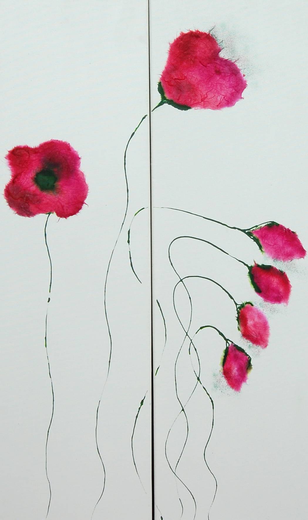 Obraz przedstawia niezwykle delikatną kompozycję czerwonych i różowych kwiatów, jakby unoszących się na tle. Ich płatki, przypominające akwarelowe smugi, otaczają zielona łodyga, która zdaje się być ledwie naszkicowana, jakby artysta chciał tylko zasugerować jej kierunek. Dominują subtelne kontrasty kolorystyczne - odcienie czerwieni i różu przemykają przez biel tła, tworząc kontrast jednocześnie harmonijny i dynamiczny. Atmosfera dzieła jest pogodna, chwilami nawet nostalgiczna, przypomina mi wiosenny spacer po ogrodzie pełnym kwiatów. Styl jest minimalistyczny, artysta posługuje się techniką akwareli, pozwalając kolorom swobodnie się rozlewać, co nadaje całości wrażenie lekkości. Te kwiaty, choć na pozór proste, mogą wywoływać wiele emocji. Dla jednych będą symbolem ulotności chwili, dla innych - beztroskiej radości. Można poczuć jak takie letnie „happy vibes” ogarniają umysł. W sposobie przedstawienia kwiatów kryje się coś magicznego. Wyglądają jak obrazy, które mogłoby namalować dziecko. „One są jak moje kwiatki w ogródku!” - pomyślałby siedmioletni maluch. Każdy z nas może zobaczyć w tej kompozycji coś innego.