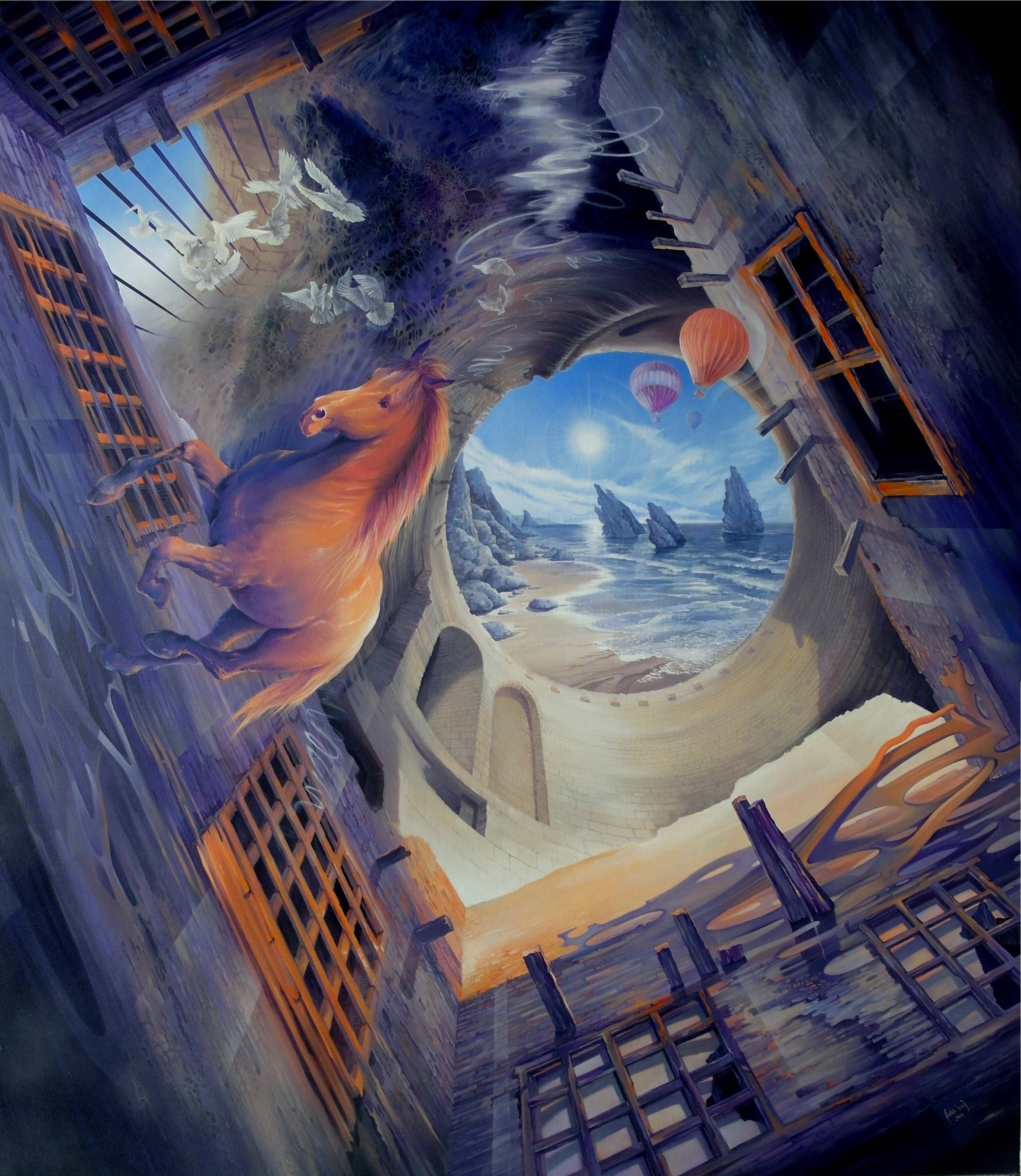 Obraz z 2014 roku będący swego rodzaju kolażem przypadkowych fragmentów rzeczywistości zestawionych w baśniowy pejzaż z barwnego snu, obraz sprzedany. Istnieje możliwość zamówienia kopii autorskiej drukowanej i sygnowanej w formacie 1:2 czyli 70x60 cm w cenie 1500 zł. Ilość drukowanych kopii na płótnie ograniczona jest do 10 sztuk