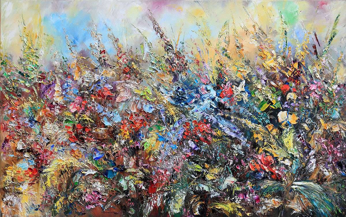 Na obrazie widzimy feerię barw, które zdają się tańczyć niczym płatki kwiatów na wietrze. Dominują soczyste czerwienie, błękity i zielenie, które miesza się w harmonijną kompozycję z rozświetlonymi żółciami i różem. Kształty są dynamiczne, nieco rozmyte, co nadaje obrazowi wrażenie ruchu. Atmosfera jest pełna życia, jakby sam obraz oddychał świeżością wiosennego ogrodu. Styl artysty jest pełen ekspresji, zdradza użycie techniki impasto. Grubo nałożona farba tworzy teksturę przypominającą relief, co dodaje trójwymiarowości. Taki styl powoduje, że obraza jest bardziej tactile, choć przecież nie można go dotknąć. Dla mnie wygląda jak łan kolorowych kwiatów tuż po deszczu. A może to tylko moje wyobrażenie? Obraz budzi wiele emocji. Czuje się radość i beztroskę, ale też nutę nostalgii. Taki widok przywołuje wspomnienia dzieciństwa, letnich dni pełnych zabawy. W głowie siedmiolatka to jest magiczny ogródek pełen tajemniczych wróżek, gdzie każdy kolor opowiada własną historię. Powiem szczerze, obrazy takie sprawiają, że chce się zatrzymać na chwilę i chłonąć je całym sobą, bo tańcząca feeria barw to pure joy dla oka.