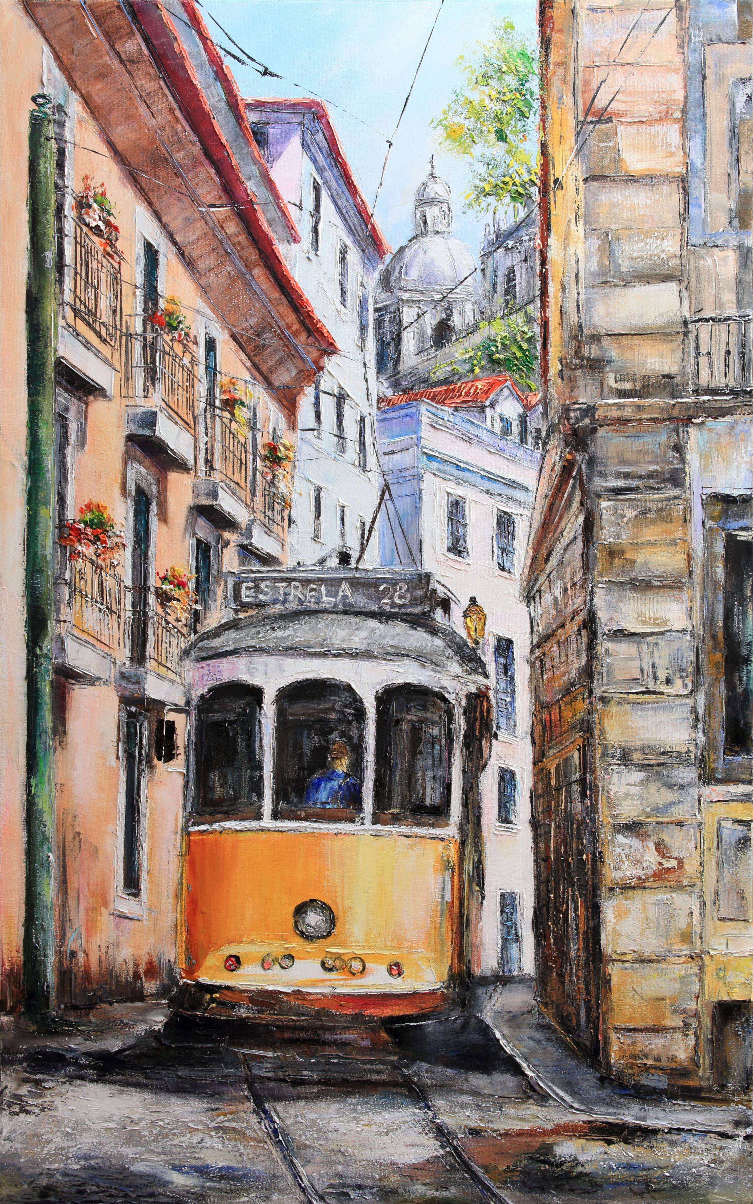 Na tym obrazie artysta uchwycił piękno malowniczej uliczki, na której centralnym punktem jest rozkoszny, pomarańczowy tramwaj nr 28. Kolory są żywe i pełne ciepła. Ciepłe odcienie budynków i czerwone dachy kontrastują z chłodnym błękitem nieba i bielą fasad, tworząc dynamiczną kompozycję. Tramwaj, jakby wyjęty z pocztówki, nadaje scenie nostalgicznego uroku. Artysta zastosował techniki impasto, dając grubą fakturę farby, co dodaje głębi i charakteru całej kompozycji. Akwarela i olejki to świet (great) połączenie, które wprowadza nastrój spokoju i leniwej beztroski. Obraz emanuje atmosferą słonecznego popołudnia, kiedy świat zdaje się zwalniać. Można prawie poczuć ciepło słońca padające na policzki. Ahhh, chciałoby się tam być! Ten obraz porusza, budzi wspomnienia z wakacji i skłania do marzeń o podróżach. Ja chcę tramwajem! To dzieło pokazuje, jak małe chwile mogą być piękne i ważne.