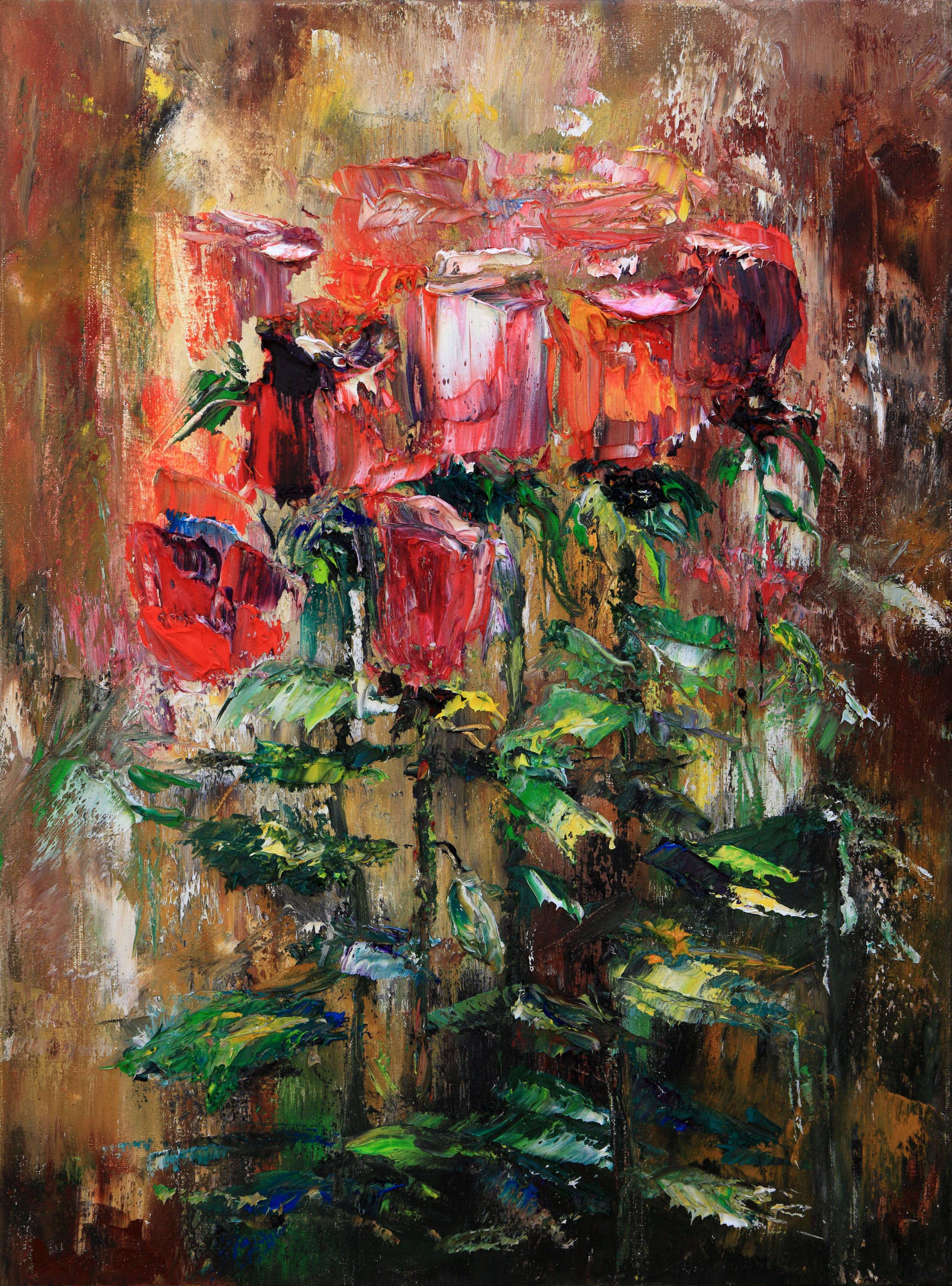 Obraz pełen barw i życia, przedstawia bukiet róż w szaleństwie kolorów. Czerwone i różowe płatki kwiatów kontrastują z intensywną zielenią liści, tworząc dynamiczną i energetyczną kompozycję. Farba nałożona jest grubymi pociągnięciami pędzla, co dodaje tekstury i głębi każdemu elementowi. Tło, w rozmytych odcieniach brązu i złota, sprawia wrażenie ruchu, jest jakby niejasne, trochę tajemnicze. Artysta zastosował technikę impasto, dzięki której obraz wydaje się niemal trójwymiarowy, niemal, jakby kwiaty mogły wyjść poza ramy płótna. Atmosfera jest jednocześnie pełna radości i dramatyzmu, wciągająca widza w wir emocji. Róże wyrażają miłość, ale też ich krótkotrwałość przypomina o przemijaniu. Jak mówi moje serce, to jest magiczne. Dla dziecka obraz staje się magiczną łąką, gdzie róże mogą rozmawiać i śpiewać. To jest piękne! Malarska technika artysty zachęca do zadumy nad naturą, ale też nad sztuką samą w sobie. Wyraziste kolory i formy działają jak magnes, przyciągając uwagę i prowokując refleksję. Jedno jest pewne - to sheer beauty.