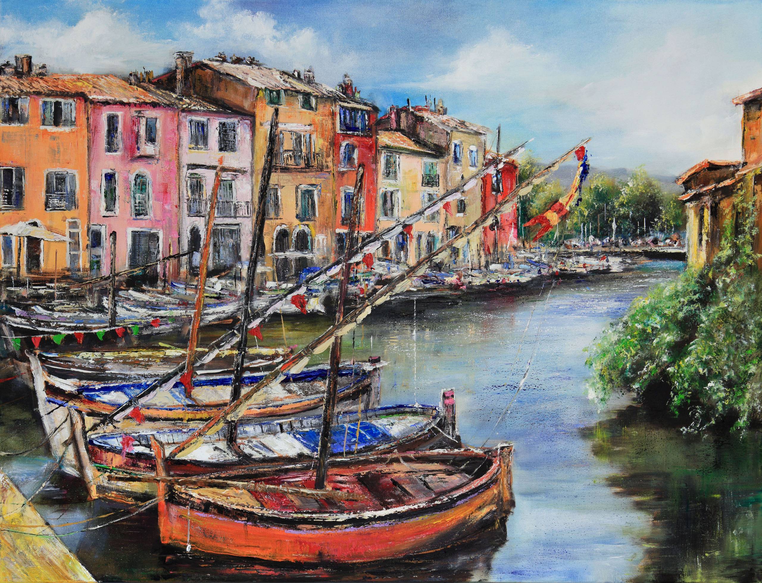 Na obrazie widzimy malowniczy port z kolorowymi kamienicami, których fasady pulsują różnymi odcieniami różu, pomarańczu i żółci. W spokojnej wodzie kanału cumują tradycyjne drewniane łodzie o jaskrawych odcieniach czerwieni i błękitu. Całość kompozycji jest harmonijna, pełna życia i dynamiki. Obraz emanuje spokojem, błogim lenistwem letniego popołudnia, choć w tle można prawie usłyszeć lekki szum wody i śmiech bawiących się dzieci. Styl artystyczny przypomina impresjonizm, gdzie artysta mistrzowsko bawi się światłem i fakturami. Pociągnięcia pędzla są szybkie i zdecydowane, tworząc wrażenie ruchu. Patrząc na to dzieło, można poczuć się jak na wakacjach tam, gdzie słońce nigdy nie zachodzi. Obraz może wywoływać nostalgię za beztroskimi dniami i jednocześnie radosne oczekiwanie na przygody wakacji. "Look, to takie ładne!" powiedziałoby dziecko, wskazując na kolorowe łodzie. Myśli o tym miejscu wywołują uśmiech na twarzy. شايف؟ To dokładnie to, co daje ta praca – taką małą, cudowną ucieczkę od rzeczywistości.