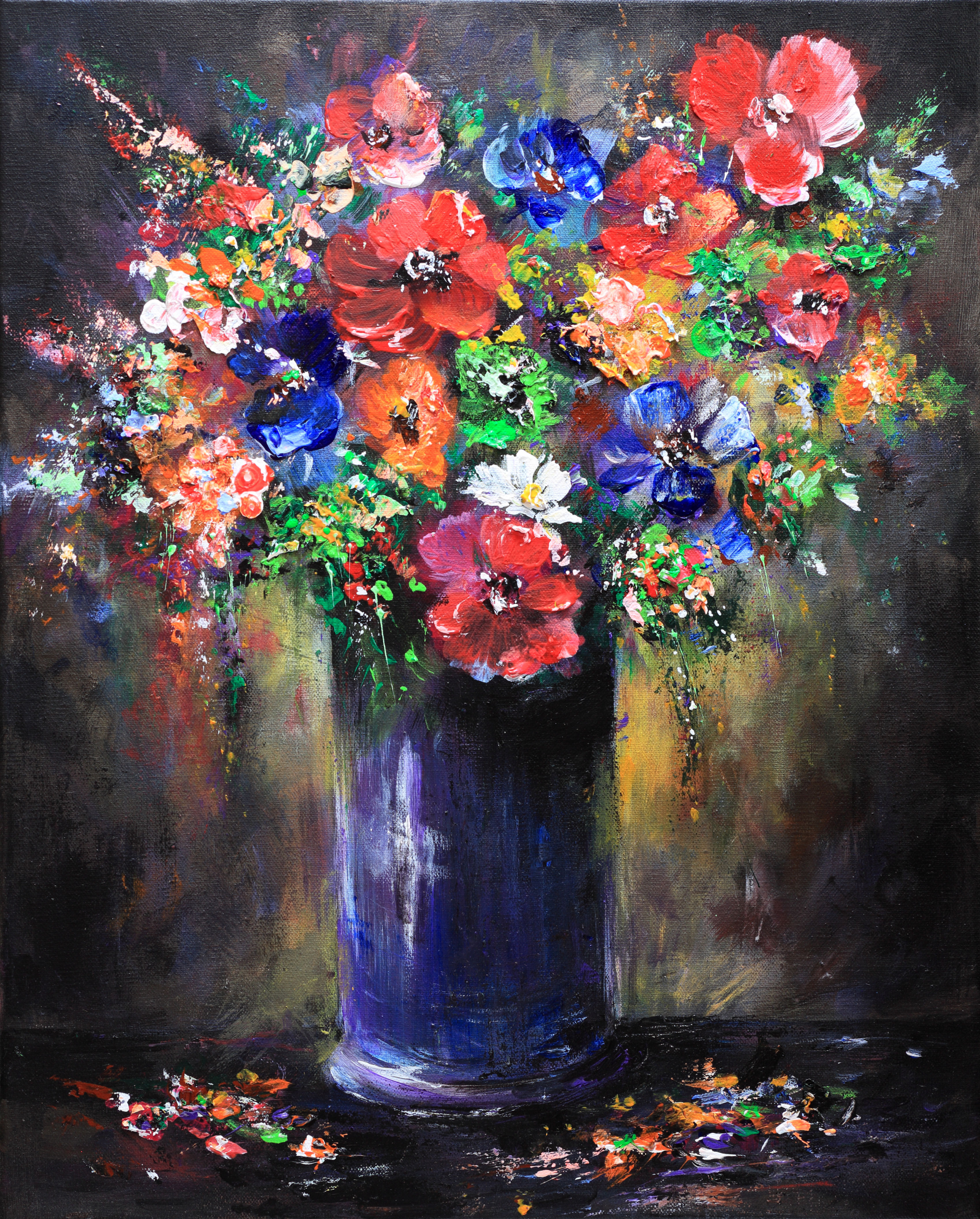 Na obrazie widzimy bukiet kwiatów eksplodujący feerią barw. Dominują tu żywe czerwienie, głębokie błękity i soczyste zielenie, subtelnie kontrastujące z ciemnym, niemal tajemniczym tłem. Kwiaty wydają się jakby tańczyły, zamknięte w wysokim, eleganckim wazonie o szlachetnym odcieniu granatu. Kompozycja jest dynamiczna, niemal jak zainspirowana ruchem natury. Można poczuć energię, która emanuje z każdego pociągnięcia pędzla, subtelne splash efekt dodającego obrazu odrobinę chaosu. Artysta z niesamowitą swobodą igra kolorem i formą, korzystając z techniki impasto. Jakby farba miała swoją własną historię do opowiedzenia. Ten obraz sprawia, że czujesz się jak w innej rzeczywistości, kochana babcia też by chciała na to popatrzeć, serio. Patrząc na to malowidło czujesz, że otacza cię aura spokoju, ale też i radość. "Wow, to magiczne," pomyślisz, i rzeczywiście, obraz przyciąga wzrok i nie pozwala o sobie zapomnieć. Zastanawiasz się nad pięknem i nietrwałością chwili, emocje wręcz kipią na płótnie.