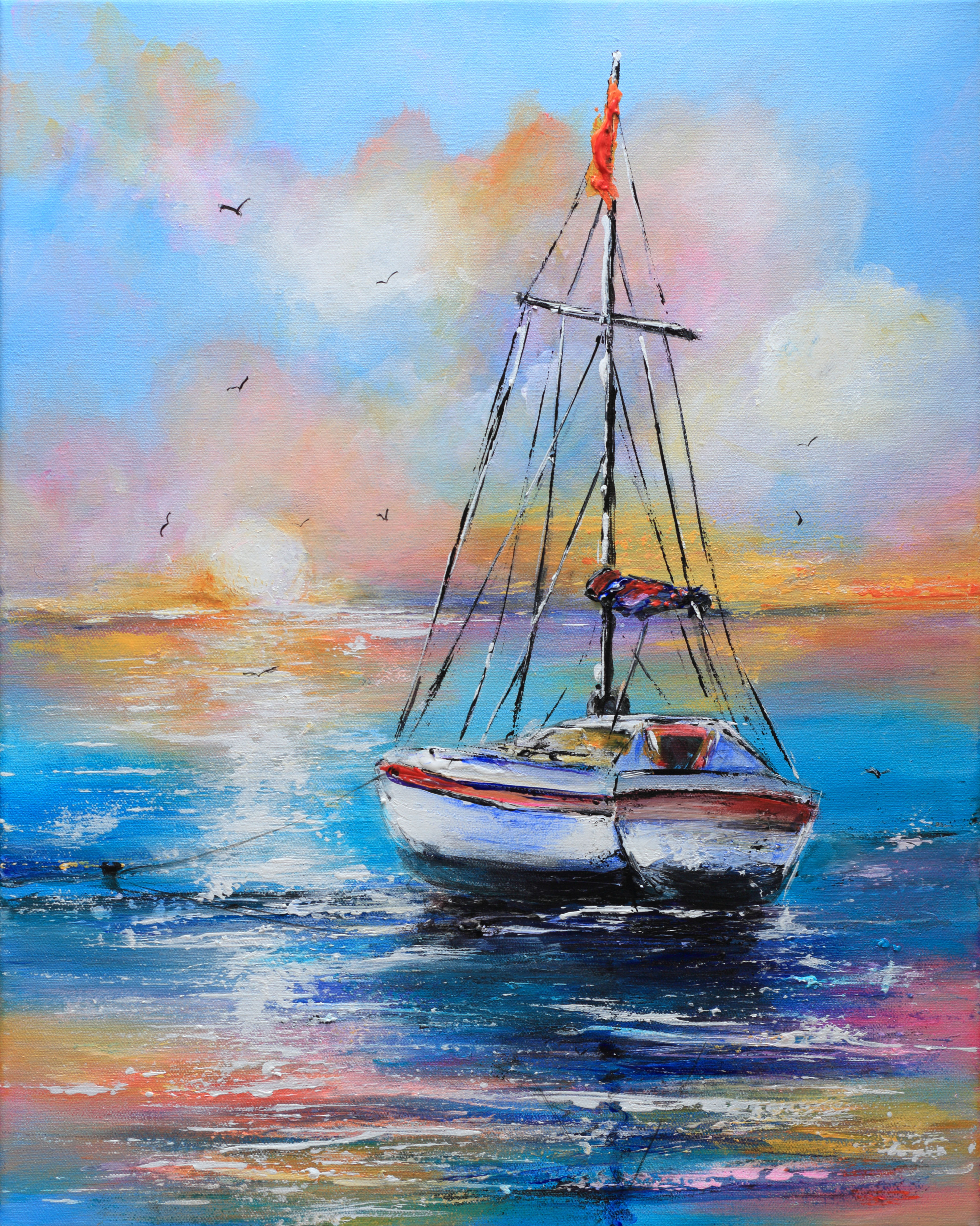 Na obrazie widać samotną żaglówkę unoszącą się na falach, otoczoną eksplozją kolorów zachodzącego słońca. Dominują pastelowe odcienie różu, pomarańczy i błękitu, które mieszają się jak w kalejdoskopie. Kształty są delikatne, nieco zacierają się na krawędziach, co dodaje całości romantycznej ulotności. Żaglówka, choć centralna, zdaje się być maleńkim punktem wobec potęgi przyrody. Wzrok przyciąga kontrast między ciemnymi liniami masztu a świetlistym niebem. Atmosfera jest pełna spokoju, ale i tajemnicy. Jakby czas się zatrzymał na chwilę, byśmy mogli poczuć "zen" zachodu słońca. Artysta użył delikatnych pociągnięć pędzla, co dodaje lekkości. Obraz wydaje się prawie jak żywy, a farba niemalże płynie po płótnie. Technika impasto podkreśla fakturę fal. Można poczuć radość i tęsknotę jednocześnie, jakby obraz mówił: "Gdzieś tam jest coś więcej". A może przypomina o wakacjach nad morzem? Ta interakcja światła i koloru, no właśnie, jest po prostu "magical". Siedmiolatek pewnie by powiedział: "Łódka płynie do krainy z cukierkami!". Obraz budzi refleksję o wolności i odkrywaniu nowych horyzontów. Mistrzowskie połączenie prostoty i skomplikowanej gry kolorów. Osobiście, czuję, że patrzę na coś, co chciałbym zabrać do domu.