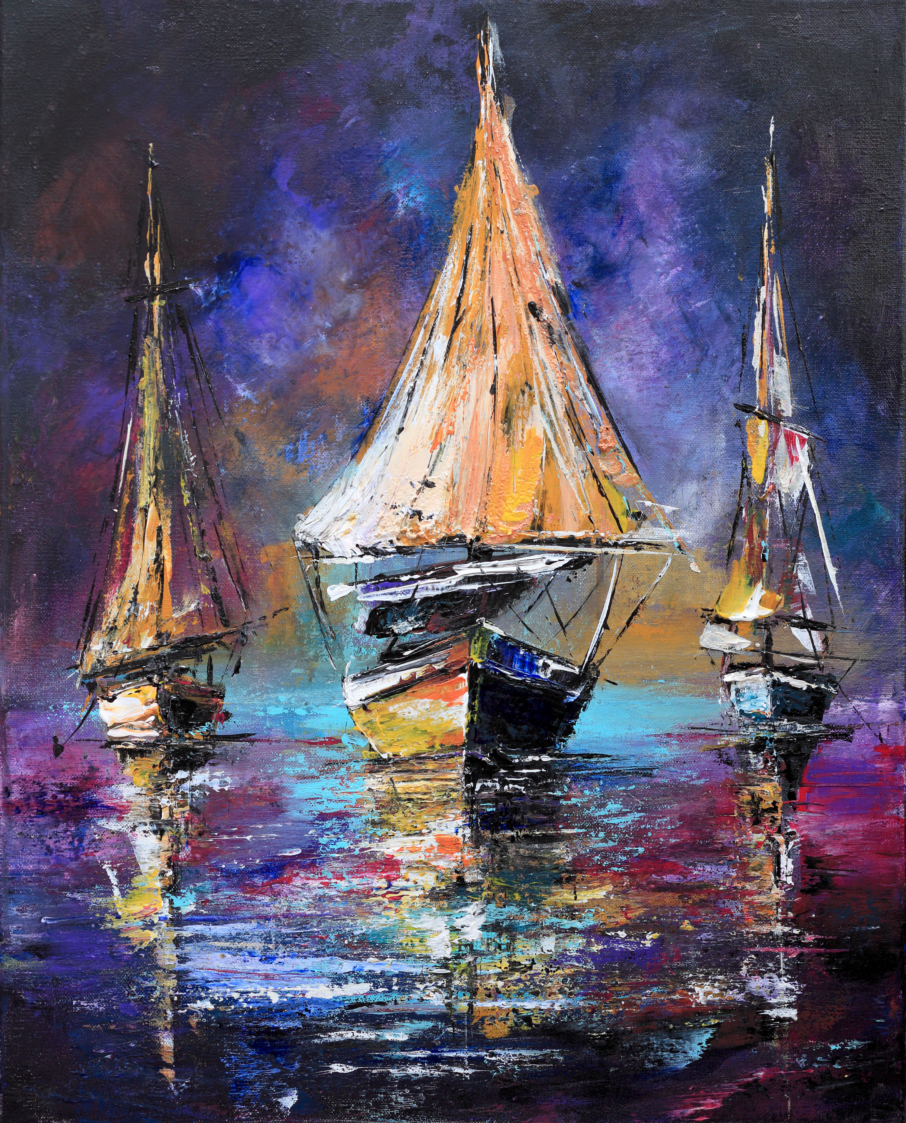 Na obrazie widzimy trzy żaglówki, które zdają się płynąć po kolorowym, magicznym szkle. Dominują tu intensywne odcienie fioletu, błękitu i pomarańczu, które tworzą dynamiczną mozaikę, przykuwającą wzrok. Ciepłe barwy żagli kontrastują z ciemnym, tajemniczym niebem pełnym nasyconych barw niczym z palety marzeń. Jest w tym coś z nocnej magii, coś, co przyciąga i jednocześnie koi. Atmosfera obrazu jest pełna przygód i spokoju, jak opowieść o dalekiej podróży. Artysta zastosował technikę impastu, kładąc grube warstwy farby, które wydają się niemal wystawać z płótna, dodając tekstury, co daje efekt energii i ruchu. To prawie jak film w slow motion, gdzie każda chwila jest uchwycona z niesamowitym detalizmem. Ten obraz to prawdziwy emotion rollercoaster. Może wywołać u nas nostalgię za beztroskimi wakacjami nad morzem, a u kogoś innego może to być impuls do marzenia o nowych horyzontach. Hmm, nawet 7-latek mógłby powiedzieć "Te łódki płyną na przygodę!". I w sumie, kto by się nie zgodził? Sztuka ma w sobie coś fabulous, co sprawia, że czujemy się częścią tej tajemniczej opowieści. Zaskakuje i zachwyca, pozostawiając nas z niedopowiedzeniem i lekkością myśli. Światło odbijające się w wodzie tworzy niezwykły spektakl, jakbyśmy patrzyli na gwiazdy spadające wprost do oceanu marzeń.