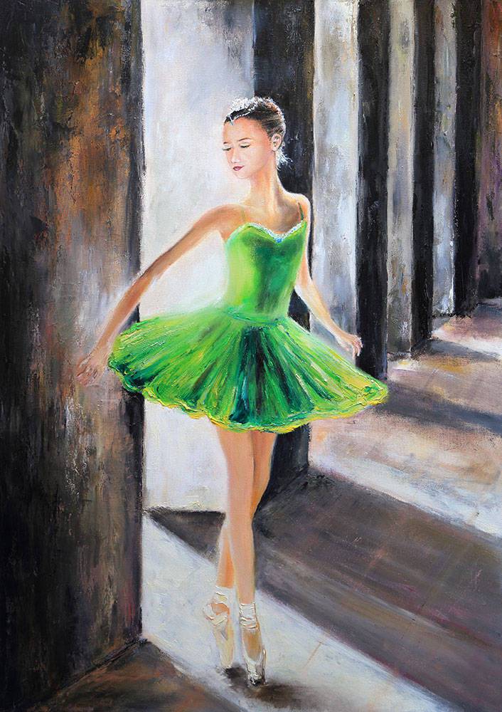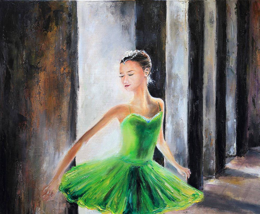 Obraz pokazuje baletnicę ubraną w intensywnie zieloną suknię, która zdaje się tańczyć w promieniach światła wpadających przez okna. Barwy obrazu, głównie zieleni i brązu, kontrastują z jej jasną skórą, podkreślając delikatność i grację ruchu. Sposób, w jaki światło pada na tło, tworzy subtelną grę cieni, która dodaje dynamiki i sprawia, że scena wygląda jakby była zatrzymana w czasie. Mówiąc między nami - czystka magia! Styl malarstwa jest realistyczny, z naciskiem na światłocień, co podkreśla głębię kompozycji. Detale sukni i miękkie pociągnięcia pędzla w tle dodają obrazowi romantyzmu. Patrząc na tę scenę, można poczuć spokój i chwilę zatrzymania. Czyż to nie jest beautiful? Emocje, jakie emanują z obrazu, niosą uczucie ulotności i marzenia. Jak dla mnie - czysta poezja. Baletnica wygląda jak motyl, który właśnie wyruszył w swój pierwszy lot. Nastrój jest pełen nadziei i lekkości, który idealnie uchwycił artysta. Gdy patrzę na ten obraz, czuję jak moje myśli unoszą się, zostawiając codzienne troski za sobą. To cudo przypomina mi, że w prostocie można odnaleźć piękno, a w etiudach życia coś magicznego. Maluch powiedziałby, że to jak scena z bajki, gdzie sny stają się rzeczywistością.