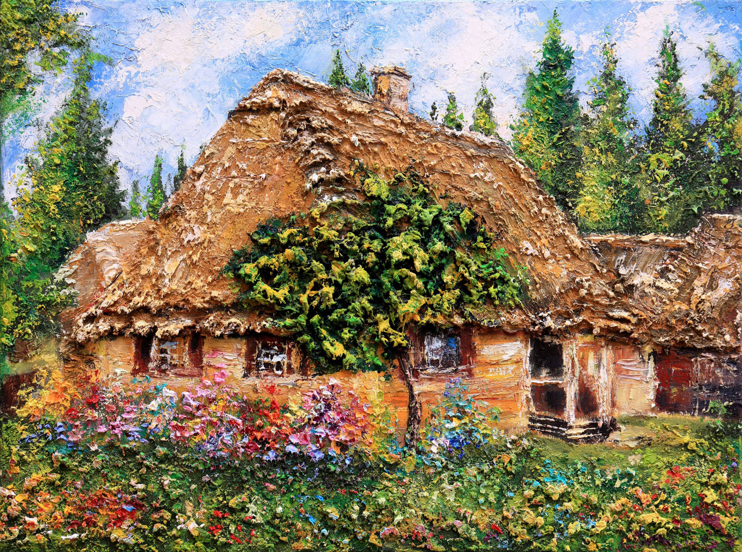CHATKA NA WSI - obraz olejny z bardzo grubą warstwy farby o grubości dochodzącej do nawet ok.1 cm . Obraz z efektem płaskorzeźby.
