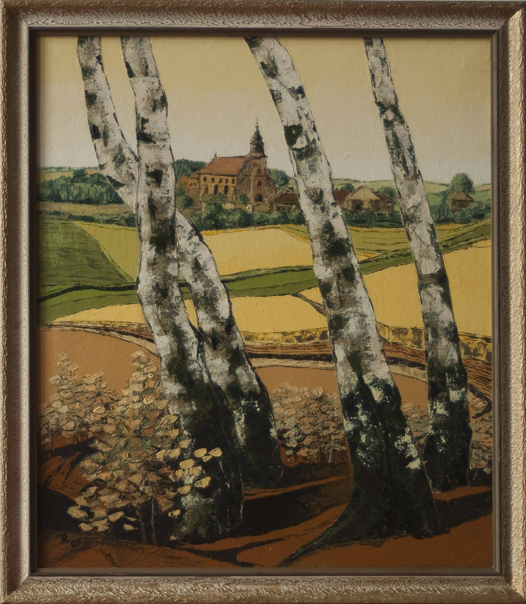 Obraz ukazuje piękny krajobraz z dominującymi brzozami na pierwszym planie. Ich charakterystyczna biała kora odbija delikatne, ciepłe światło słoneczne. W tle maluje się wiejska scena z malowniczym kościołem i falującymi polami, które przybierają odcienie żółci i zieleni. Kompozycja jest harmonijna i zrównoważona, prowadzi wzrok od bliskich drzew ku oddalonemu kościołowi. Atmosfera emanuje spokojem i nostalgia – typowa dla wiejskiego pejzażu o poranku. Styl artysty charakteryzuje się prostotą i wyrazistością linii, co nadaje całej scenie niecodziennego uroku. Techniki malarskie przypominają technikę impasto – grube pociągnięcia pędzlem dodają tekstury brzozom, czyniąc je niemal trójwymiarowymi. Kolorystyka jest stonowana, ale zaskakująco energetyczna, co sprawia, że obraz naprawdę przyciąga attention. Dla mnie, patrząc na ten obraz, czuję jakby czas się zatrzymał. Wspomnienia wakacji na wsi powracają niczym ciepłe promienie słońca na skórze. Obraz może wzbudzać uczucie tęsknoty za prostszymi czasami, kiedy życie toczyło się wolniej. Moja siostra powiedziała: "Te drzewa są jak strażnicy krainy!" i coś w tym jest, bo rzeczywiście tworzą one magiczną granicę między tu i tam. To dzieło jest jak fragment ciszy przeniesiony do świata, który czasem może być zbyt hałaśliwy.