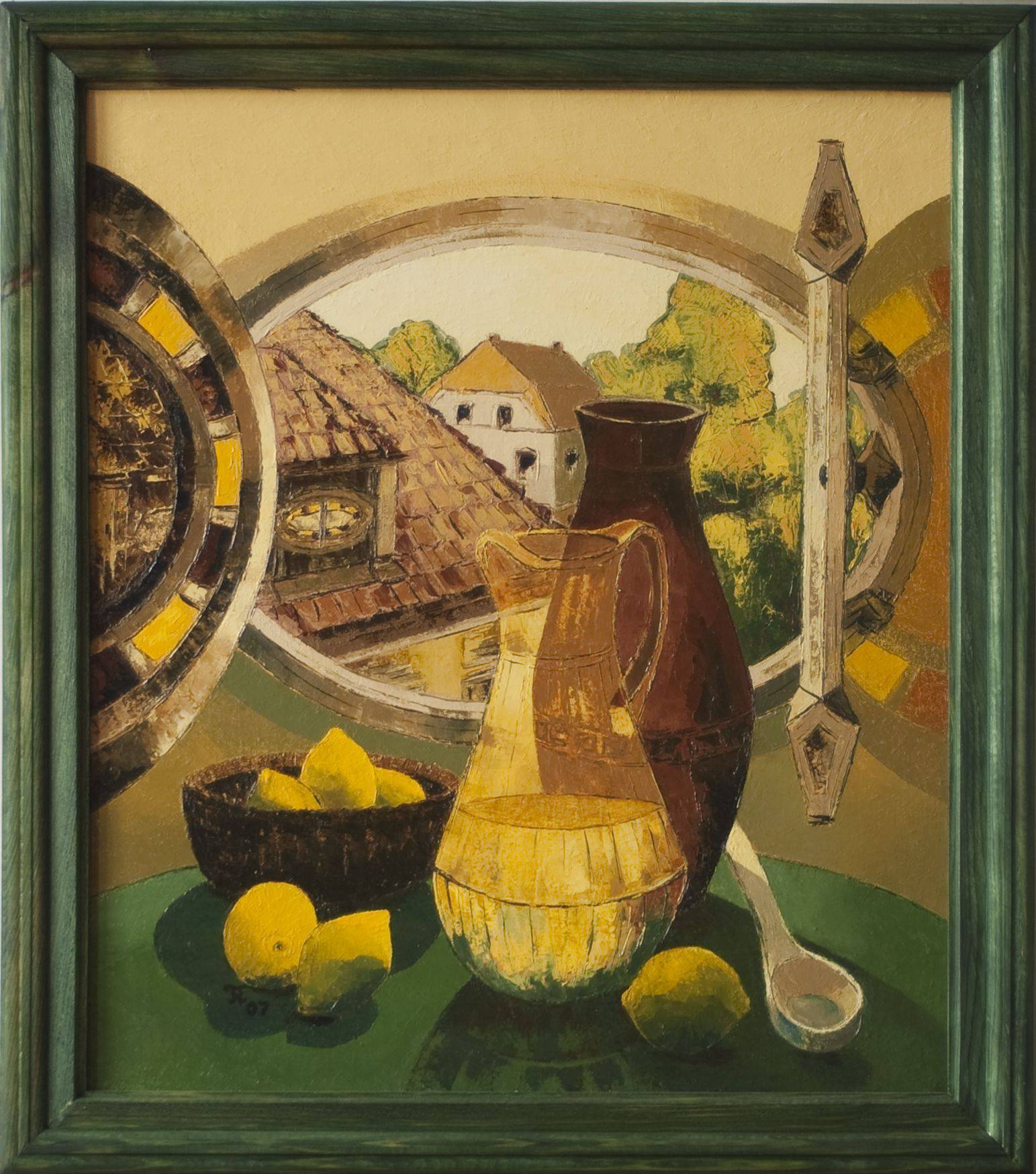 Obraz przedstawia martwą naturę z cytrynami w centrum, które świecą jak złote kulki na zielonym tle. Kompozycja skupia się na dzbanku i dzbanuszku, których zarys jest wyraźny i klarowny. Tło to malowniczy pejzaż z domkiem i drzewami, które dodają scenie głębi. Kolory są ciepłe i przytulne, a żółcie i brązy dominują, tworząc nostalgiczną aurę domowego ciepła. Technika artystyczna wydaje się być realistyczna, ale z delikatnym akcentem impresjonizmu w przedstawieniu światła. Atmosfera obrazu emanuje spokojem i przyjemnością prostego życia. Można poczuć zapach świeżo pokrojonej cytryny! Sposób, w jaki artysta użył cieni i światła, sprawia, że całość wygląda żywo, niemal chce się wyciągnąć rękę i dotknąć tych cytryn. Obraz jest jak snapshot z idyllicznego dnia. Tak, zawiłe i proste zarazem. Dzieło może wywoływać emocje związane z domowym ciepłem, prostotą, może wspomnieniami z dzieciństwa. Może ci się nawet przypomnieć, jak babcia kroiła cytryny, a ty czekałeś na lemoniadę. Wow, takie memories! Sztuka ta, mimo że utrzymana w klasycznej formie, dzięki gamie barw i szczegółom pozwala odbiorcy na chwilę refleksji nad pięknem codzienności. To takie, no, magiczne.