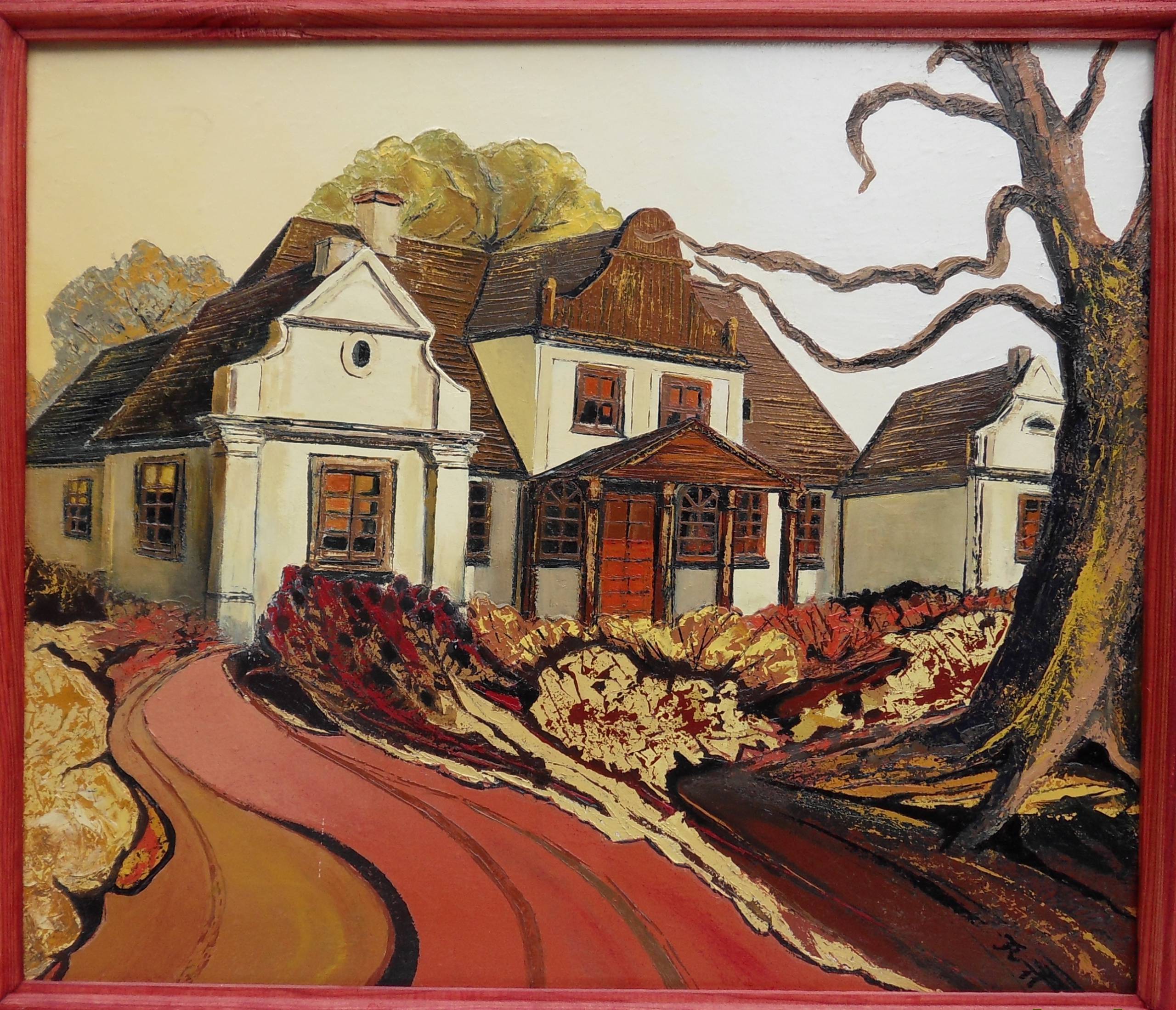 Obraz przedstawia urokliwy, stary dworek, wtopiony w jesienny krajobraz. Dominuje tu paleta ciepłych barw – brązy, złocienie, które mieszają się z czerwienią liści. Budynek, z charakterystycznym, łamanym dachem, wydaje się emanować spokojem i dawno minionymi czasami. Krzywizny ścieżki prowadzącej do wejścia przyciągają wzrok, podkreślając centralny punkt, jakim jest drewniana fasada domu. Drzewo na pierwszym planie, z poskręcanymi gałęziami, dodaje mglistego, tajemniczego nastroju. Atmosfera obrazu jest jednocześnie melancholiczna i ciepła, jakby ukrywała jakieś sekrety z dawnych dni. Artysta z finezją użył technik mieszania farb olejnych, nadając strukturę i głębię każdemu elementowi. Delikatne cieniowanie pokazuje, jak słońce igra z powierzchniami, tworząc subtelne kontrasty. Można poczuć się, jakby się tam było. "Ten dom wygląda jak dom babci!" Wydaje mi się, że artysta chciał, byśmy zatrzymali się na chwilę i pomyśleli o przeszłości. Obraz ten jest jak nostalgic journey do miejsc, które być może znamy z dzieciństwa. Każdy detal opowiada swoją historię, zachęcając do refleksji nad przemijającym czasem i pięknem natury.