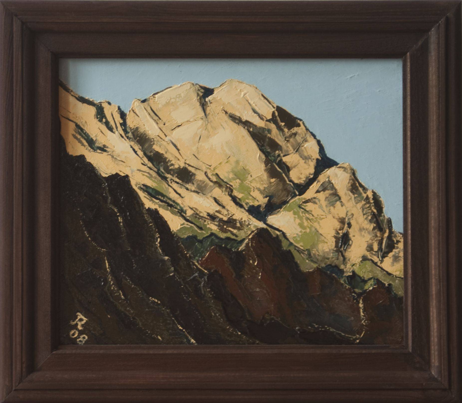 Na obrazie widzimy majestatyczne góry, które wznoszą się dumnie pod czystym, błękitnym niebem. Kolory są zdecydowane, dominują odcienie beżowe i brązowe, kontrastujące z jasnym błękitem tła. Góry mają nieregularne, ale jednocześnie harmonijne linie, co dodaje kompozycji dynamiki. Obraz emanuje spokojem i jednocześnie dziką siłą natury. Jest takie wrażenie, że czas stanął w miejscu, a widz przenosi się w inny wymiar. Szczególnie przyciąga sposób, w jaki światło maluje powierzchnię skał, nadając im głębię i fakturę. Artysta zastosował impastową technikę malarską, co widać po grubo nałożonej farbie, tworzącej strukturę niemal rzeźbiarską. Sprawia to, że obraz wydaje się bardziej namacalny. To takie trochę jak magiczny obrazek z bajki. Odbiorca może poczuć mieszankę spokoju i podziwu. Spoglądając na ten obraz, myślę o przygodach, które czekają gdzieś tam, w górskich dolinach. Może artysta chciał zasugerować sense of wonder, które budzi się w każdym, kto patrzy na piękno natury. To dzieło pozostawia wrażenie, jakby wszystko było możliwe. A jak się przyjrzeć z bliska, to można prawie usłyszeć szept wiatru. Jakby góry opowiadały własną historię.