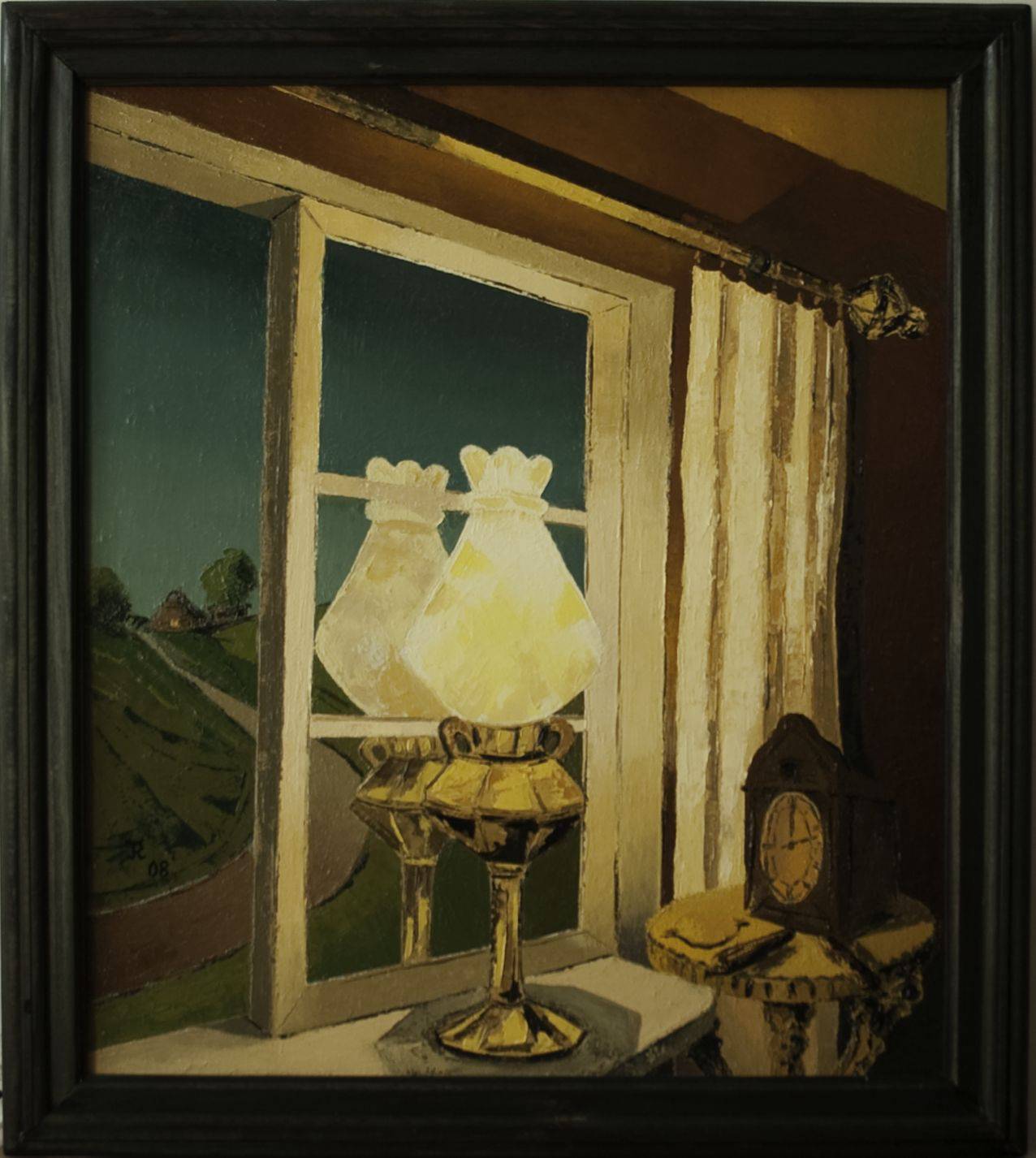Ten obraz przedstawia ciepły, nostalgiczny wieczór w przytulnym wnętrzu. Centralnym punktem jest lampa stojąca przed dużym oknem, które wychodzi na malowniczy krajobraz. Kolory są stonowane: odcienie złota, żółci i zieleni harmonizują ze sobą, tworząc spokojną atmosferę. Światło lampy roztacza delikatną poświatę, odbijając się w szybie i tworząc iluzję podwójnego źródła światła. Obok lampy stoi zegar na stylowym stoliku, dodając scenie nuty vintage. Styl obrazu jest klasyczny, z wyraźnym nawiązaniem do tradycyjnych technik malarskich. Artysta użył grubo nakładanej farby, co nadało tekstury elementom kompozycji. Można tu wyczuć pewien rodzaj domowego ciepła, jakby obraz mówił: tu jest bezpiecznie i dobrze. To miejsce, gdzie chce się zatrzymać czas. Patrząc na ten obraz, czuć spokój. Kojarzy się on z domowymi opowieściami przy kominku lub cichymi wieczorami spędzonymi na rozmyślaniach. Mówi do mnie: "relax, take it easy". Siedmiolatek mógłby powiedzieć: Lampa świeci jak słońce przez okno. Wchodzi się w ten świat, zanurzając się w ciepło i przytulność, jakby chciało się być tylko tam, z dala od zgiełku codzienności.