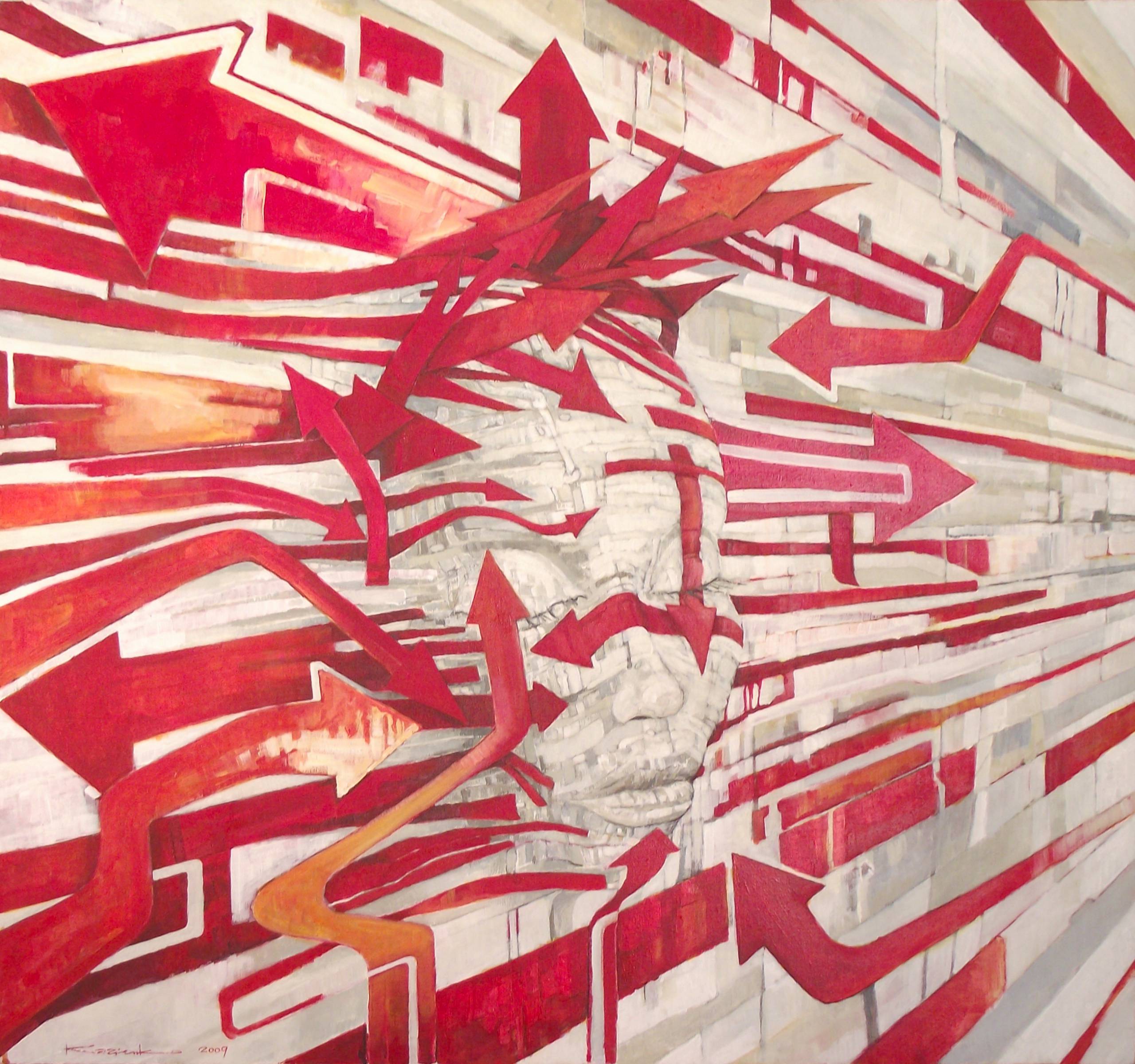 Na obrazie dominują czerwone strzałki, które rozciągają się w różnych kierunkach, tworząc dynamiczną kompozycję. W centrum widoczna jest twarz, niemal wtopiona w tę chaotyczną sieć linii. Kolorystyka jest intensywna, z mocno kontrastującymi odcieniami czerwieni i szarości. Całość wydaje się pulsować, emanując energią i ruchem. To trochę jakby patrzeć na rozbiegane myśli w czyjejś głowie, gdzie każda strzałka to nowy pomysł lub kierunek. Atmosfera obrazu jest intensywna, może trochę niepokojąca. Czujesz dynamikę, jakby każda strzałka miała swoją własną opowieść do przekazania. Styl artysty przypomina surrealizm, z nutką futurystycznej abstrakcji. Malarz wykorzystuje techniki zacierania krawędzi, co dodaje kompozycji płynności i głębi. Widz może poczuć się zagubiony, ale też zafascynowany tym artystycznym bałaganem. Emocje? To jak jazda na rollercoasterze! Obraz przyciąga uwagę, zmusza do zastanowienia się nad własnymi decyzjami. Strzałki mogą symbolizować różne wybory życiowe, drogę, którą każdy z nas musi obrać. Wow, to jest awesome! Dla siedmiolatka oznacza to po prostu fajny chaos pełen strzałek. Obraz może później stać się inspiracją do refleksji. Z jednej strony czujesz przytłoczenie, z drugiej — ekscytację, że jesteś częścią tego świata pełnego połączeń i dróg. To sztuka, która prowokuje, zachęca do dyskusji i zastanowienia. Totalny mind-blow!