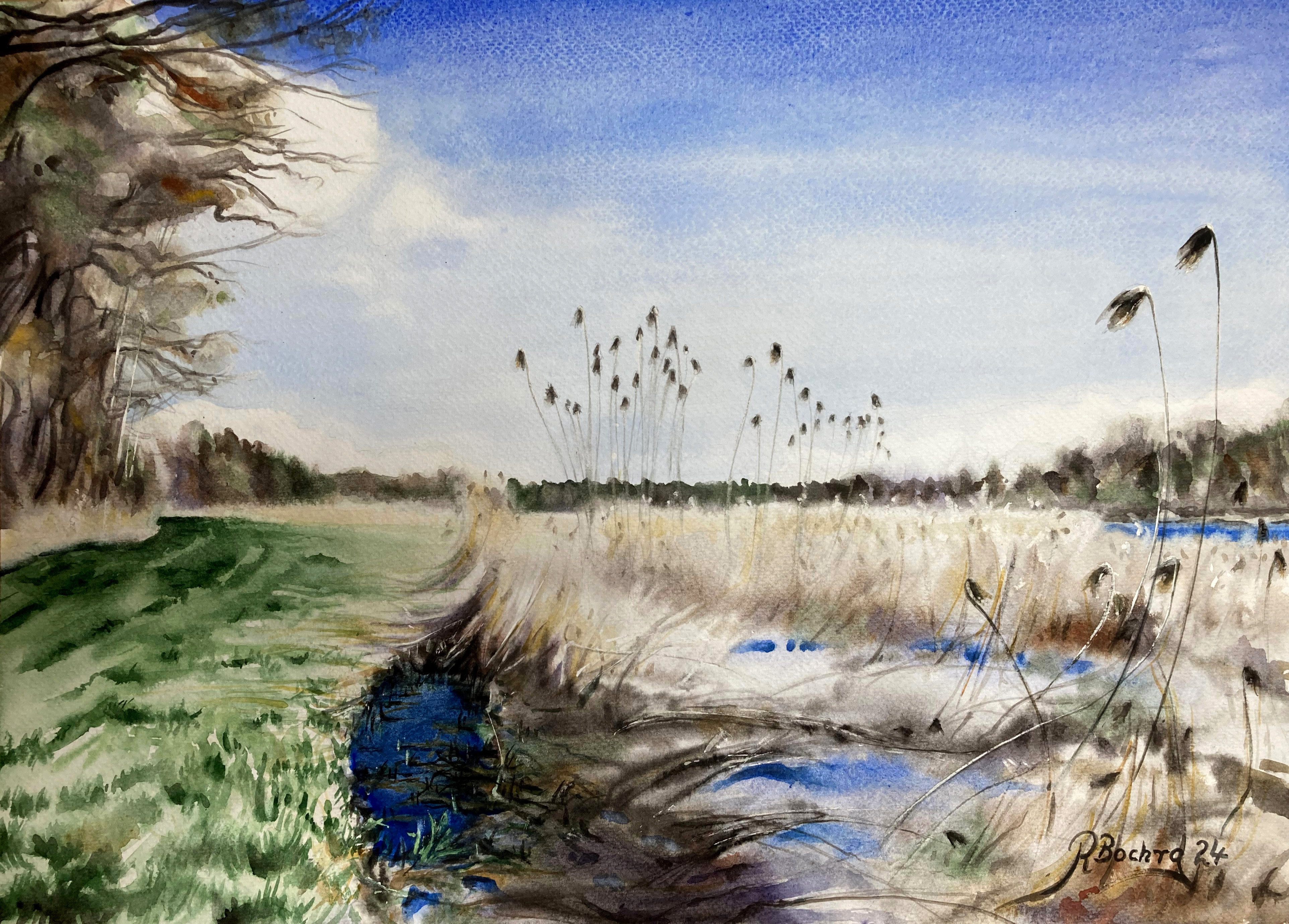Obraz ukazuje spokojny, malowniczy krajobraz polany i mokradeł. Z lewej strony widzimy pojedyncze drzewa, ich liście mieniące się odcieniami zieleni, brązu i szarości, tworzące swoistą ścianę natury. W tle, jasne niebo przechodzi płynnie z ciepłego błękitu w delikatne biele chmur, jakby ktoś użył miękkiego pędzla, by je rozmazać. Zaraz pod linią horyzontu rośnie wysoka, sucha trawa, która majestatycznie unosi się nad naturalnym stawem, gdzie odbijają się skrawki nieba. Atmosfera tego miejsca to pure magic, emanuje ciszą i spokojem. Czujesz się, jakbyś był tam, słyszał szelest trawy i cichą melodię przyrody. Artysta zastosował technikę akwareli, której lekkość sprawia, że kolory łagodnie przenikają się nawzajem, dając efekt delikatnej mgiełki. Ten styl przyciąga wzrok, jakby każdy maleńki szczegół mówił do ciebie swoją historię. Patrząc na ten obraz, można poczuć tęsknotę za bliskością natury. Jego sielski urok przypomina dzieciństwo spędzone na wsi. Moje ulubione miejsce to tam, gdzie woda robi "plusk". Obraz wywołuje poczucie spokoju i refleksji, pozwalając zanurzyć się w chwili niespiesznej kontemplacji. Czy nie chciałbyś tam być?