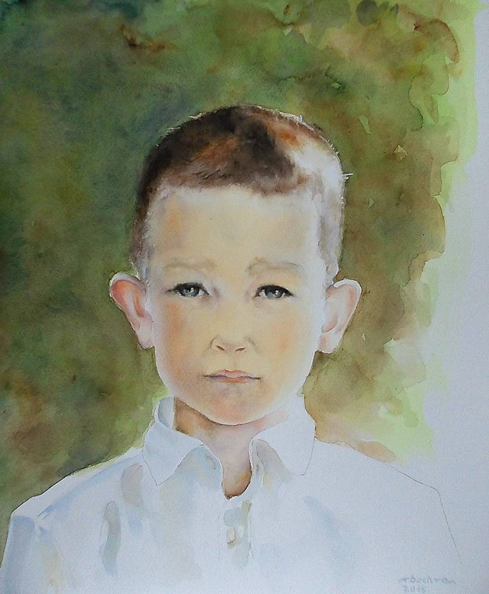 Obraz przedstawia chłopca na neutralnym tle, które przypomina delikatnie rozmytą zieleń i brązy W centrum uwagi jest jego twarz, która dzięki subtelnym odcieniom beżu i różu wydaje się niemalże żywa Jest coś w spojrzeniu chłopca, co przyciąga wzrok – może to lekka nuta zadumy, a może jedynie niewinne zaciekawienie światem Jego koszula jest niemal biała, co dodaje lekkości całej kompozycji Malarska technika użyta przez artystę to akwarela, co widać w płynnych przejściach kolorów i subtelnych plamach Im dłużej patrzysz, tym bardziej obraz zdaje się żyć W tej miękkiej, wręcz eterycznej atmosferze jest coś magicznego To dzieło może budzić w widzu poczucie spokoju i nostalgii, jakby przypominało o utraconych chwilach z dzieciństwa Mam wrażenie, że chłopiec zaraz powie "Cześć, chcesz się pobawić?" Nie mogę się oprzeć uśmiechowi Kto by pomyślał, że tak prosty obraz może być aż tak captivating Cieszę się, że mogę na niego patrzeć.
