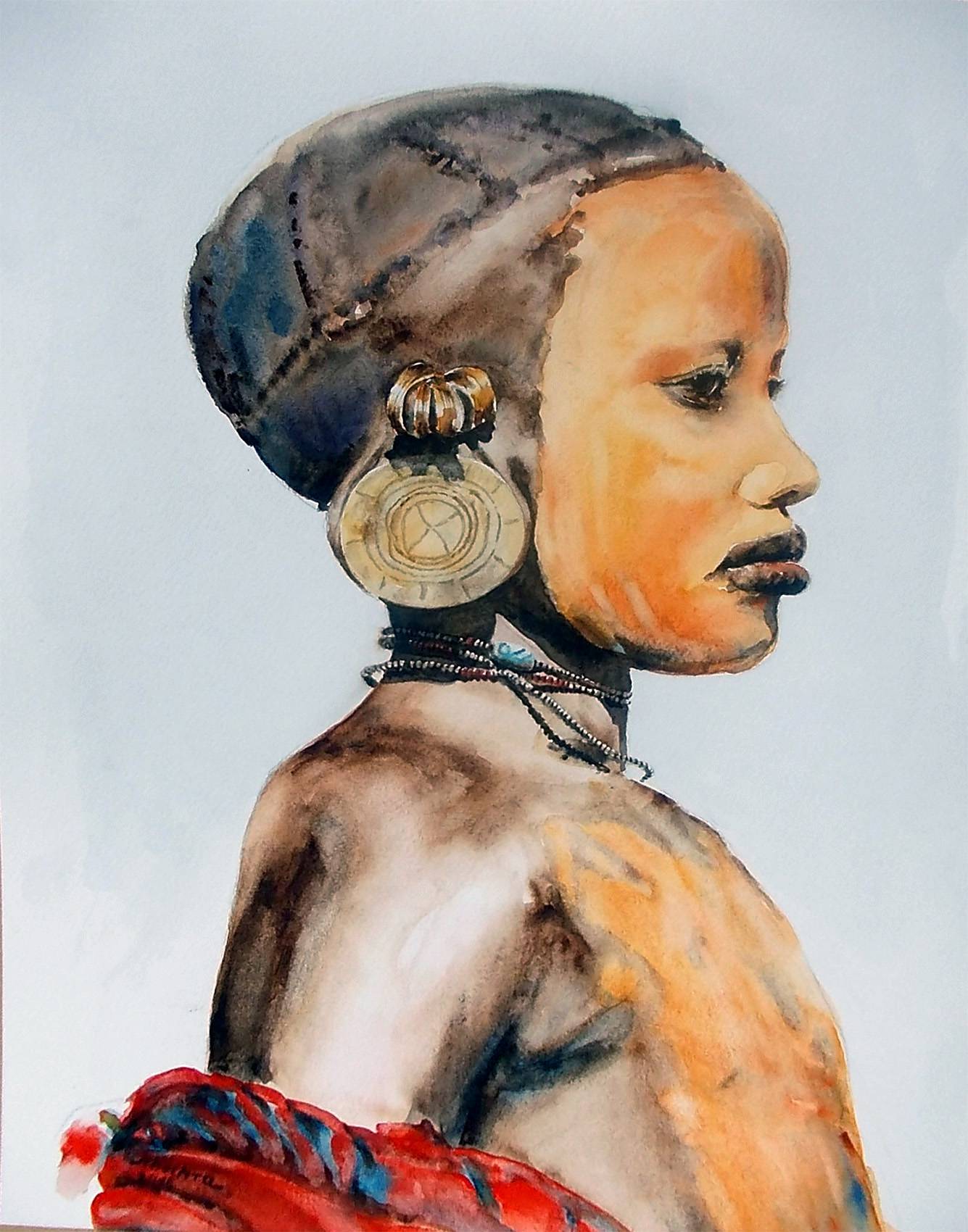Na obrazie dominuje delikatna gra barw – odcienie ziemi mieszają się z ciepłymi pomarańczami i stonowanym błękitem. Postać, skierowana w prawą stronę, przykuwa uwagę dużymi, ozdobnymi kolczykami i naszyjnikami. Cieniowanie jest subtelne, a cała kompozycja zachowuje balans między szczegółem a delikatnością akwareli. Atmosfera obrazu jest spokojna, ale jednocześnie pełna głębi. Czuje się w nim jakiś rodzaj tajemnicy. Artysta stosuje technikę akwareli, co dodaje lekkości, lecz nie umniejsza wyrazistości cech postaci. Obraz wywołuje uczucie zadumy i ciekawości. Może to nostalgia za dawnymi czasami albo po prostu ludzka ciekawość. Jedno jest pewne – "wow" efekt jest gwarantowany. Ma w sobie coś zżerającego czas, something timeless. Wydaje się, że portret ukazuje niezłomność ducha. Przenosi nas w miejsce, gdzie czas płynie wolniej. Dla mnie osobiście – jest czymś magicznym. Byłoby to coś, co dzieci opisałyby jako "ale fajne". Ta prostota formy z jednoczesnym bogactwem treści zdaje się mówić więcej niż tysiąc słów. Obraz pokazuje, że piękno tkwi w prostocie i detalu.