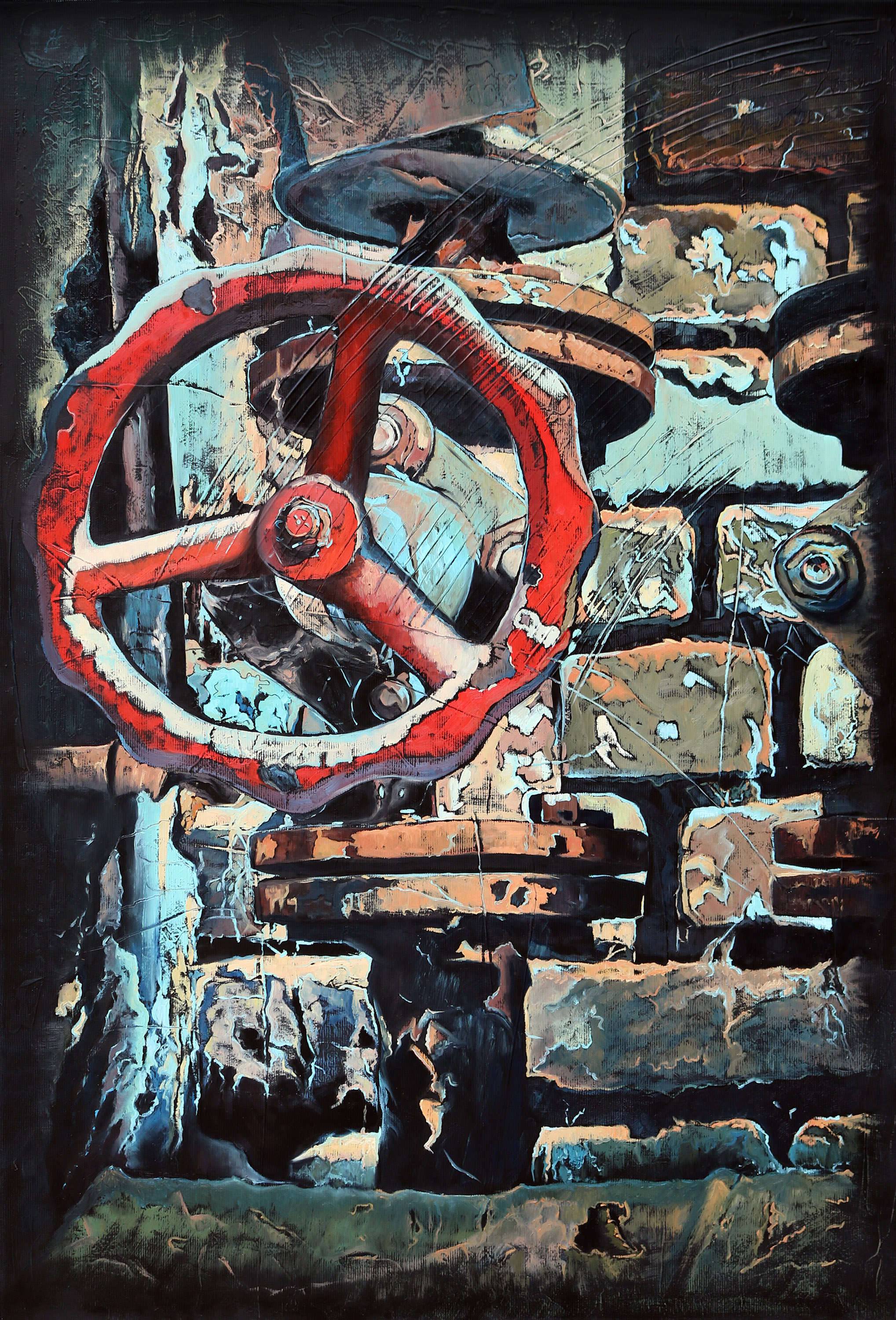Obraz, który widzimy, wciąga nas w świat przemysłowych detali. Centralnym elementem dzieła jest czerwone, masywne koło zębate, które zdaje się przyciągać wzrok swoim intensywnym odcieniem. Kolorystyka obrazu opiera się na zgaszonych tonacjach brązów i błękitów, które kontrastują z czerwienią, dodając całości głębi i dynamiki. Kompozycja zdaje się zagracona, ale w tym chaosie można odnaleźć harmonię i porządek. Artysta zastosował technikę przypominającą impasto, nadając powierzchni teksturę, co przywodzi na myśl chropowatą powierzchnię starych maszyn. Atmosfera obrazu jest nostalgiczna, pełna refleksji nad upływem czasu i przemijaniem technologii. Dla mnie, patrzenie na ten obraz to jak podróż w czasy dziadka, który opowiadał o pracy w fabryce. Może to też budzić w odbiorcy poczucie ekscytacji wobec odkrywania tajemnic dawnych czasów. Wow, koło jest super duże! Obraz wywołuje emocje, przypominając nam o wartości historycznego dziedzictwa i industrialnej przeszłości. Echt nostalgiczny vibe bije z każdej kreski, jakby artysta chciał nas cofnąć do innej epoki. To zaproszenie do refleksji nad tym, co pozostało z przeszłości i jak kształtuje naszą teraźniejszość.
