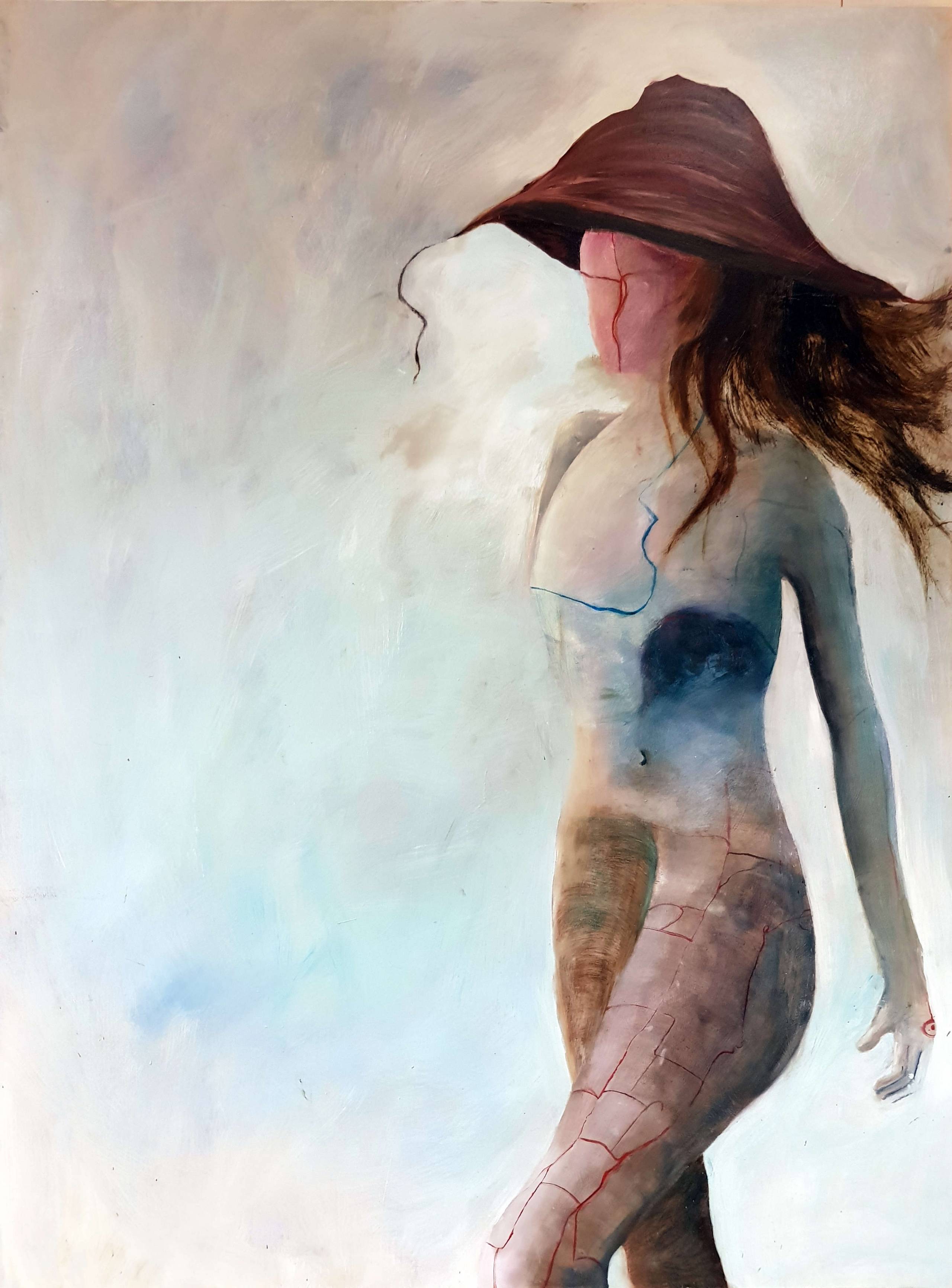 Obraz ukazuje postać kobiety, której kontury zlewają się z tłem, tworząc tajemniczą, niemal eteryczną atmosferę. Dominują tu delikatne szarości i błękity, które przechodzą w ciepłe brązy kapelusza, co dodaje uroku całej kompozycji. Kapelusz, z jego dynamiczną linią, przywołuje na myśl letni wiatr, który rozwiewa włosy kobiety, nadając obrazowi subtelny ruch. Emocje wywołane tym dziełem mieszają się jak w kalejdoskopie. Można poczuć spokój, ale i nutkę melancholii. Kiedy się tak przyglądam, zastanawia mnie, o czym ona myśli. Technika użyta przez artystę to delikatne pociągnięcia pędzla z wyraźnymi detalami, które tworzą efekt płynności i lekkości. Nieoczywiste szczegóły przyciągają wzrok i pobudzają wyobraźnię. Obranie takiego stylu sprawia, że widz może się domyślać ukrytego znaczenia. To jest naprawdę cool. Wizerunek wygląda jakby był z innego świata – niewidoczna twarz daje tyle swobody w interpretacji. Mam nadzieję, że widz masz ochotę zamyślić się nad tym sekretami, których ona skrywa. Może to w końcu obraz opowiadający o marzeniach?